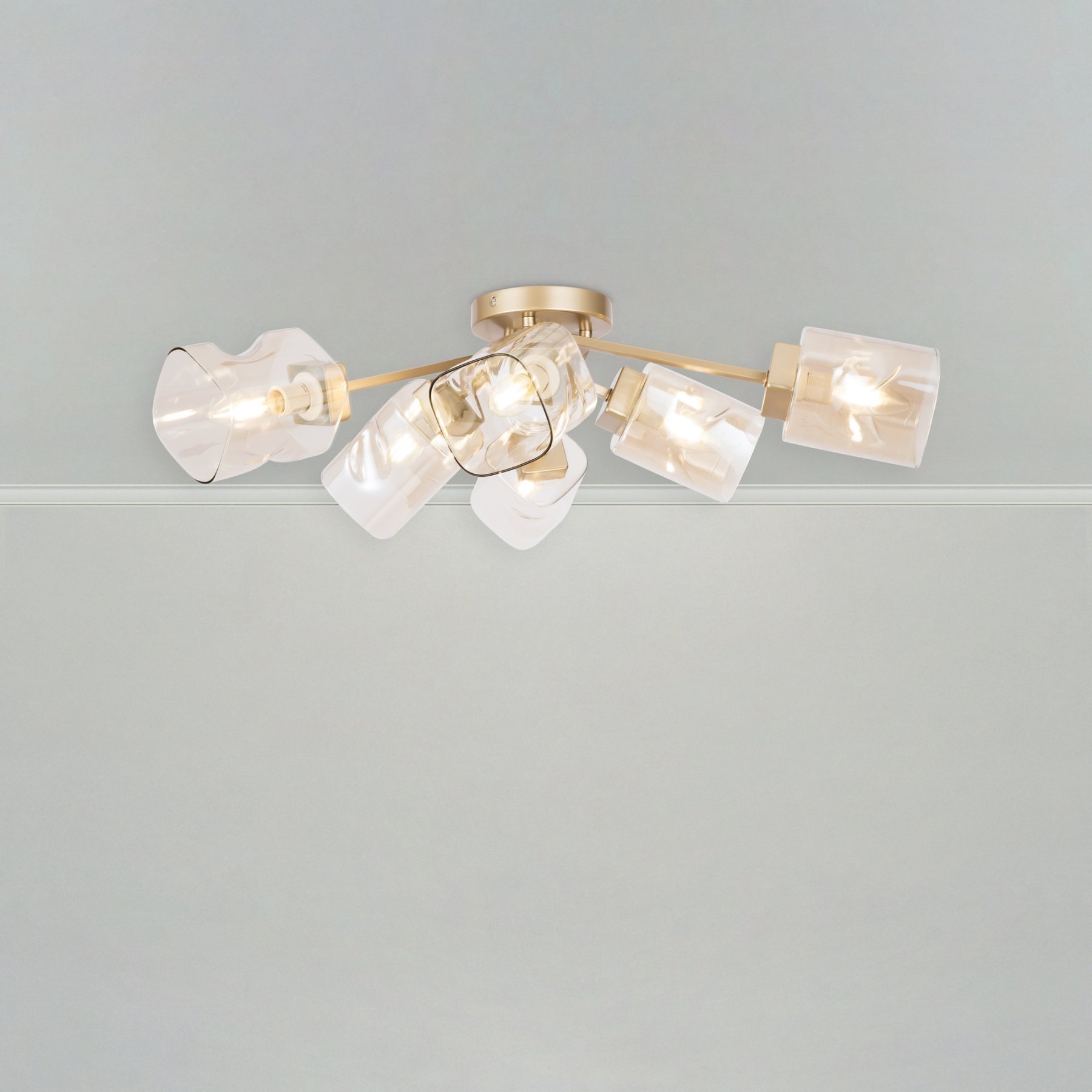 Серия Isabella – прекрасный вариант для современных интерьеров в теплой цветовой гамме. Арматура цвета матового золота выполнена из металла, а плафоны необычной формы – из янтарного стекла. Благодаря небольшой высоте потолочные светильники Isabella можно использовать в помещениях с невысокими потолками. Широкая линейка включает 3 потолочных светильника на 8, 6 и 4 рожка, а также бра.