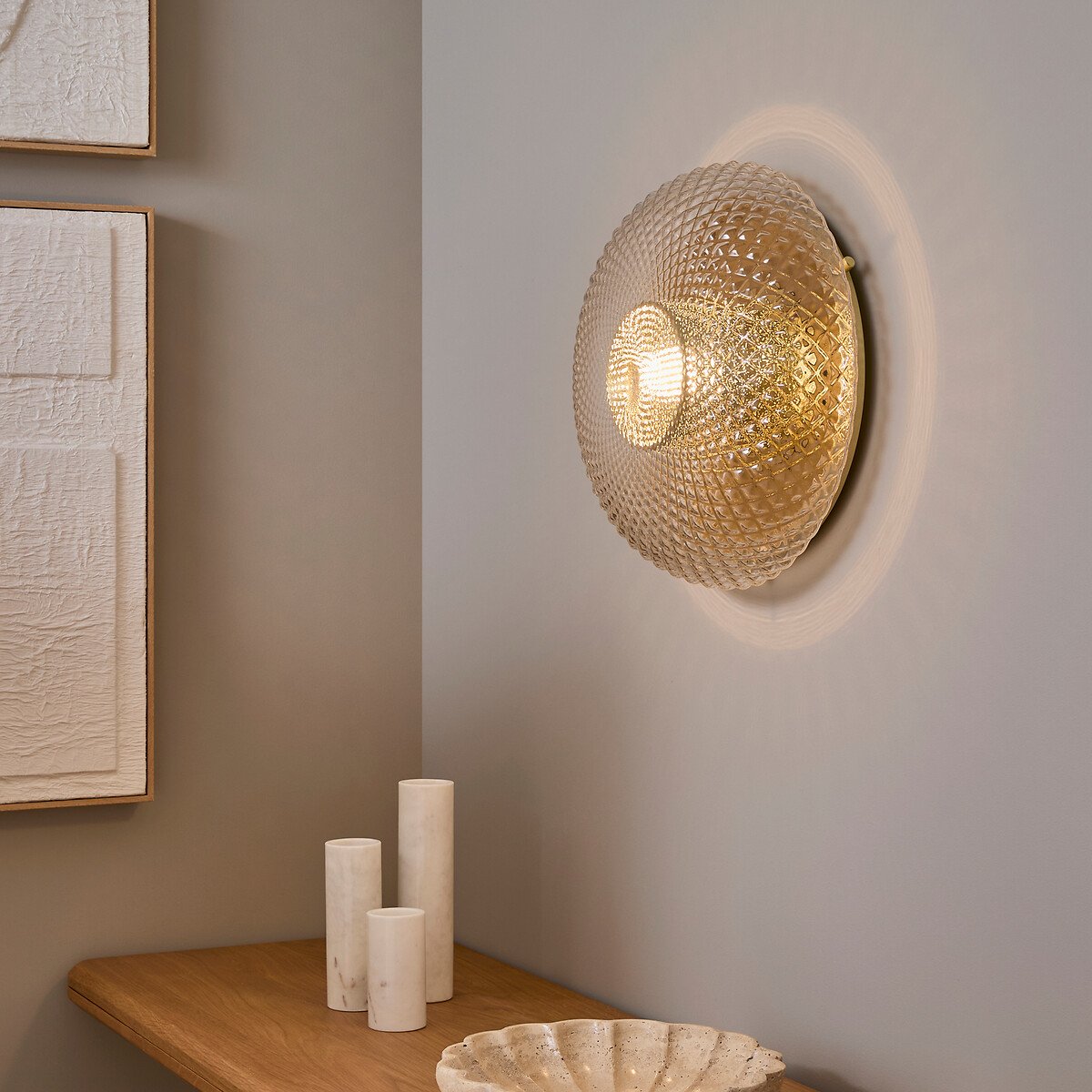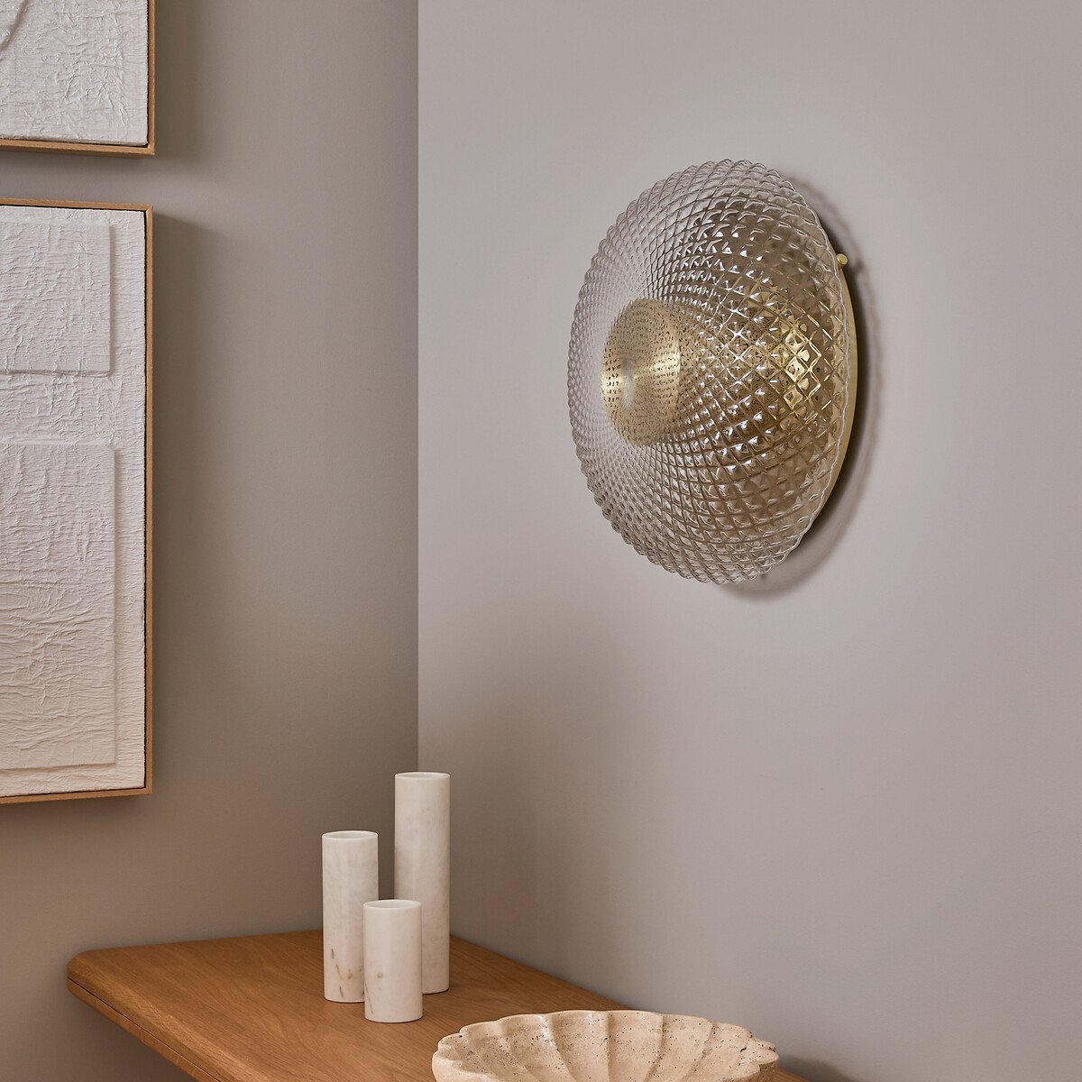 Сочетание матовой латуни и резного стекла навеяно движением ар-деко, где элегантность линий подчеркивала благородство материалов. Диффузор из перфорированного металла и стеклянная сфера распространяют рассеянный мягкий свет.