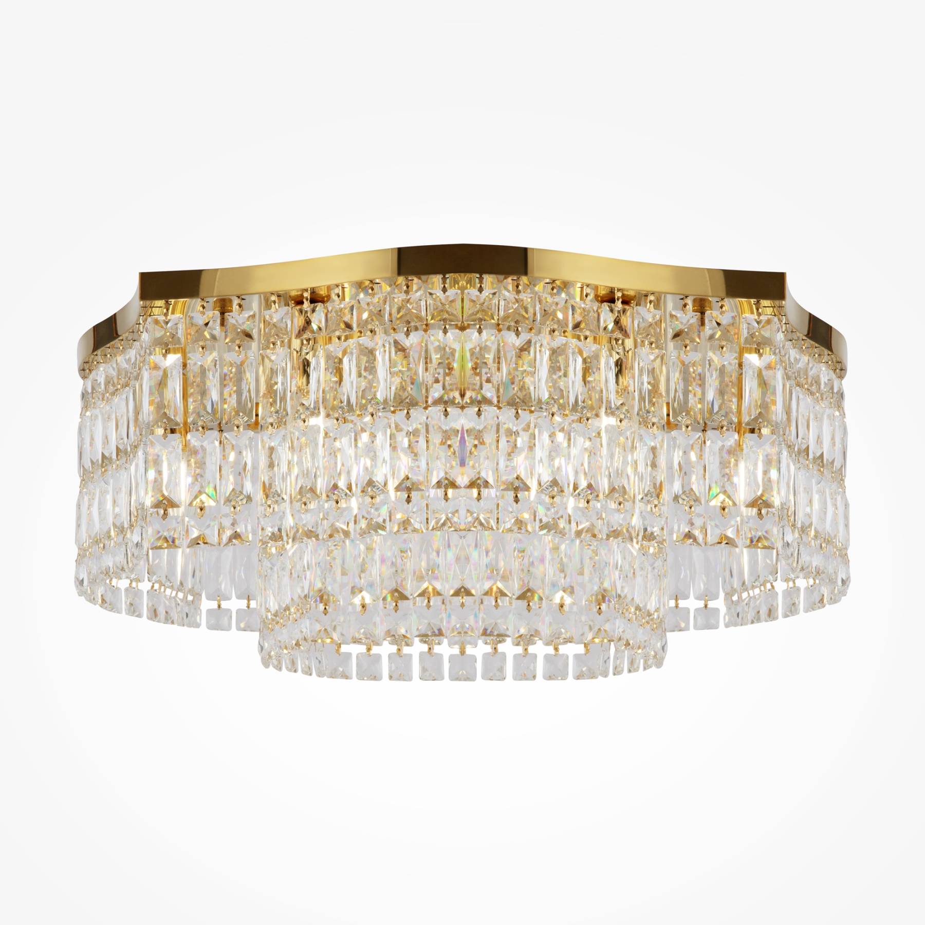 Металлическая арматура в двух оттенках: хром, золото. Декор – прозрачные кристаллы. Потолочные модели имеют два яруса подвесок. Высота подвесной люстры регулируется тросом.