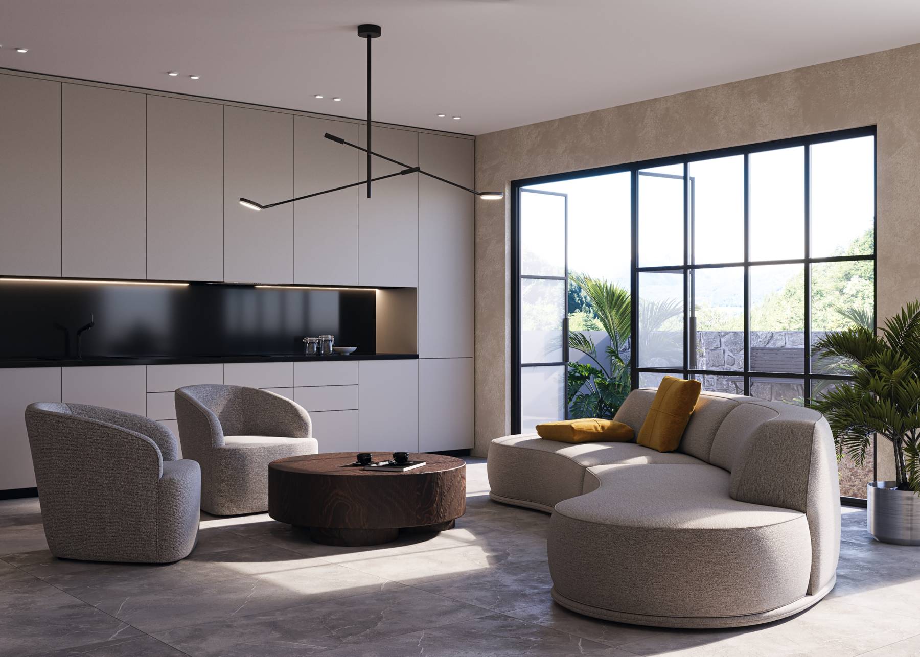Плафоны и арматура из металла. Цвет рассеивателя — белый, арматура черная или белая. Конструкция предусматривает шарнирный механизм, позволяющий регулировать направление света и высоту светильников. Плафоны вращаются на 90 и 360° (в вертикальной и горизонтальной плоскостях). Угол рассеивания — 120 градусов. Тип света — рассеянный.