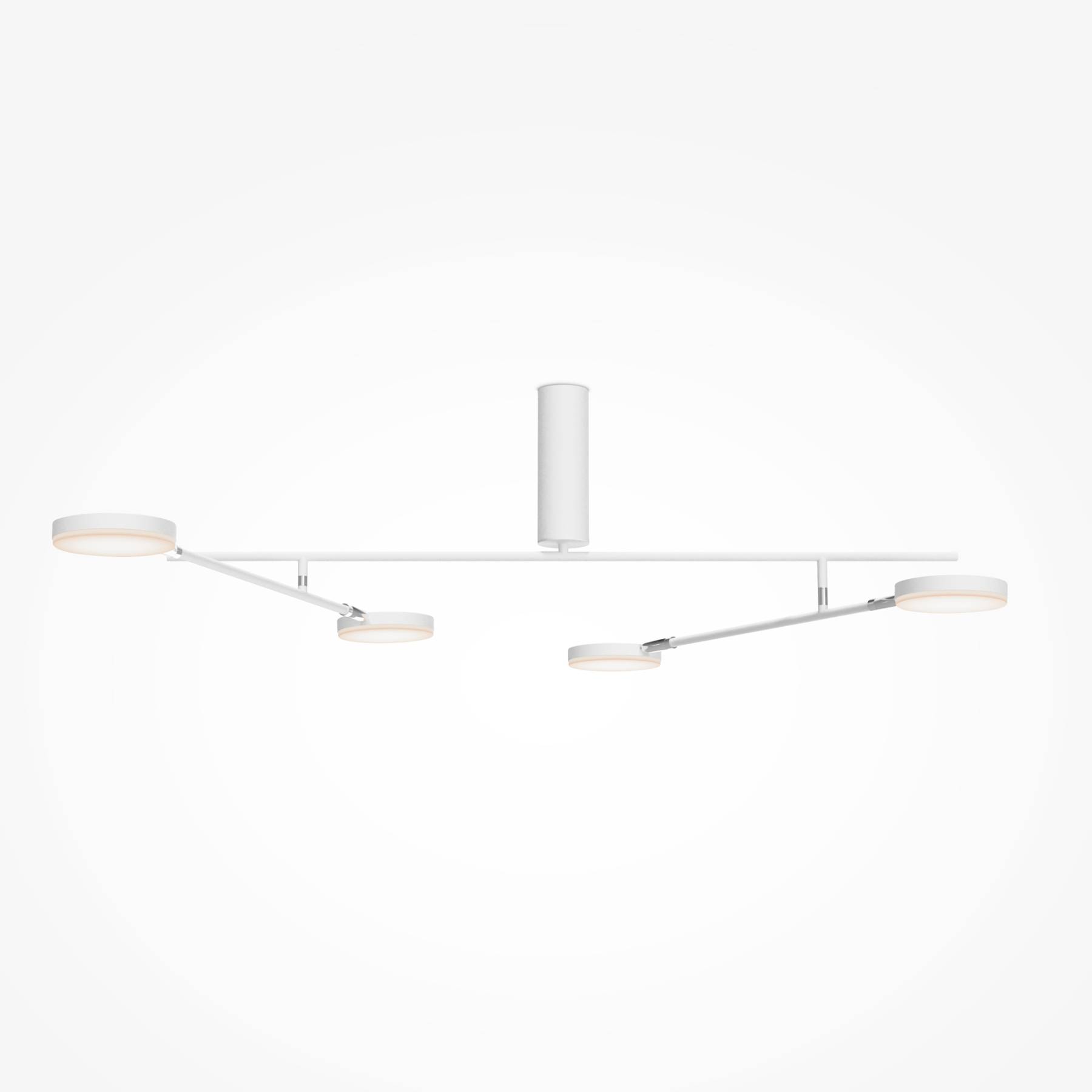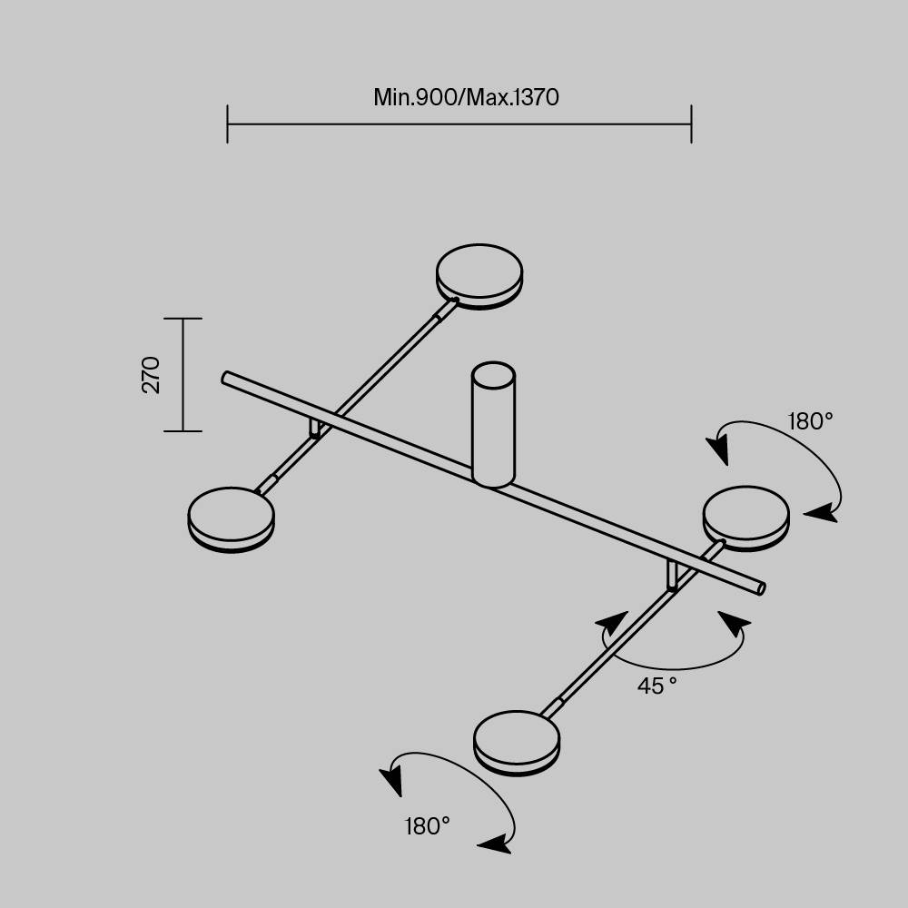 Плафоны и арматура из металла. Цвет рассеивателя — белый, арматура черная или белая. Конструкция предусматривает шарнирный механизм, позволяющий регулировать направление света и высоту светильников. Плафоны вращаются на 90 и 360° (в вертикальной и горизонтальной плоскостях). Угол рассеивания — 120 градусов. Тип света — рассеянный.
