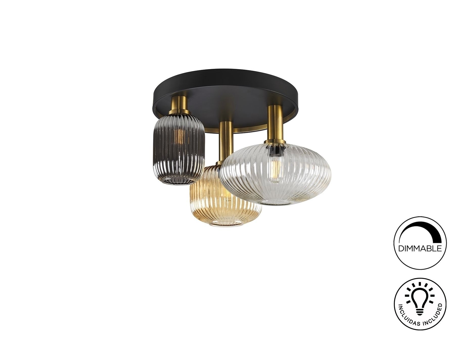 Потолочный светильник с 3 лампами из металла, окрашенного в черный матовый цвет, с деталями из сатинированной латуни. Абажуры из формованного стекла прозрачного, янтарного и мерцающего дымчато-серого цвета.