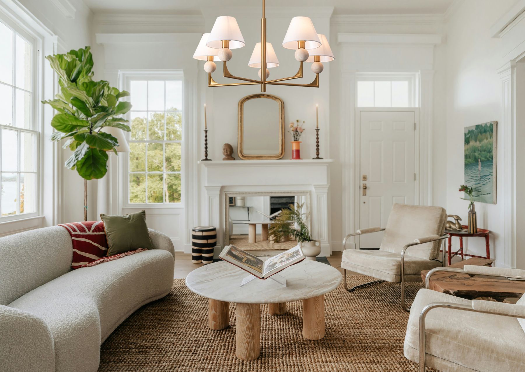 Материал арматуры — металл. Цвет металла — латунь. Абажуры выполнены из белой ткани, которые мягко рассеивают свет. Потолочные и настенные светильники с цоколем E14. Декоративные элементы в форме шара на плафоне выполнены из травертина. Металлическая форма арматуры строгой геометрической формы с пластинами из латуни. Подходит для оформления элегантных классических пространств.
