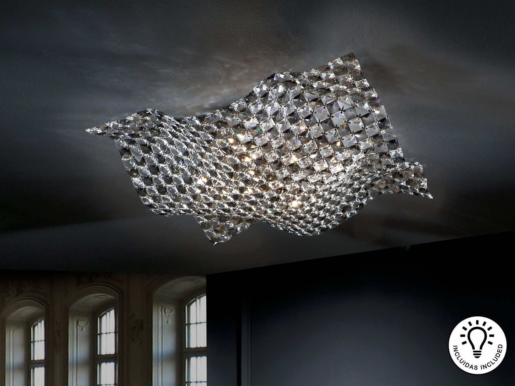Потолочный светильник из хромированного металла, плафон из скреплённых между собой кристаллов прозрачного гранёного стекла K9 и кристаллов дымчатого цвета. Включает 5 светодиодов G9 мощностью 6 Вт.