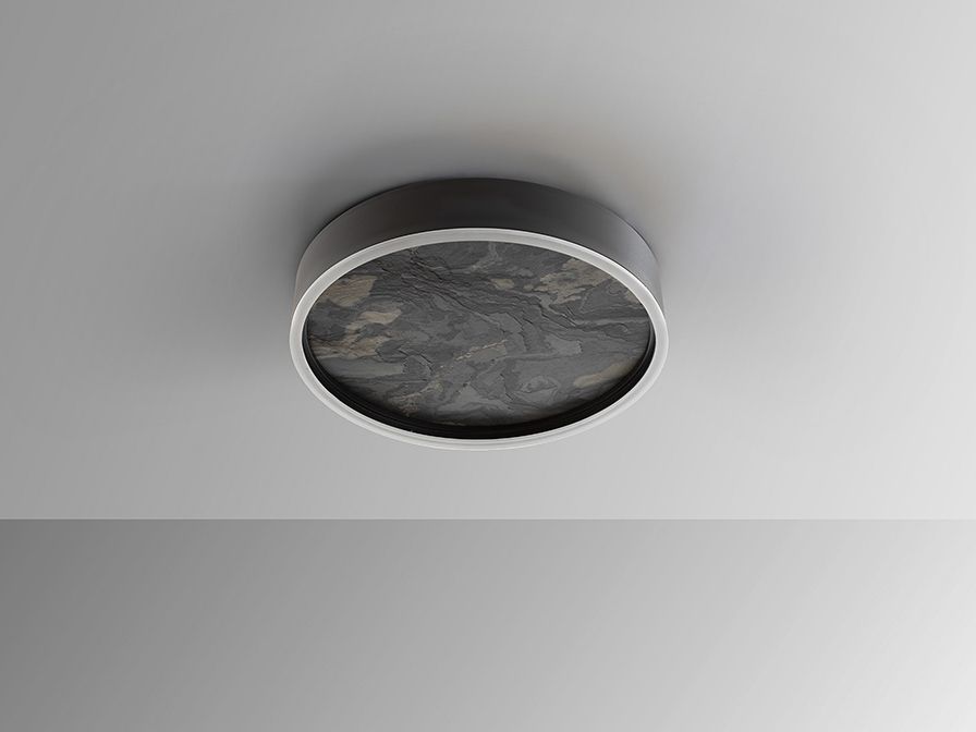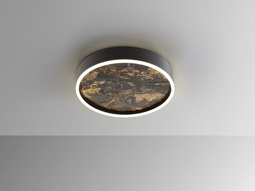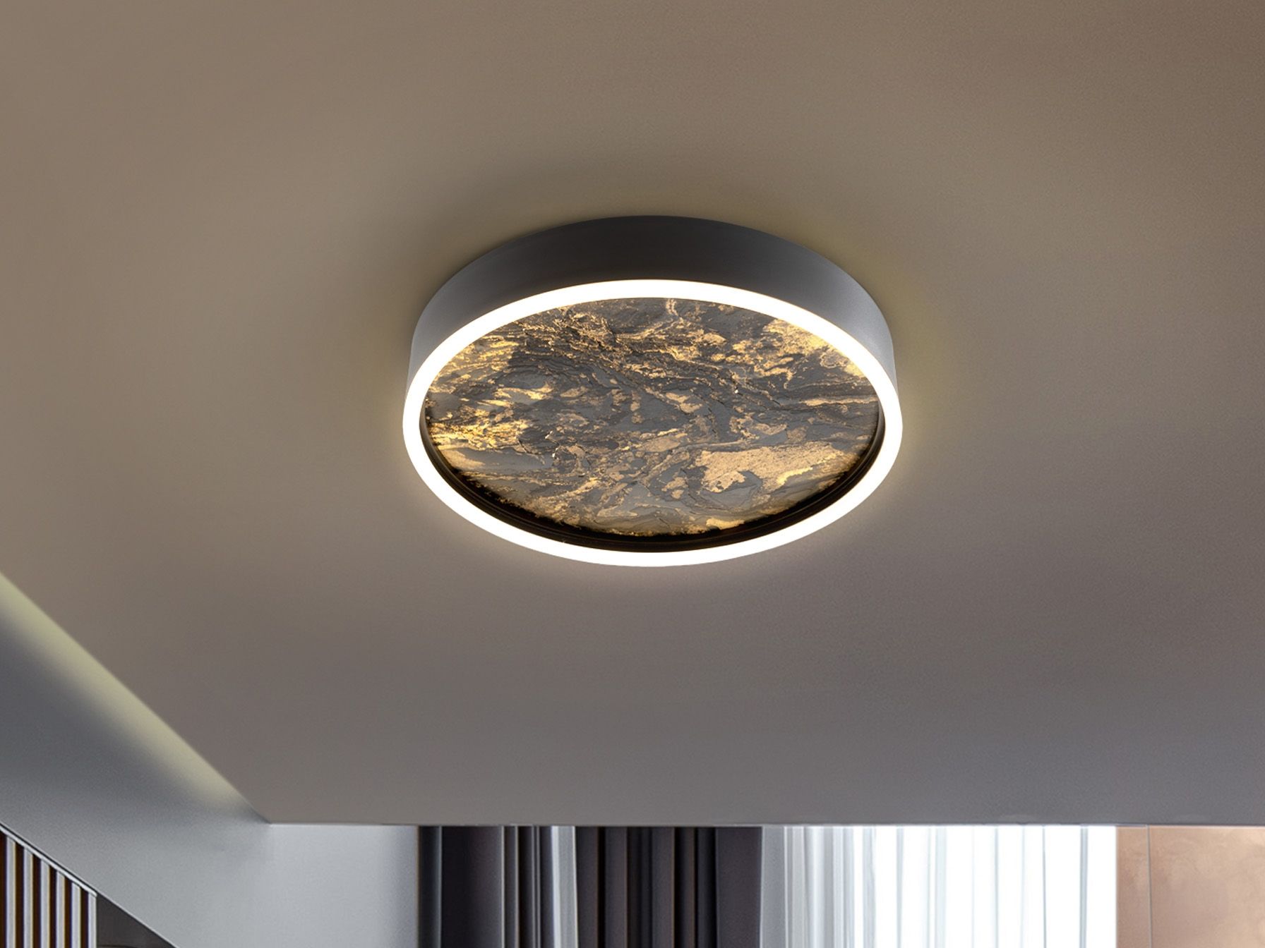 Потолочный светильник из металла, черная отделка. Рассеиватель из полупрозрачного многоцветного сланца и опаловое акриловое кольцо. Светодиодный светильник 36+20Вт, 1080 лм, смена цвета CCT, 3000/4000/6000К