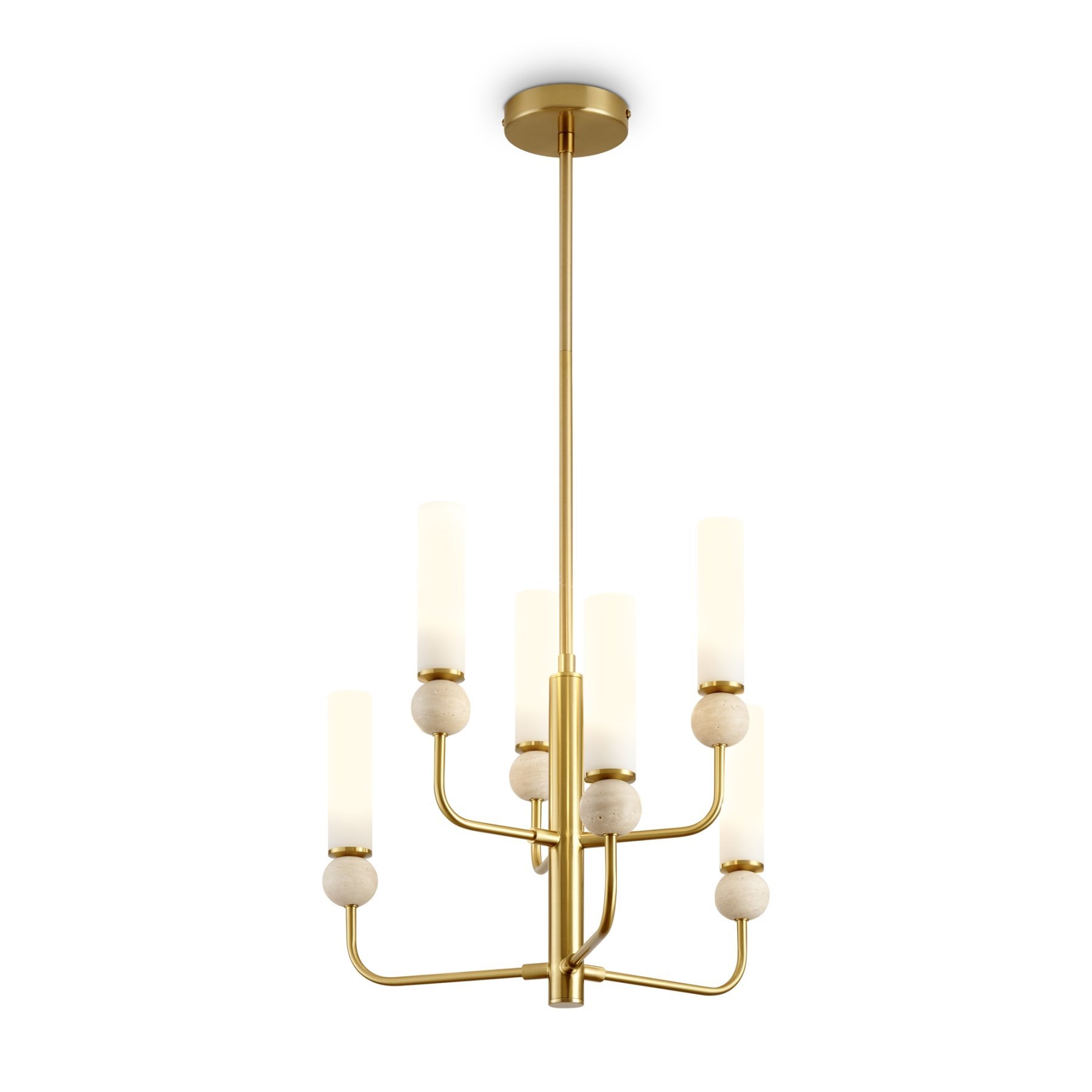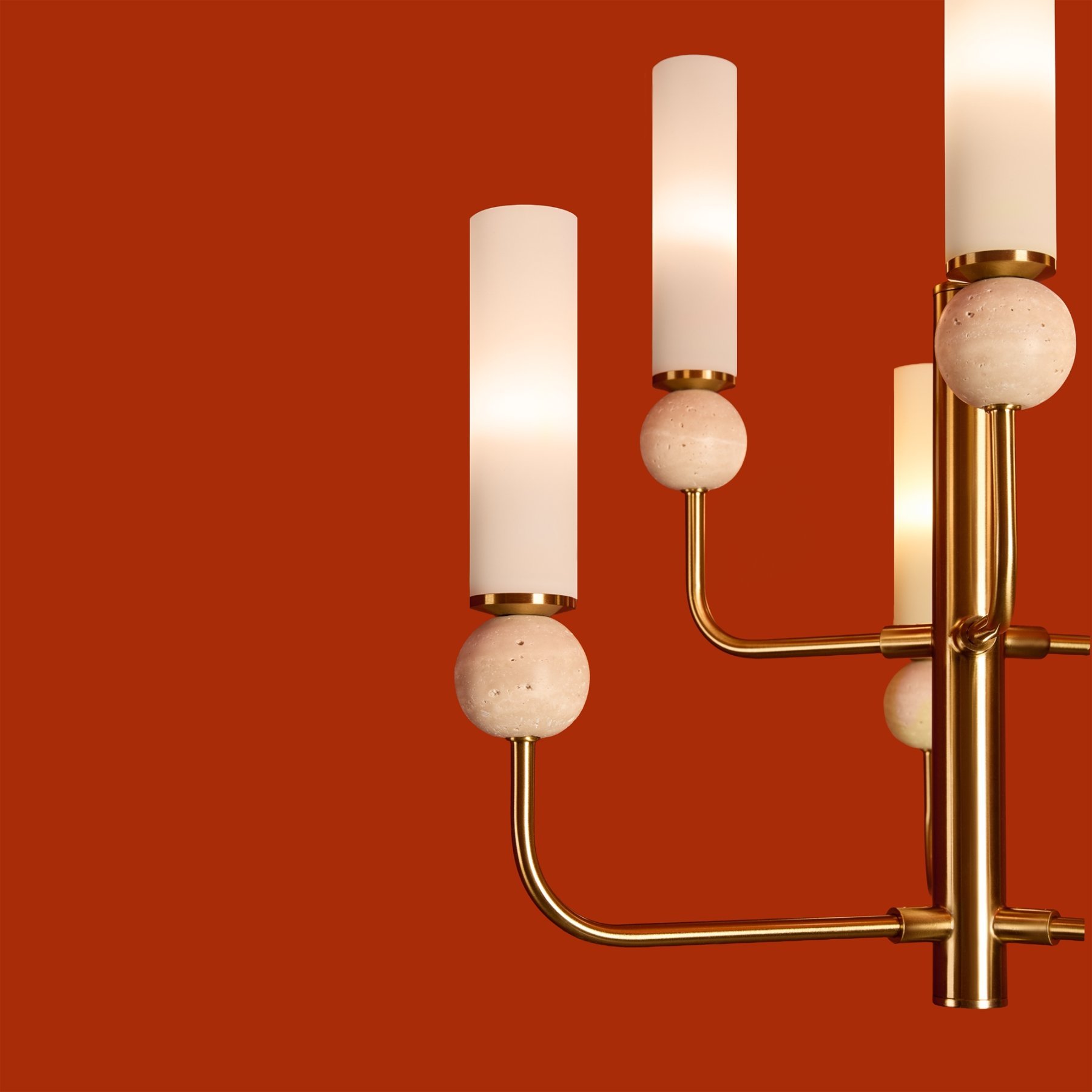 Серия Sunspot использует камень травертин как основной декоративный элемент. Настенные бра в двух вариантах: с матовым белым стеклянным плафоном и со «скользящим» теплым светом. Отличительная черта бра: увеличенный размер плафона и сенсорное включение/выключение без диммирования. Подвесные светильники имеют прозрачные стеклянные плафоны с декоративными шариками из камня травертин. Sunspot включают три модели подвесов разных размеров и форм стеклянной окантовки на плафон. Арматура — металл латунного и черного цвета Источники света LED 3000K и цоколь G9. Настольная лампа с touch переключателем  . Серия создает комплексное зональное и  акцентное освещение, подходящее для создания уютной атмосферы.