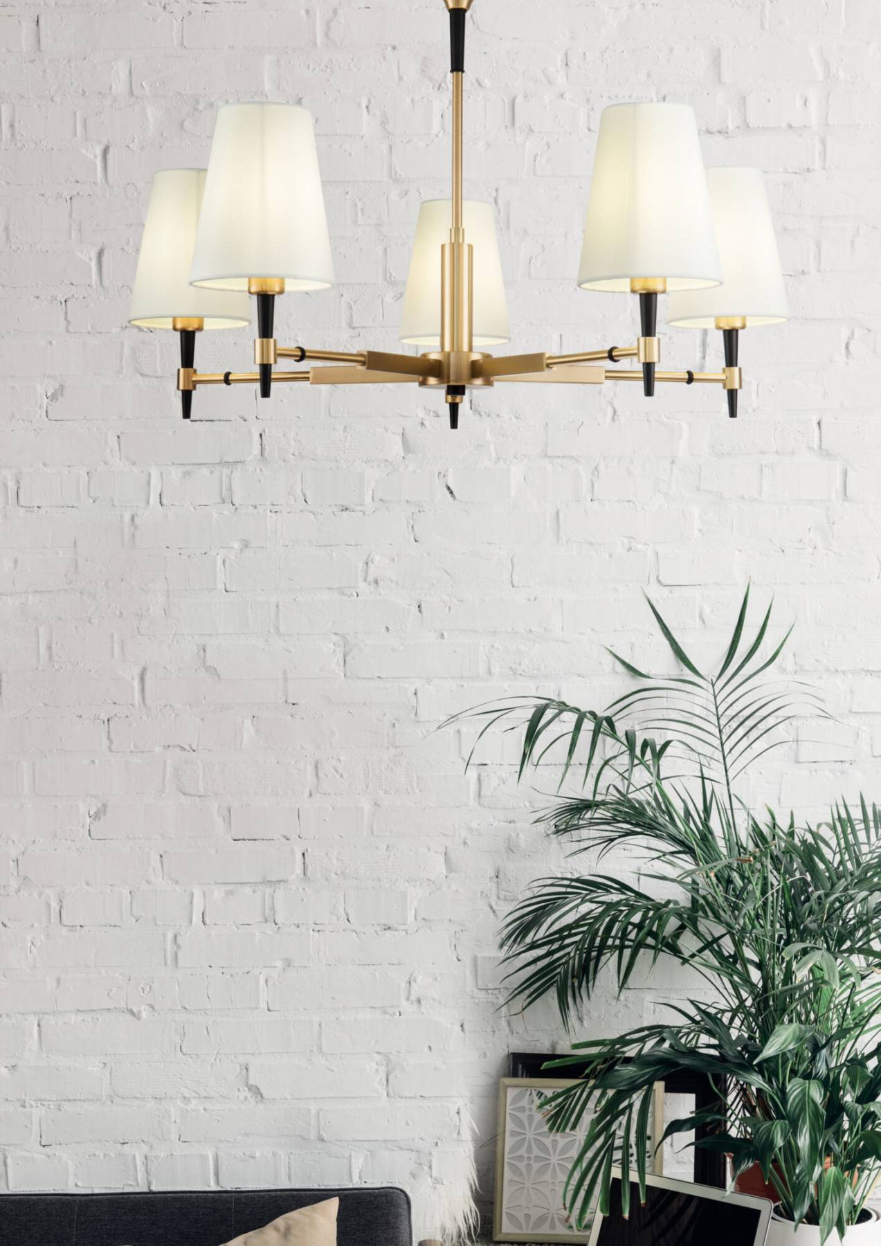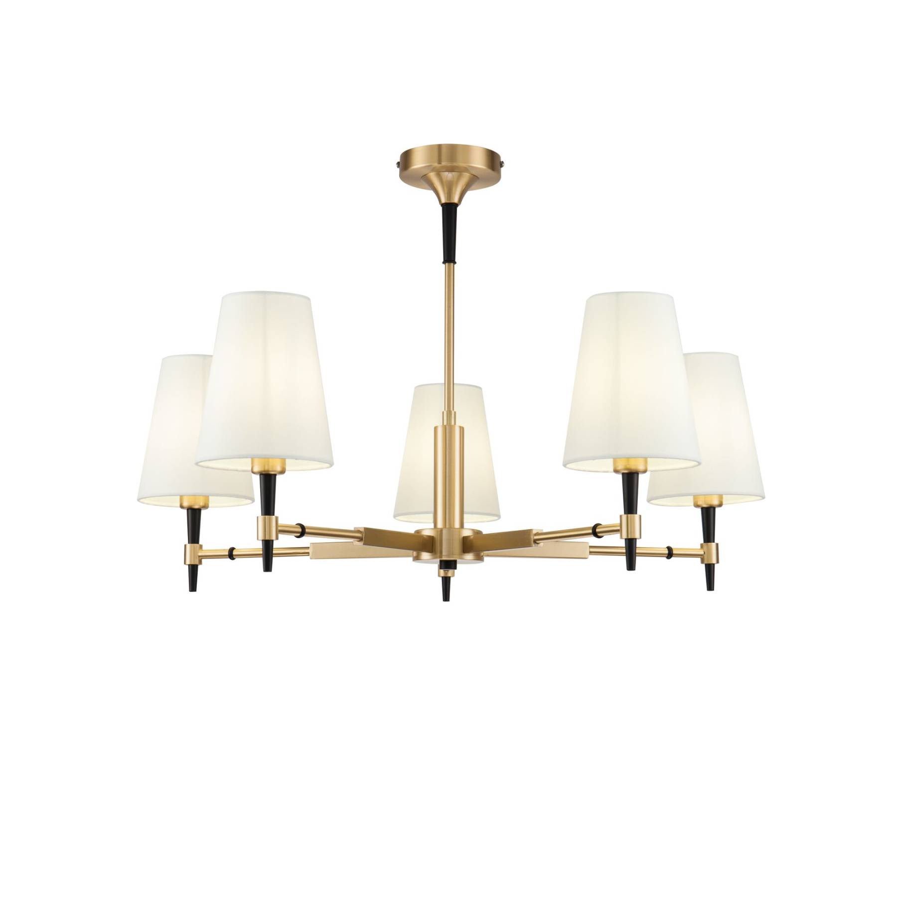 Металлическая арматура, гальванизация в цвет латуни. Часть элементов окрашена в черный цвет. Абажуры из белого текстиля, нанесенного на ПВХ. Источник света - лампа с цоколем Е14.