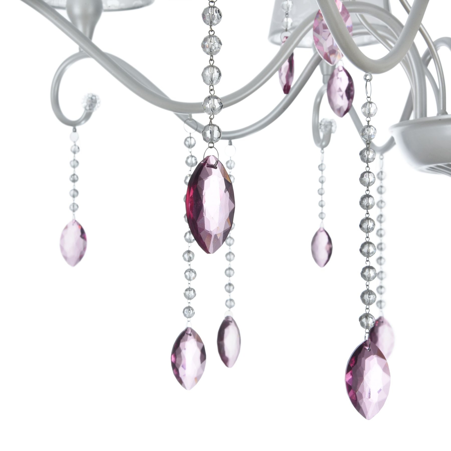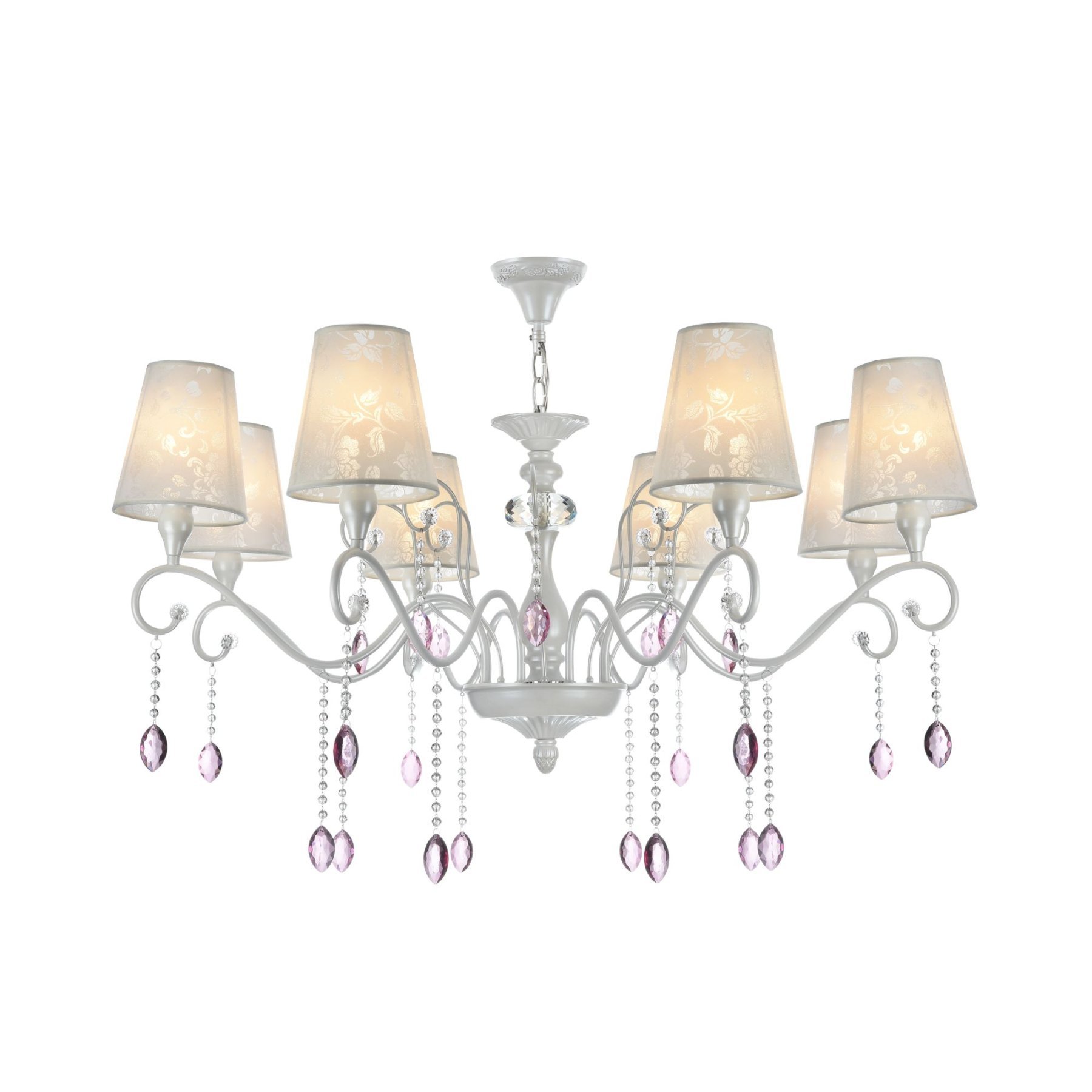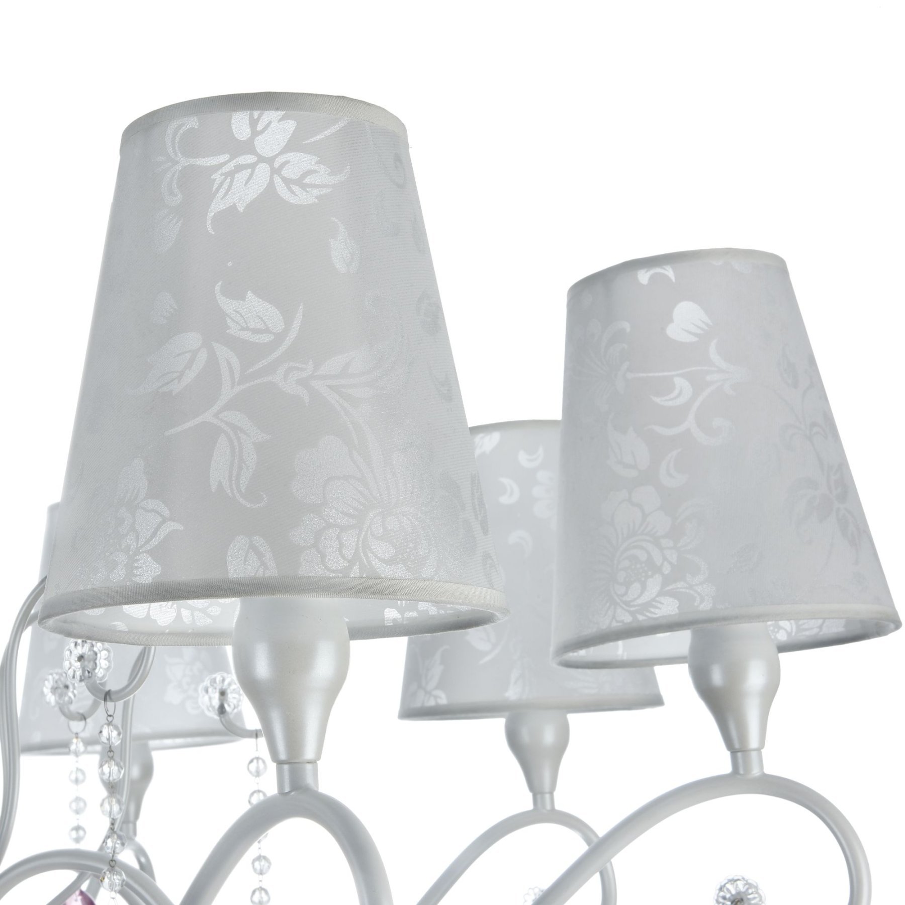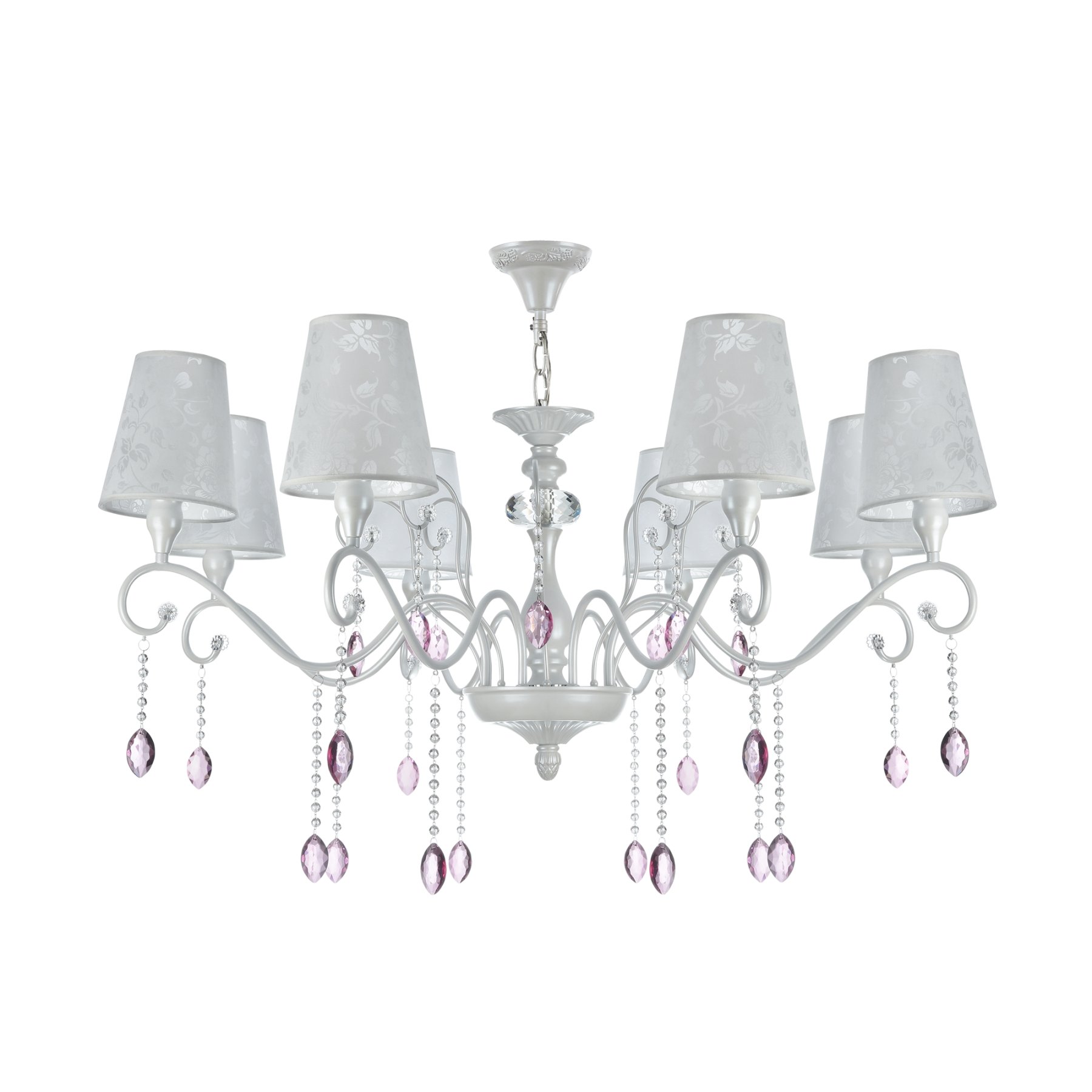 Серия выполнена в классическом стиле. В дизайне люстр и бра сделан легкий цветовой акцент на цепочки из мелких бусин и прозрачные розовые кристаллы. Торшер и настольная лампа имеют строгий и лаконичный дизайн. Все изделия серии, кроме бра, в основании декорированы украшением в виде большого круглого граненого кристалла. Отделка арматуры - жемчужного белого цвета, абажуры сделаны из сатина с цветочным рисунком.