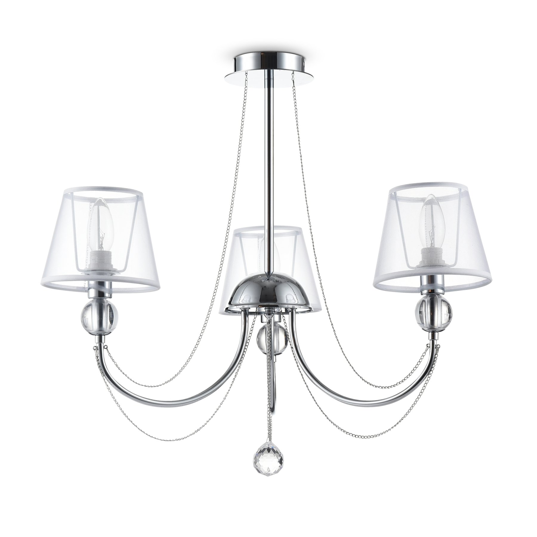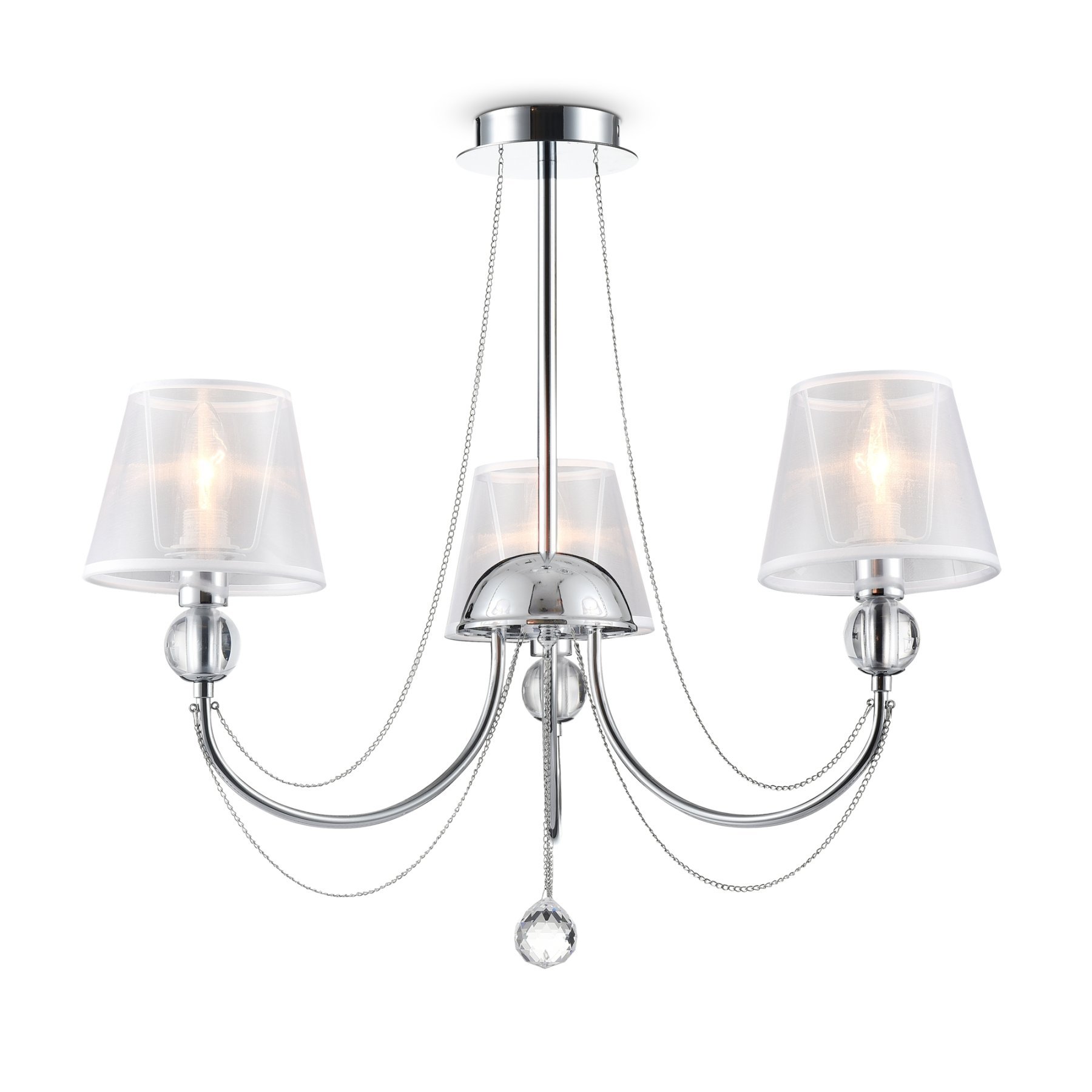 Светильники станут украшением интерьера, придадут ему шарм. Арматура светильников - из металла, а абажуры – из прозрачной органзы и ПВХ. Каждый из светильников серии дополнен тонкими серебристыми цепочками, а основания рожков украшены стеклянными прозрачными шарами. Завершающий элемент дизайна светильников Beverly – это декоративные подвески.