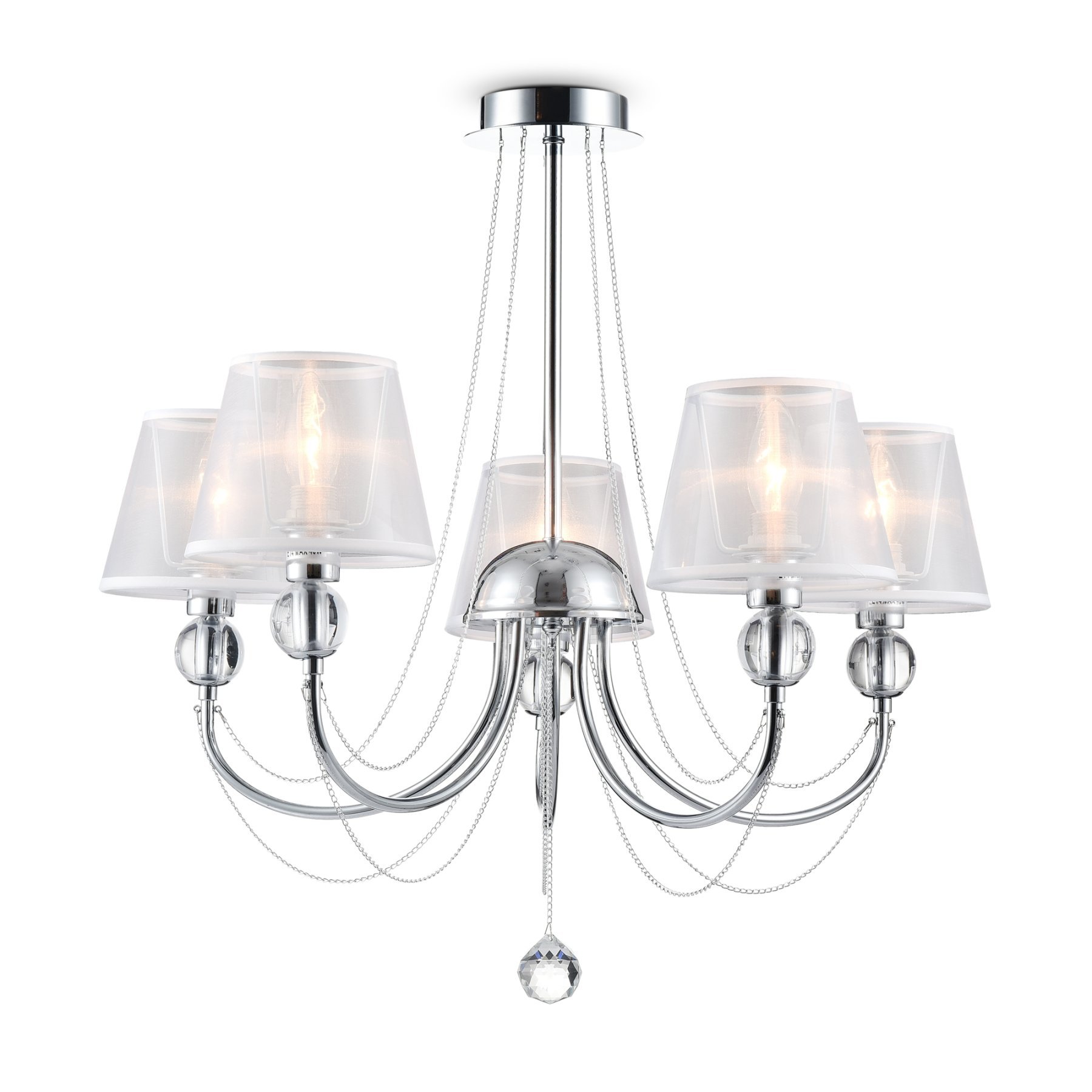 Светильники станут украшением интерьера, придадут ему шарм. Арматура светильников - из металла, а абажуры – из прозрачной органзы и ПВХ. Каждый из светильников серии дополнен тонкими серебристыми цепочками, а основания рожков украшены стеклянными прозрачными шарами. Завершающий элемент дизайна светильников Beverly – это декоративные подвески.