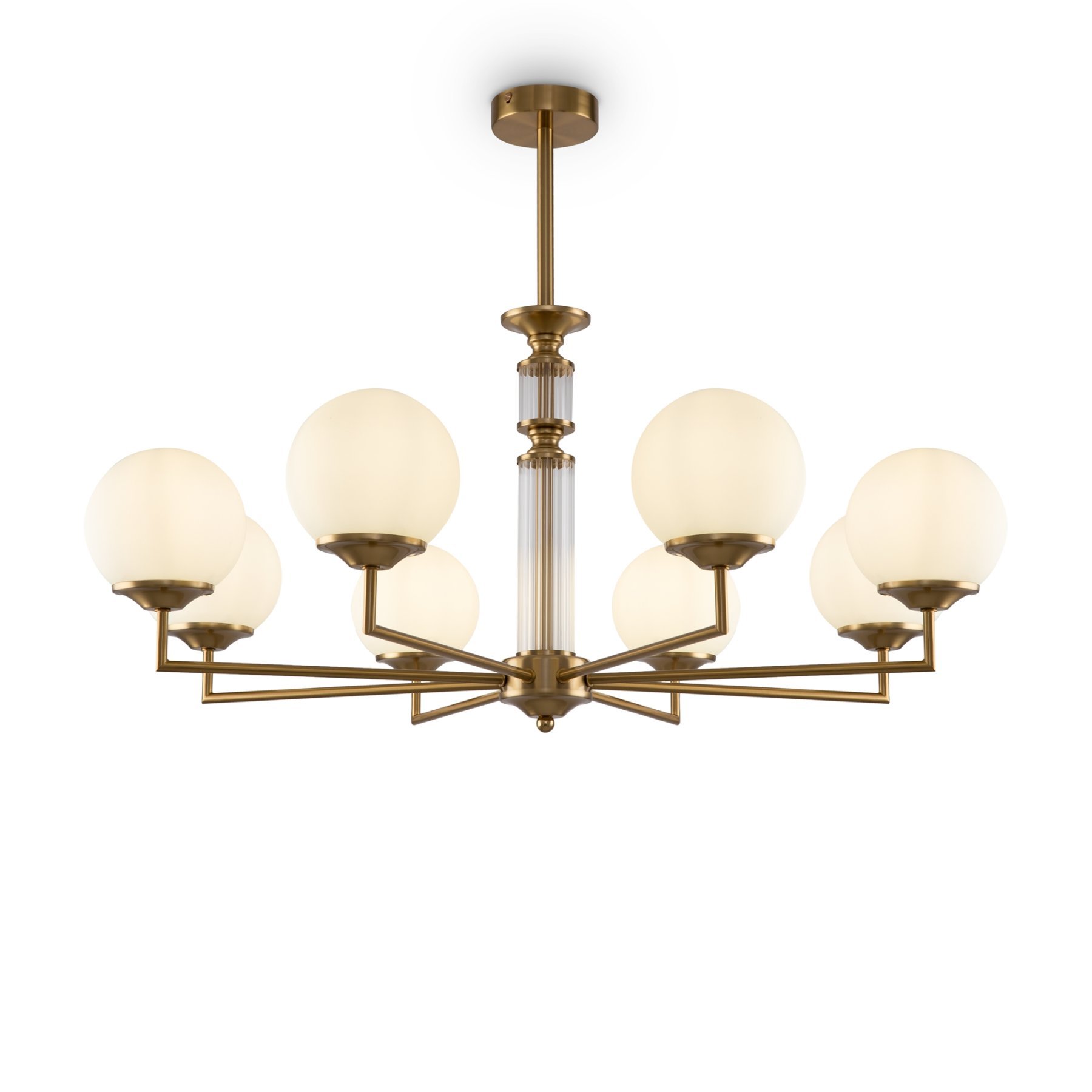 Металлическая арматура окрашена в цвет латуни. Плафоны-сферы из матового белого стекла. Декор – прозрачное рельефное стекло. Источник света – лампа с цоколем Е27.