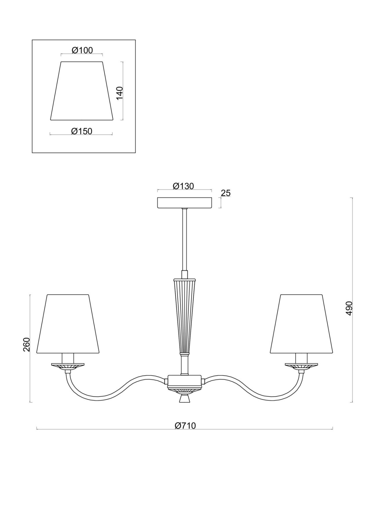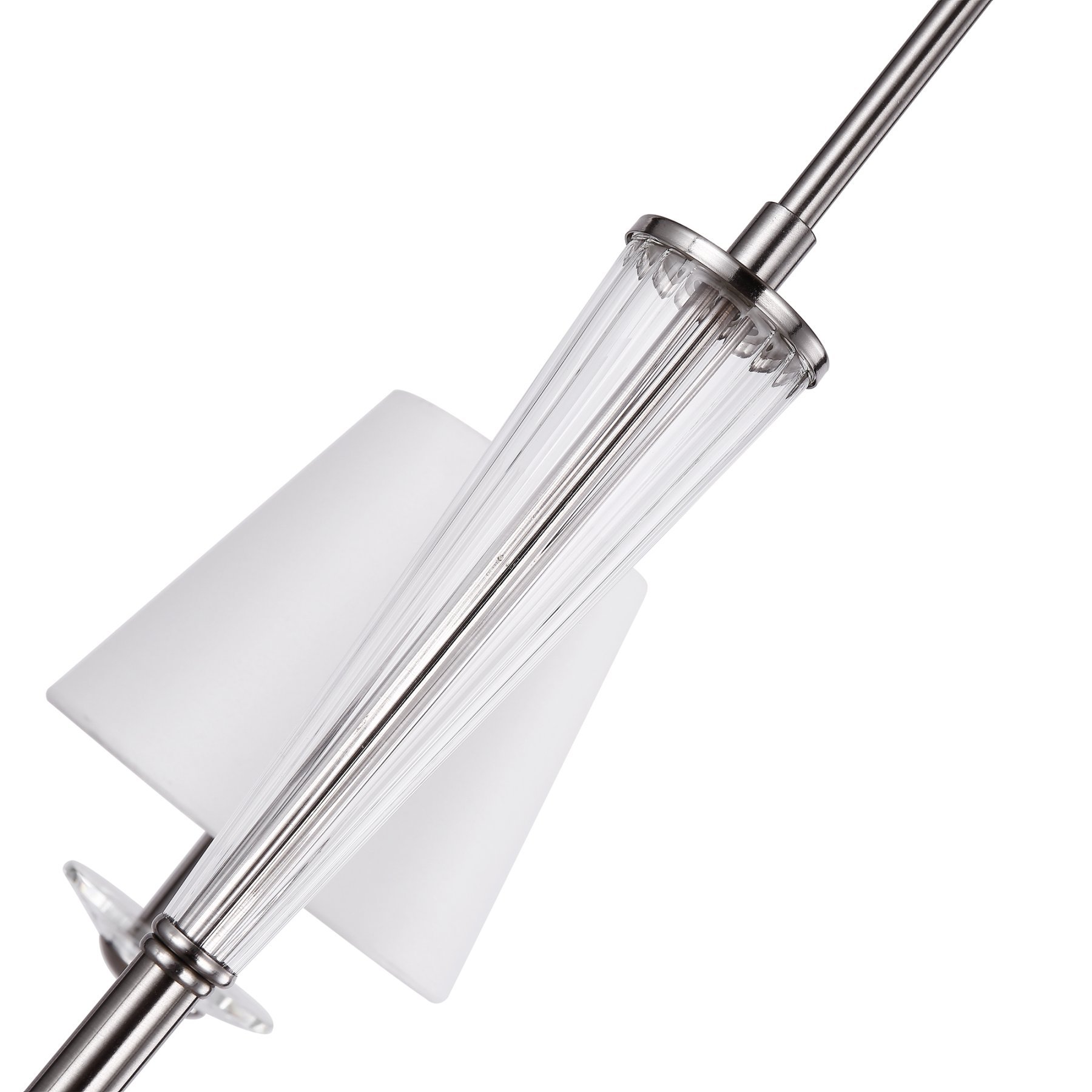 Металлическая арматура в двух оттенках на выбор: латунь и никель. Абажуры – текстиль белого цвета. Декоративные элементы из прозрачного стекла. Источник света – лампа с цоколем E14.