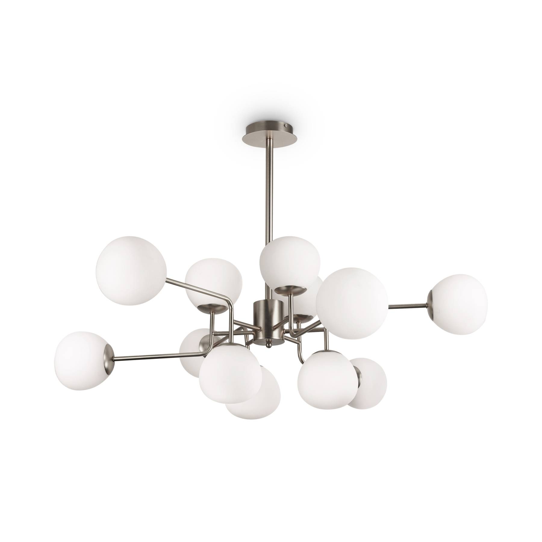 Металлическая арматура, цвет – никель, латунь. Плафоны – выдувное стекло белого цвета. Широкая семья. У торшера и настольной лампы можно изменять положение плафона. Регулируемая высота.