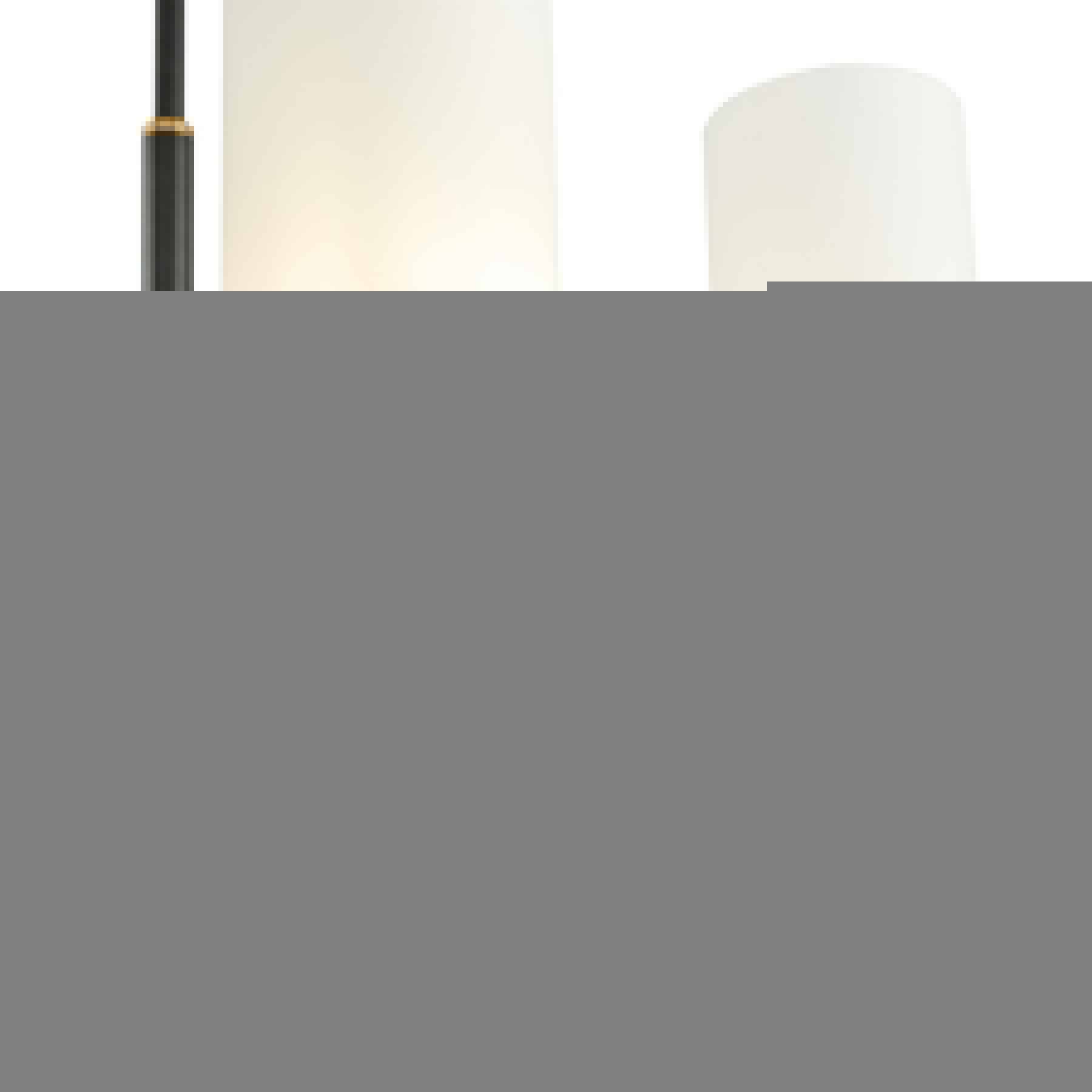 Арматура из металла, оттенок — латунь. Стеклянные плафоны в белом цвете. Часть элементов окрашена в контрастный черный оттенок. Геометрия в дизайне: цилиндрические плафоны, прямоугольные рожки.