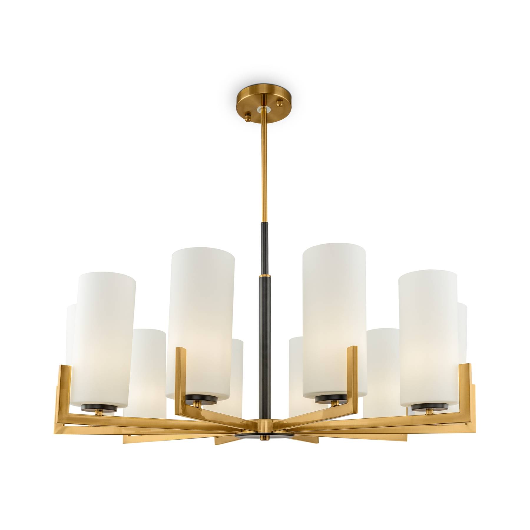Арматура из металла, оттенок — латунь. Стеклянные плафоны в белом цвете. Часть элементов окрашена в контрастный черный оттенок. Геометрия в дизайне: цилиндрические плафоны, прямоугольные рожки.