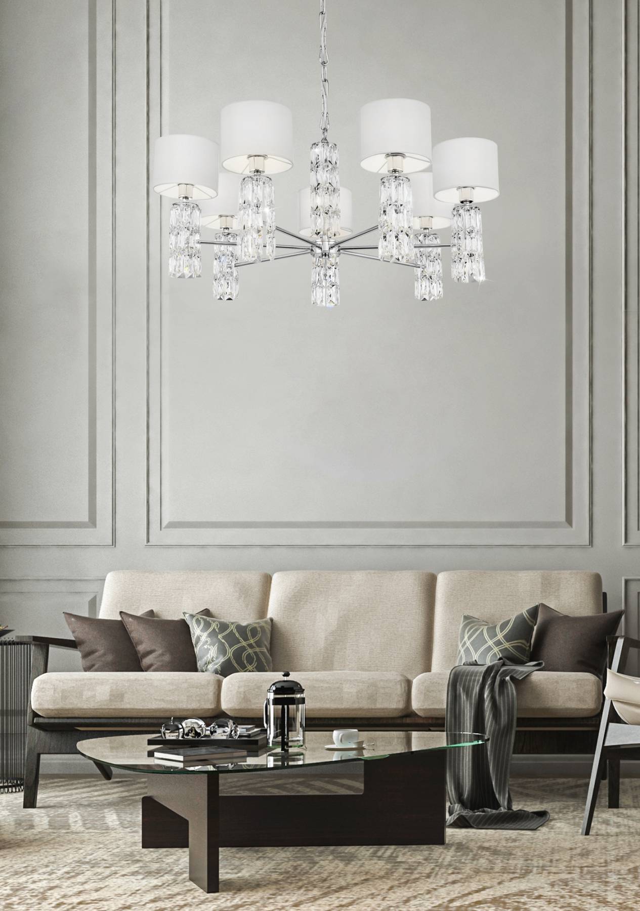Арматура из металла, цвет – хром. Абажуры из текстиля, нанесенного на ПВХ. Цвет – белый. Декор – массивные кристаллы сложной огранки. Высота подвесных моделей регулируется.