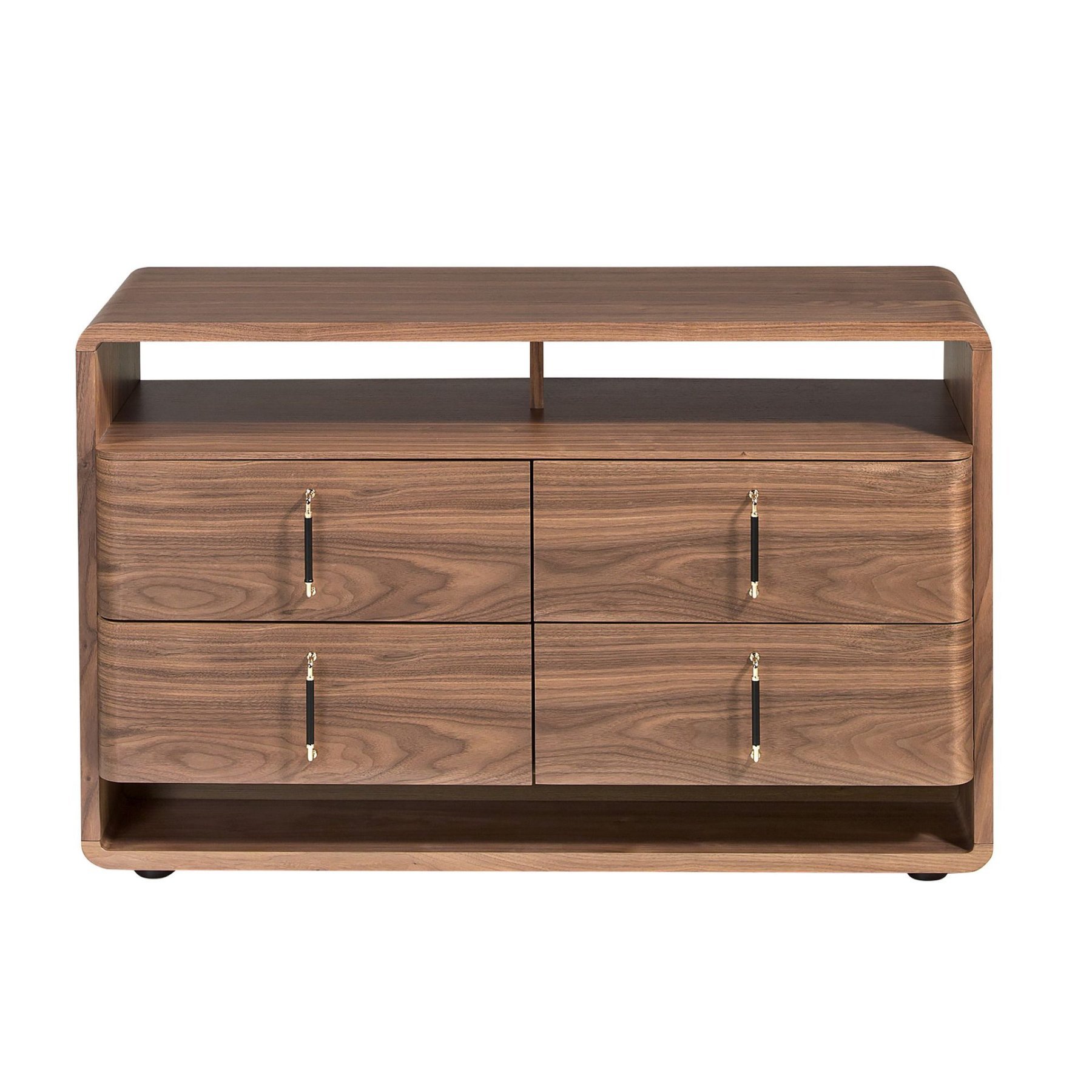 Современный комод с каркасом из натурального орехового шпона и оригинальными черными ножками из ПВХ. Он отличается вместительным пространством для хранения благодаря 4 выдвижным ящикам с системой открывания «язычок» и механизмом плавного закрывания.