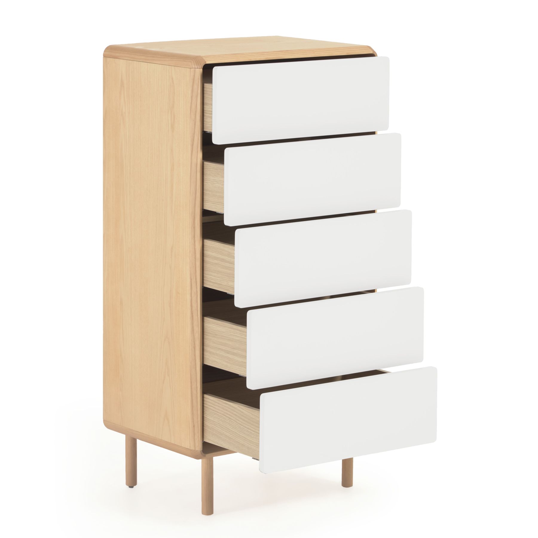 Комод из ясеневого шпона с ножками и каркасом из массива ясеня. Ящики с плавным закрыванием, механизмом открывания push-to-open и регулируемыми ножками. Фасад окрашен в серо-белый цвет.