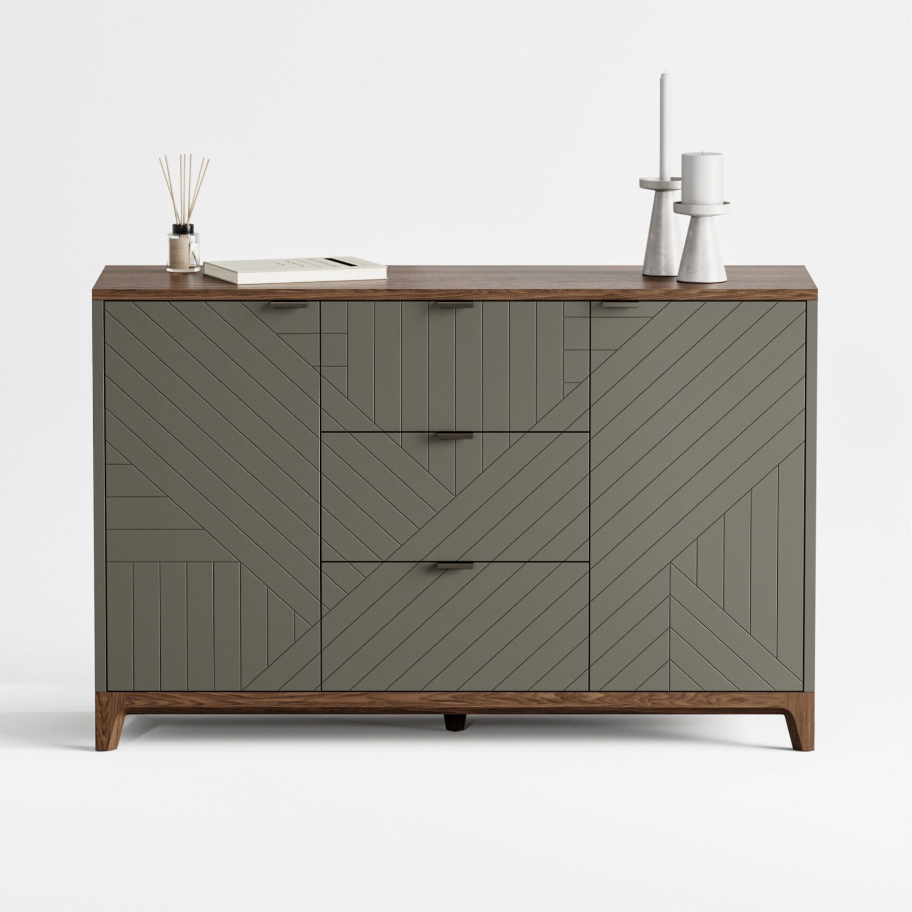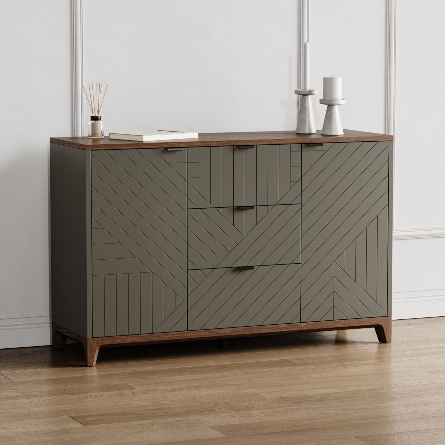 В этом комоде гармонично сочетаются лаконичный дизайн, продуманные габариты и концептуальная гравировка на фасадах. Данная модель оснащена двумя просторными секциями с полками по бокам и тремя выдвижными ящиками по центру. Комод станет удачной находкой для любителей утонченного стиля и функциональной мебели.