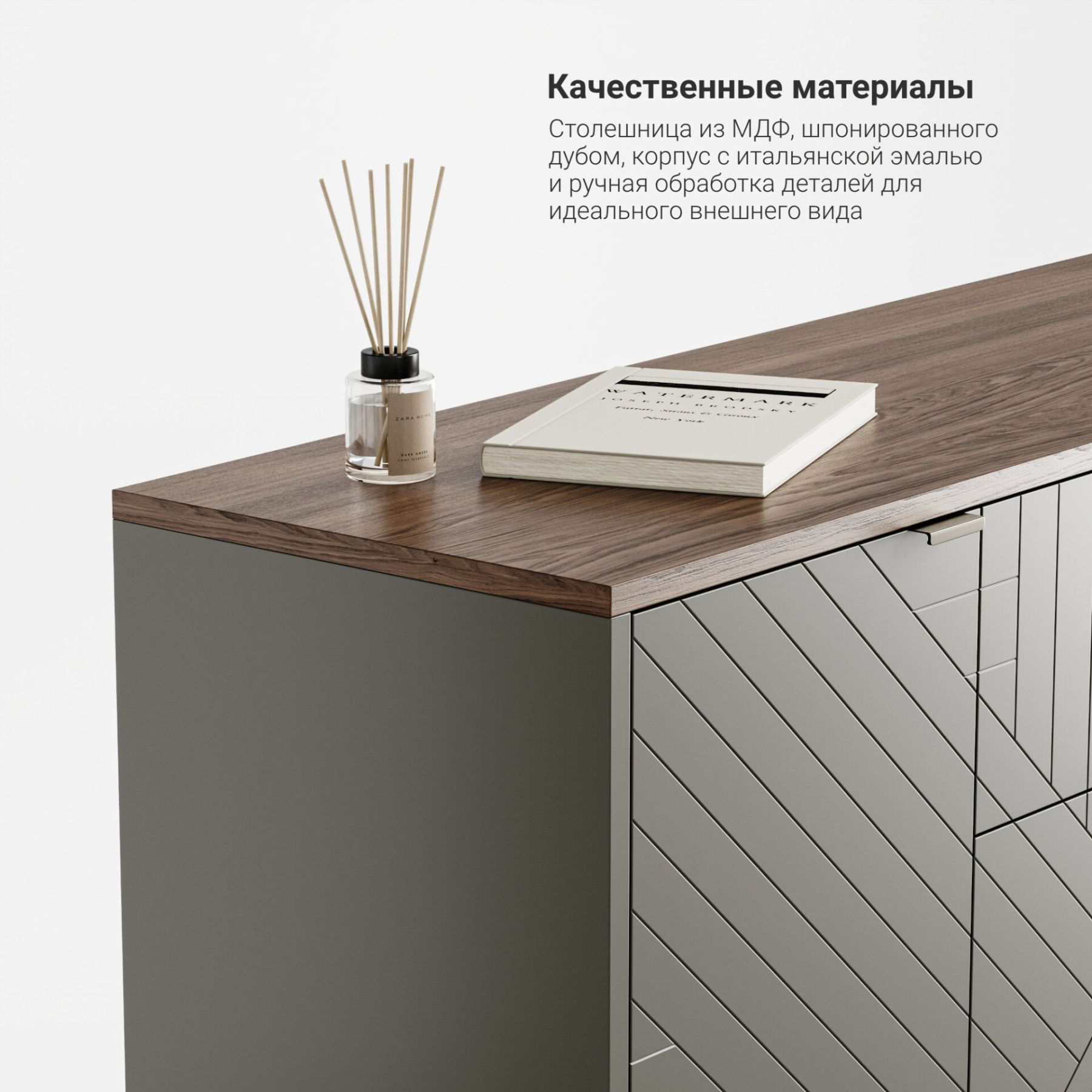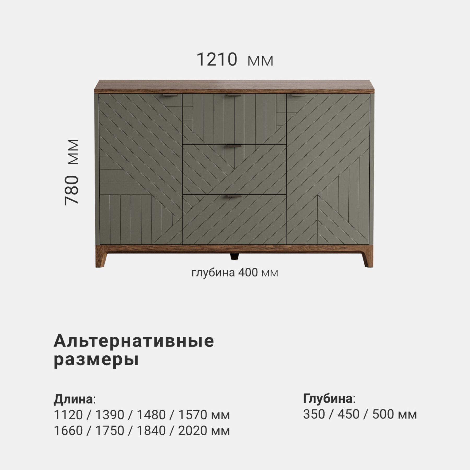 Основание и ножки выполнены из массива дуба, цвет которого вы можете выбрать из нескольких вариантов. Корпус комода может быть покрыт эмалью или натуральным шпоном дуба. Фасады могут быть покрыты эмалью с / без гравировки или натуральным шпоном дуба.