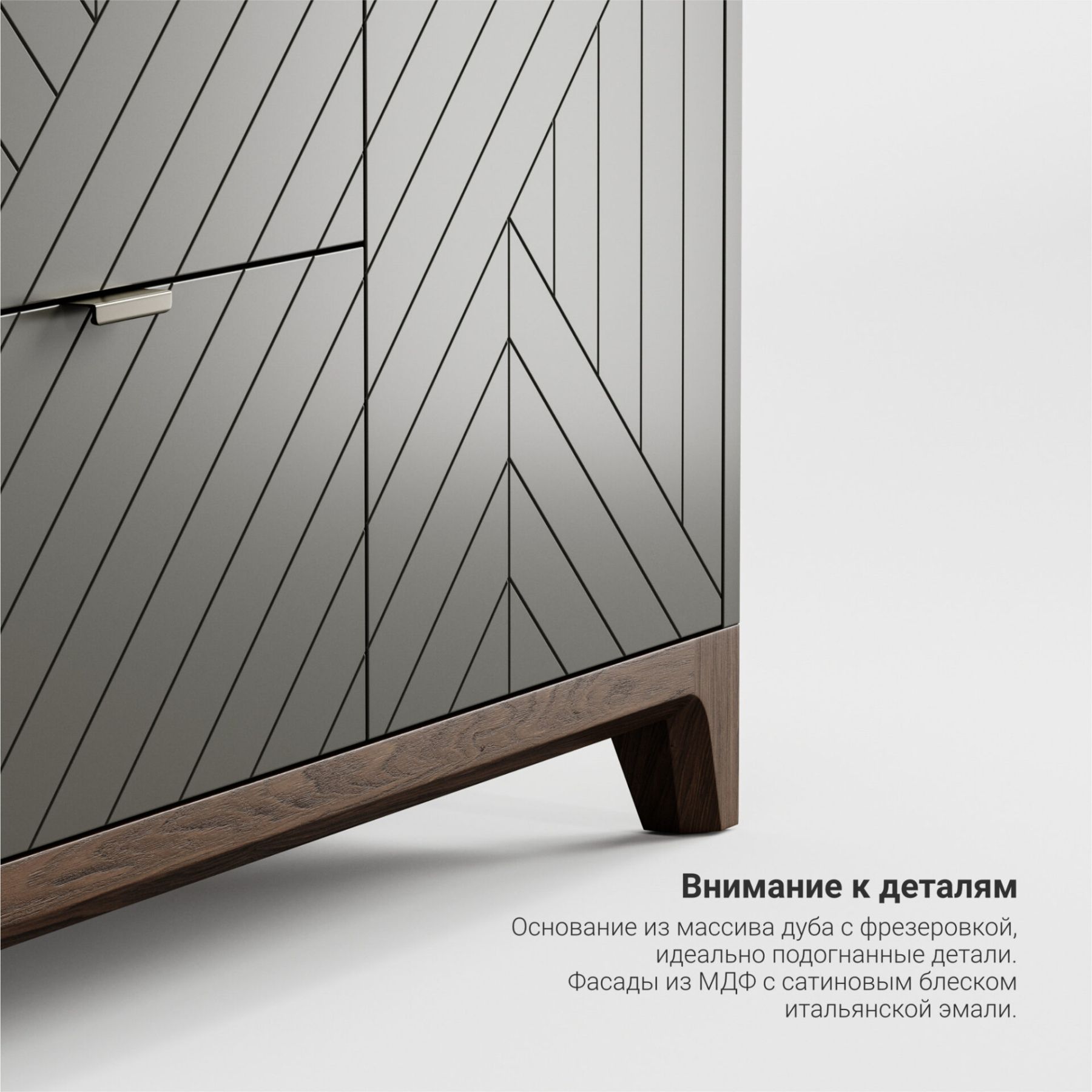 Отличительной особенностью мебели из серии CASE является вариативность ее исполнения. Выбирайте оттенок эмали, материал корпуса, тонировку основания и ножек, а также узор гравировки. Кроме того, вы можете заказать комод, который будет полностью покрыт натуральным шпоном дуба.