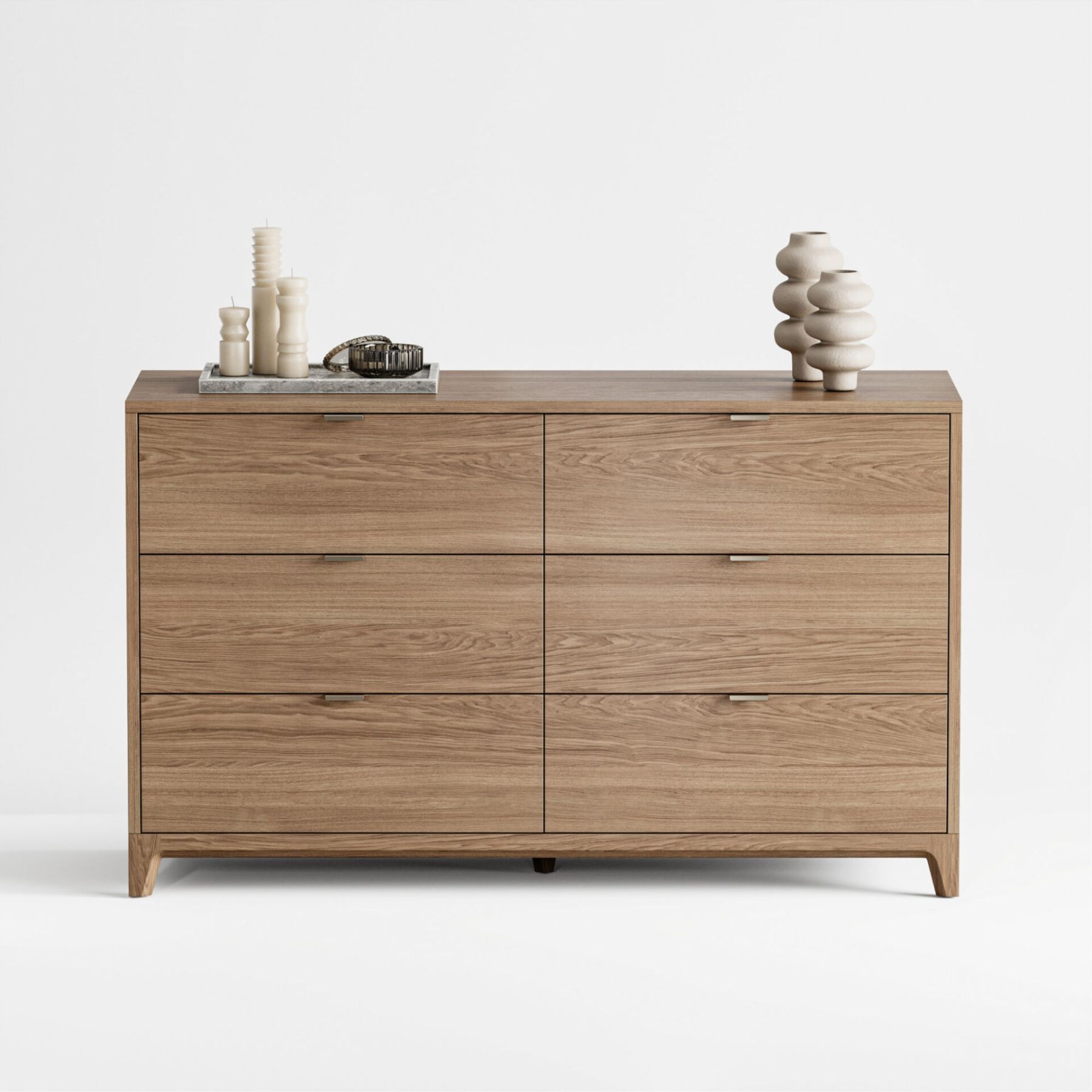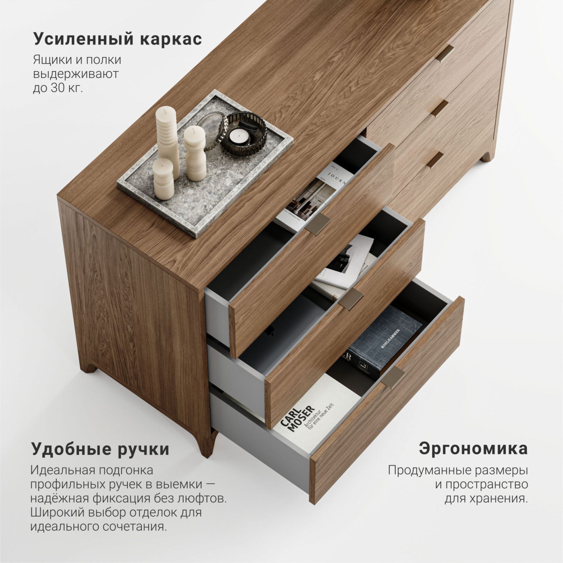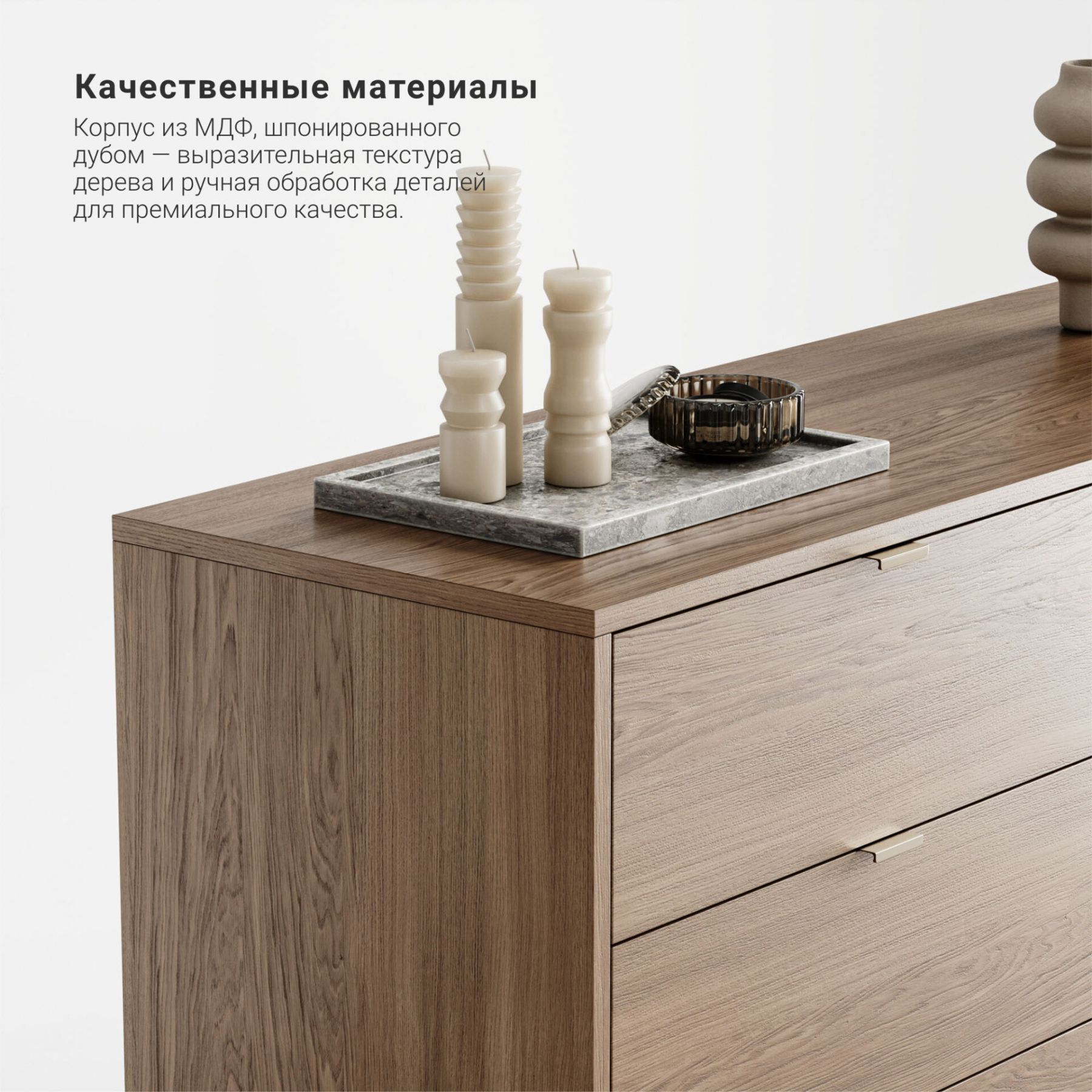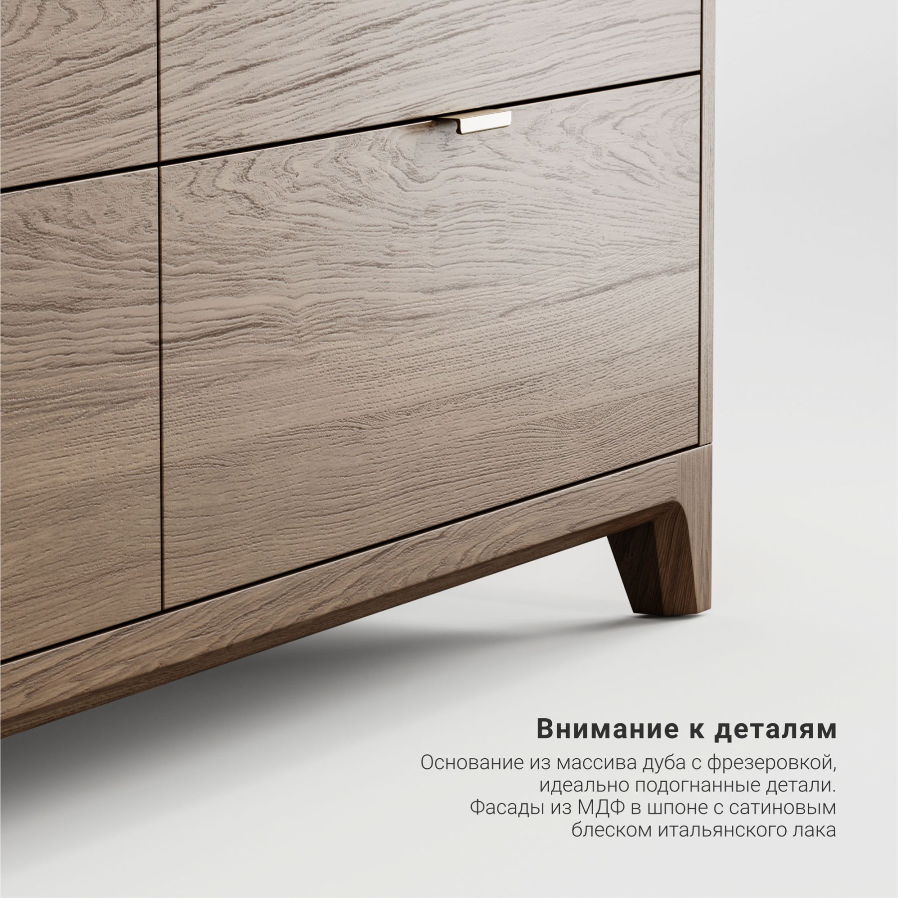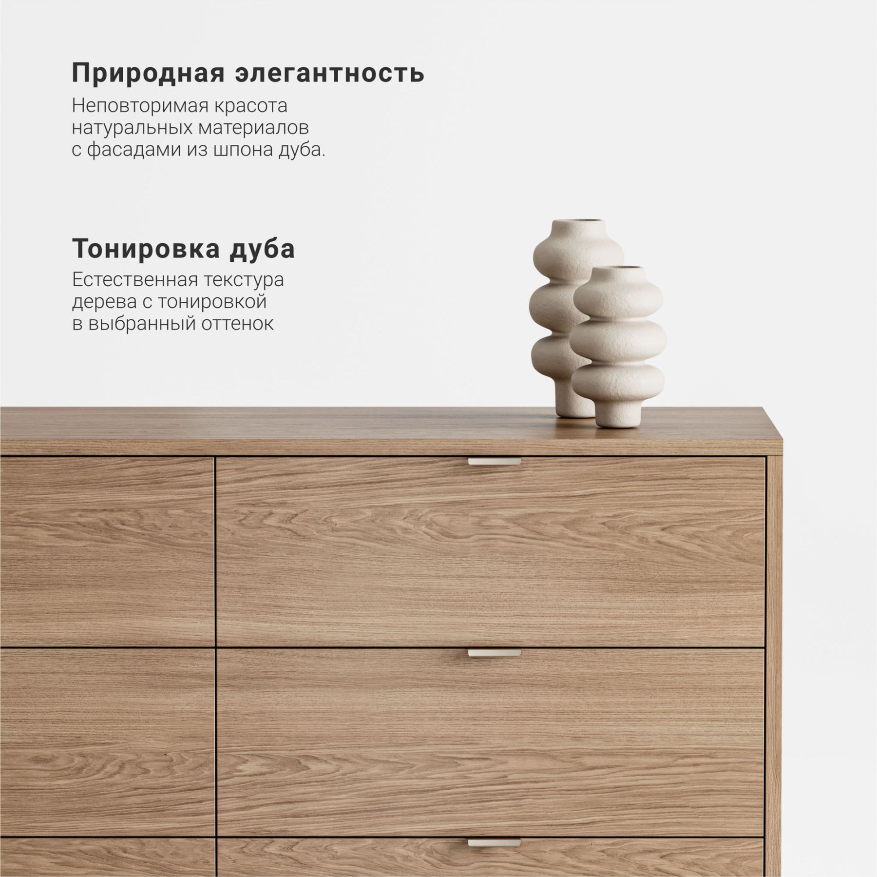 Комод с шестью выдвижными ящиками будет незаменим для хранения вещей в спальне и других помещениях. Прочные и вместительные ящики из ЛДСП, которые выдерживают вес до 25 кг помогут использовать пространство максимально эффективно, а фасады с объемной гравировкой и изящные ножки из массива дуба непременно украсят ваш интерьер.