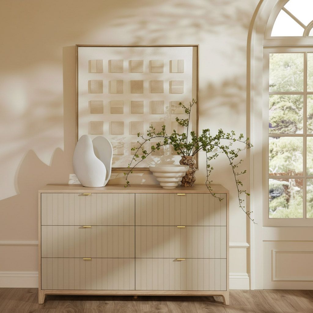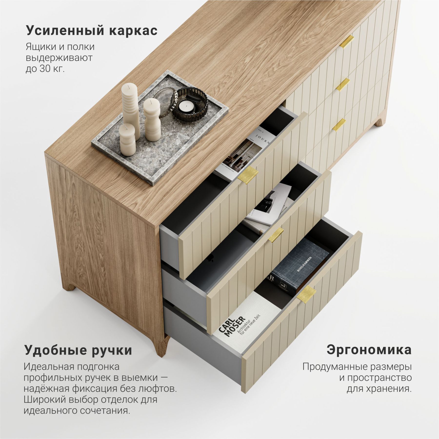 Комод с шестью выдвижными ящиками будет незаменим для хранения вещей в спальне и других помещениях. Прочные и вместительные ящики из ЛДСП, которые выдерживают вес до 25 кг помогут использовать пространство максимально эффективно, а фасады с объемной гравировкой и изящные ножки из массива дуба непременно украсят ваш интерьер.