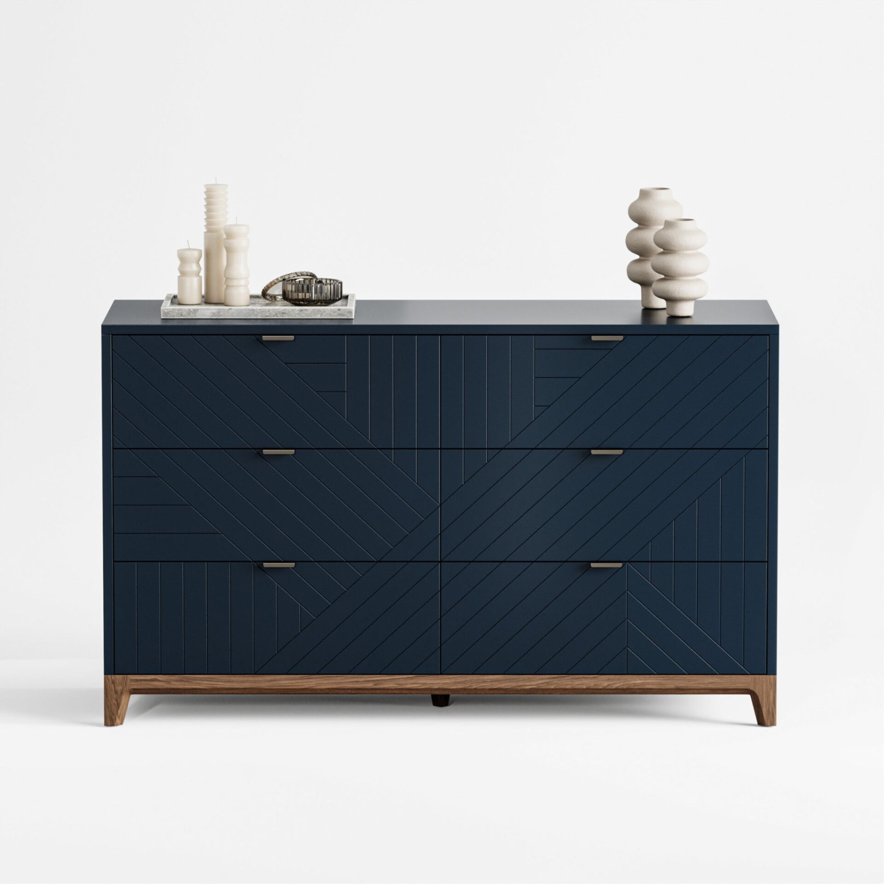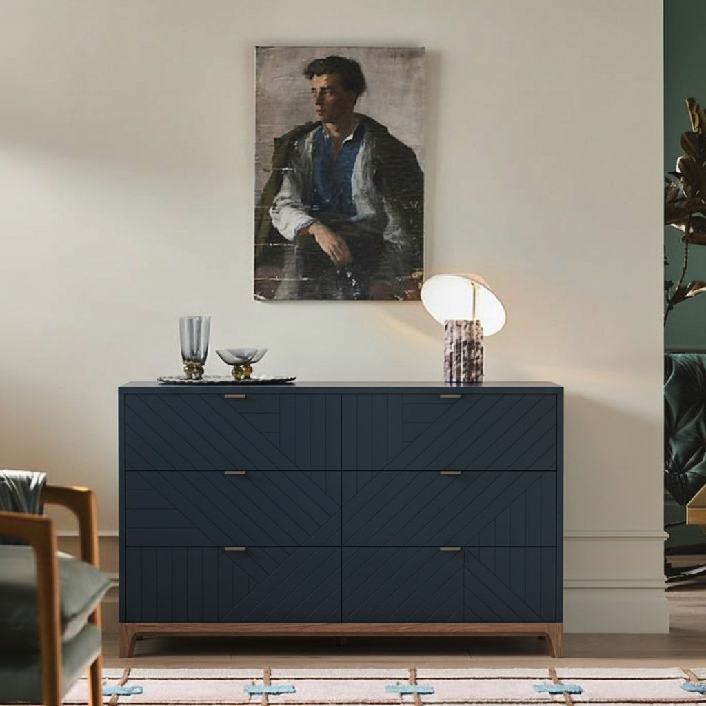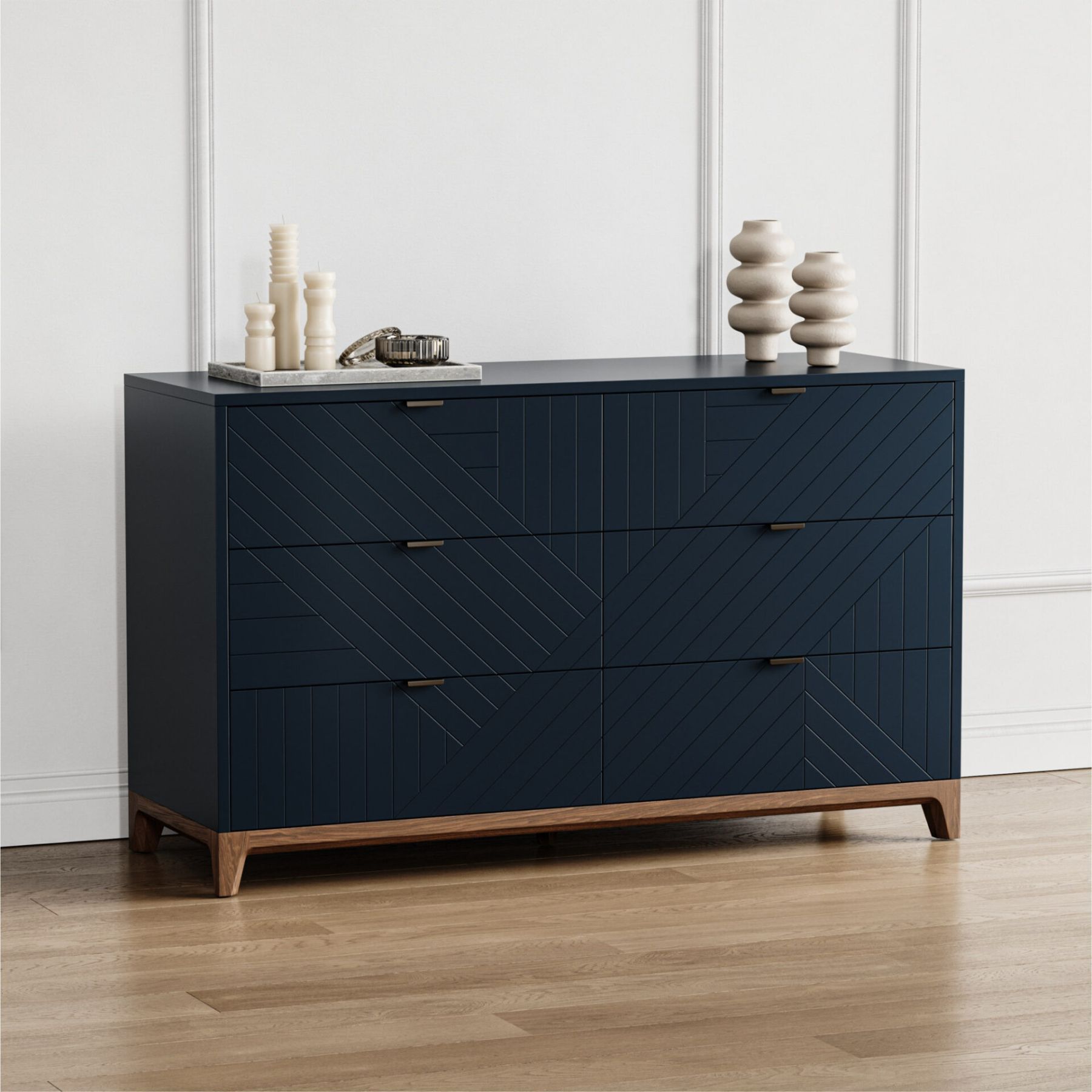 Комод с шестью выдвижными ящиками будет незаменим для хранения вещей в спальне и других помещениях. Прочные и вместительные ящики из ЛДСП, которые выдерживают вес до 25 кг помогут использовать пространство максимально эффективно, а фасады с объемной гравировкой и изящные ножки из массива дуба непременно украсят ваш интерьер.