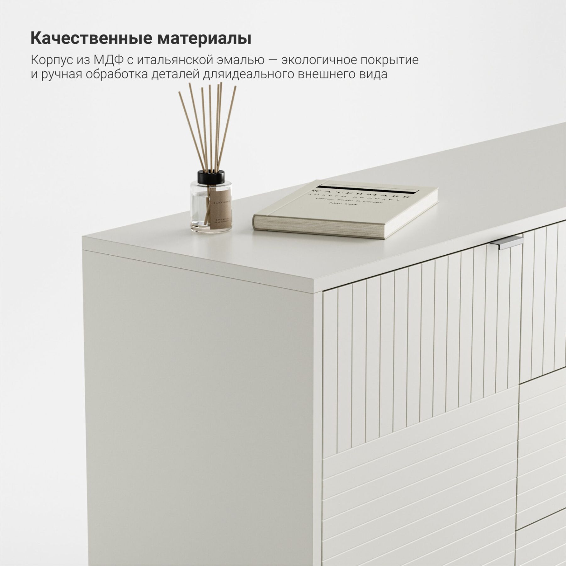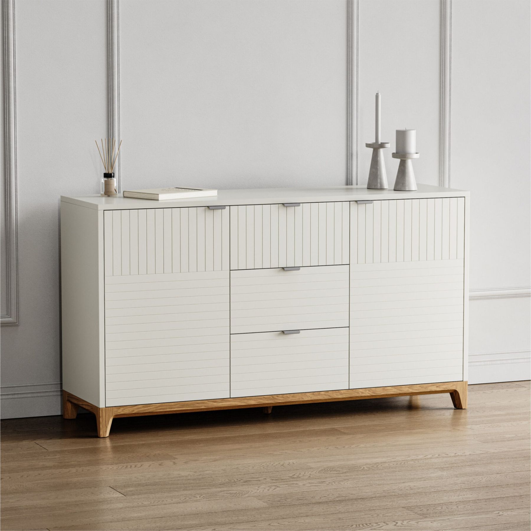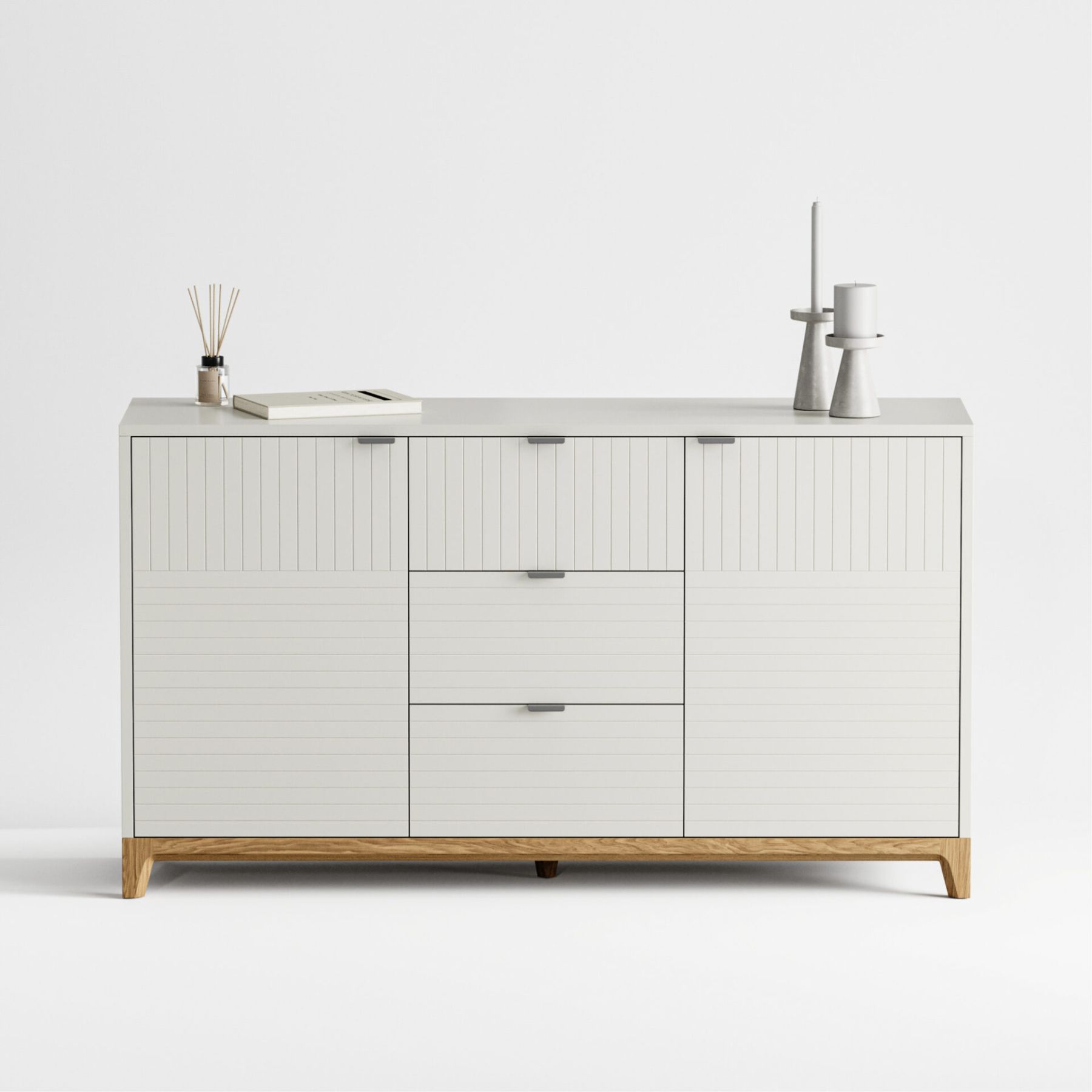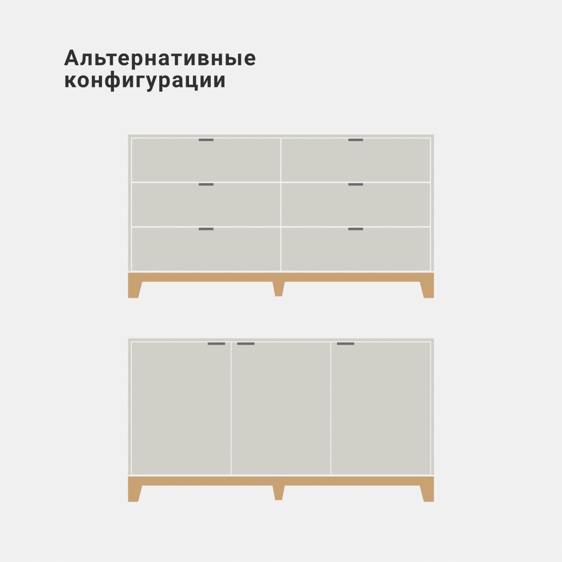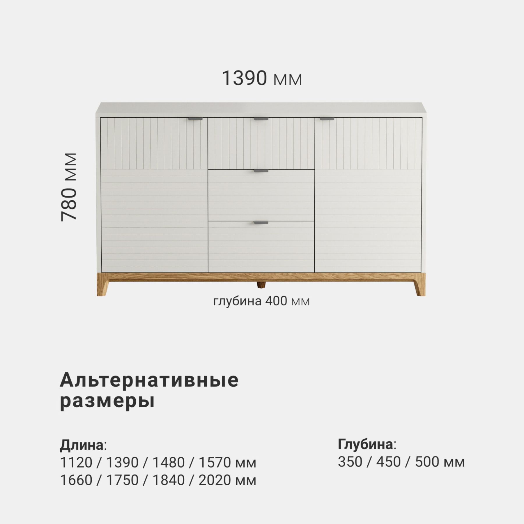 Основание и ножки выполнены из массива дуба, цвет которого вы можете выбрать из нескольких вариантов. Корпус комода может быть покрыт эмалью или натуральным шпоном дуба. Фасады могут быть покрыты эмалью с / без гравировки или натуральным шпоном дуба.