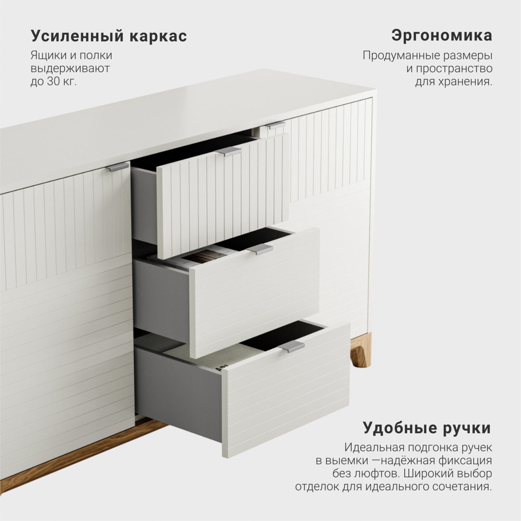 Усиленные каркасы ящиков из ЛДСП выдерживают вес до 30кг;