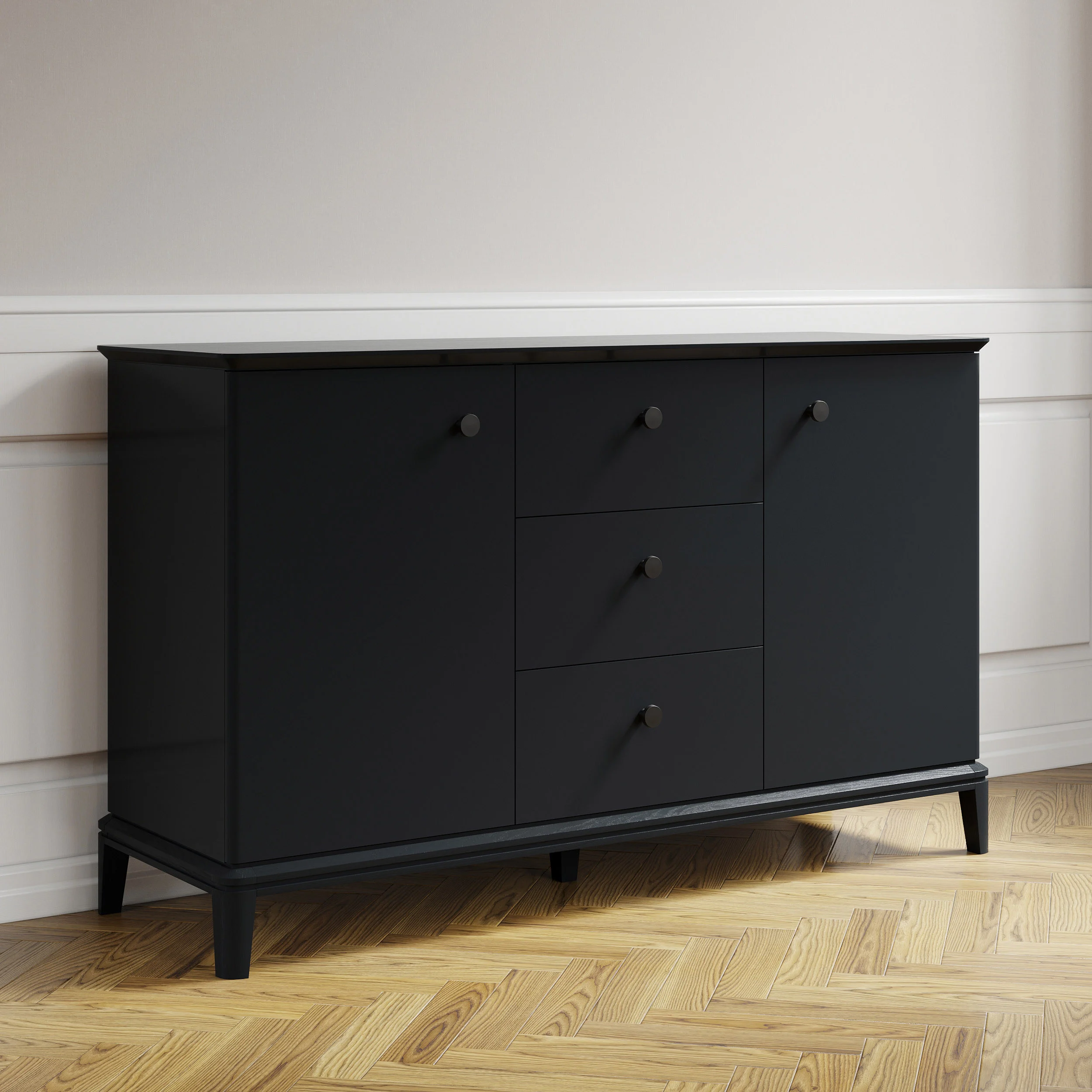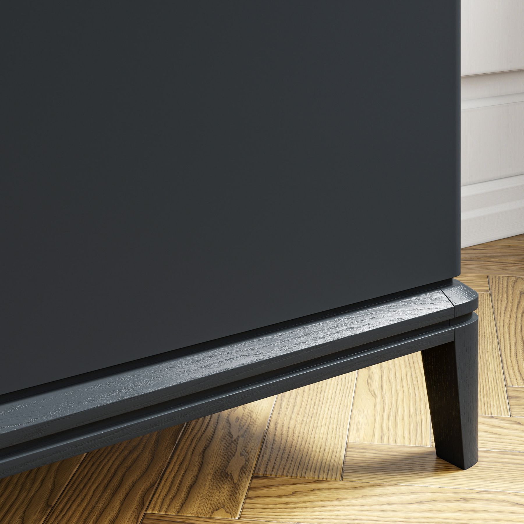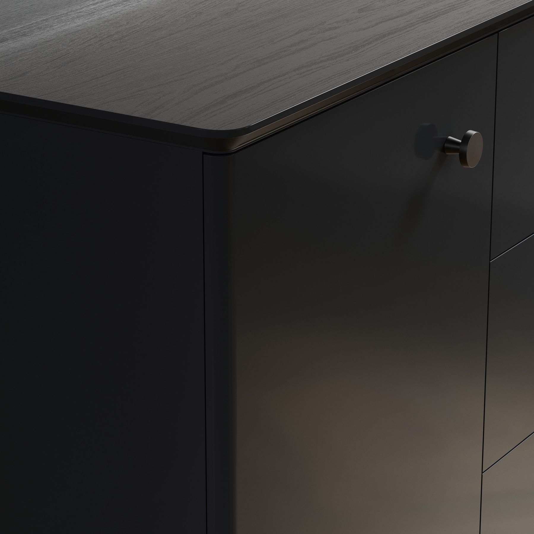 Комод оснащен 3—мя вместительными ящиками и секциями с полками, скрытыми за фасадами, украшенными гравировкой и ручками в отделке «брашированное золото». Тонированное основание из массива дуба и эмалированная столешница с многогранной ступенчатой фрезеровкой демонстрируют утонченную изысканность дизайна вне времени.