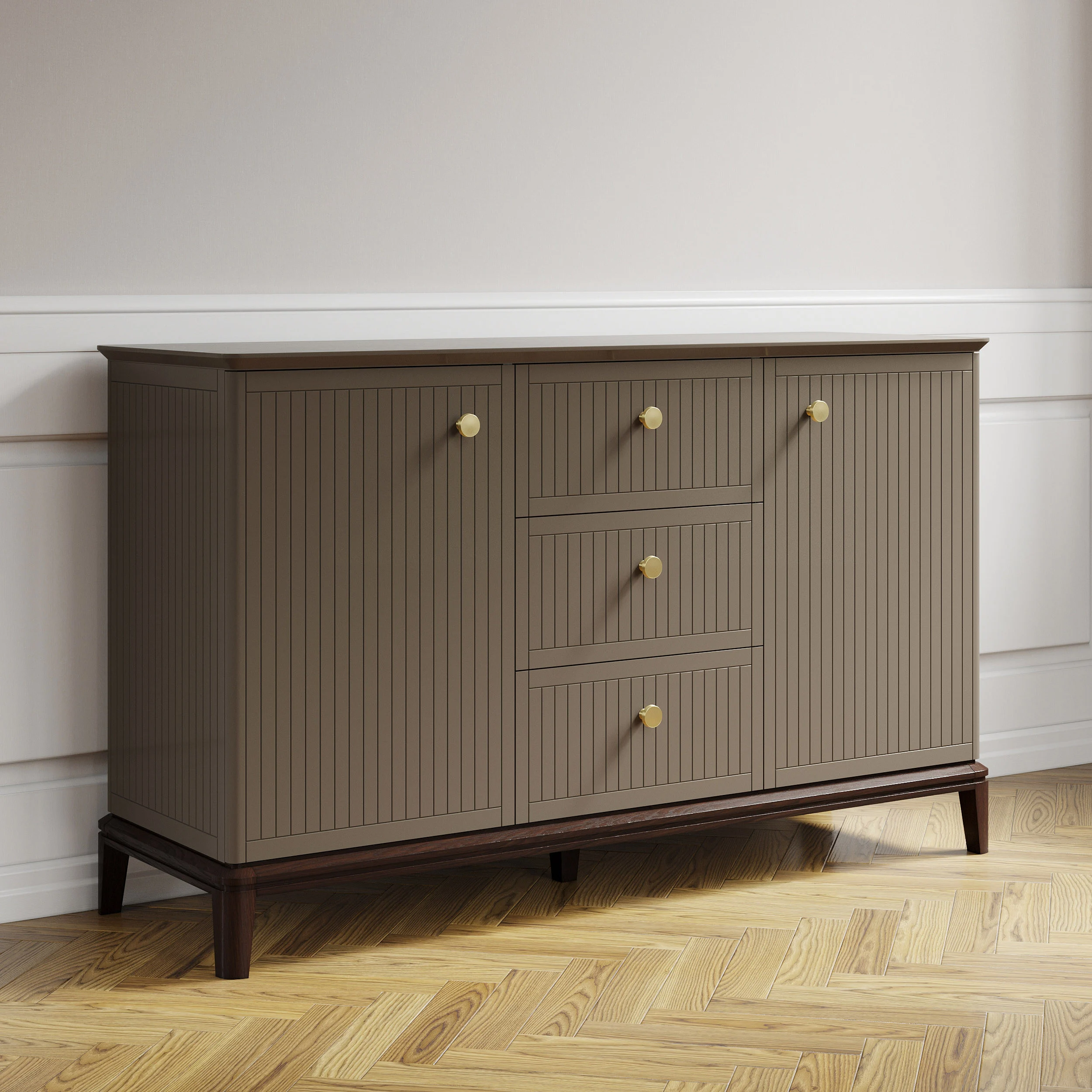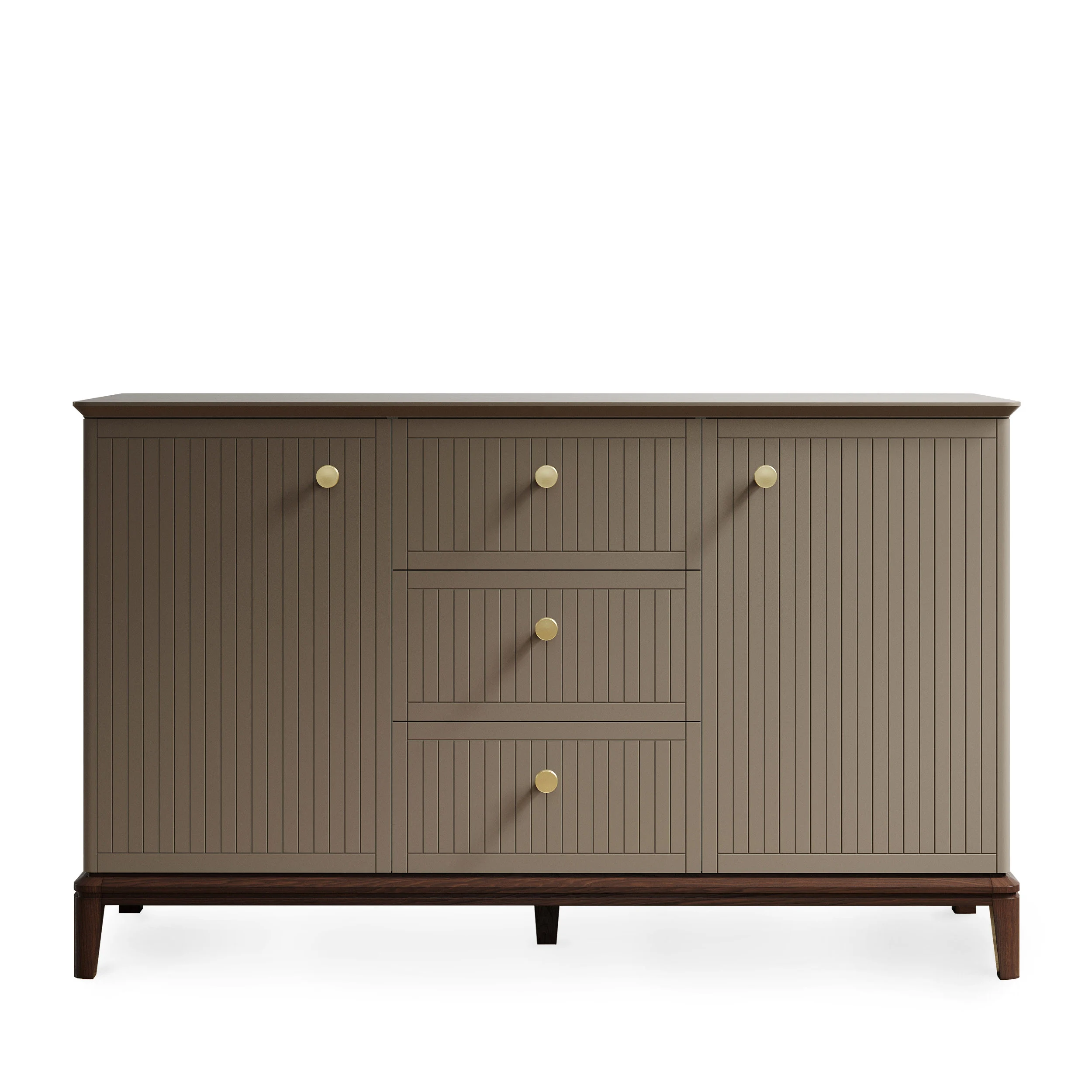 Комод оснащен 3—мя вместительными ящиками и секциями с полками, скрытыми за фасадами, украшенными гравировкой и ручками в отделке «брашированное золото». Тонированное основание из массива дуба и эмалированная столешница с многогранной ступенчатой фрезеровкой демонстрируют утонченную изысканность дизайна вне времени.