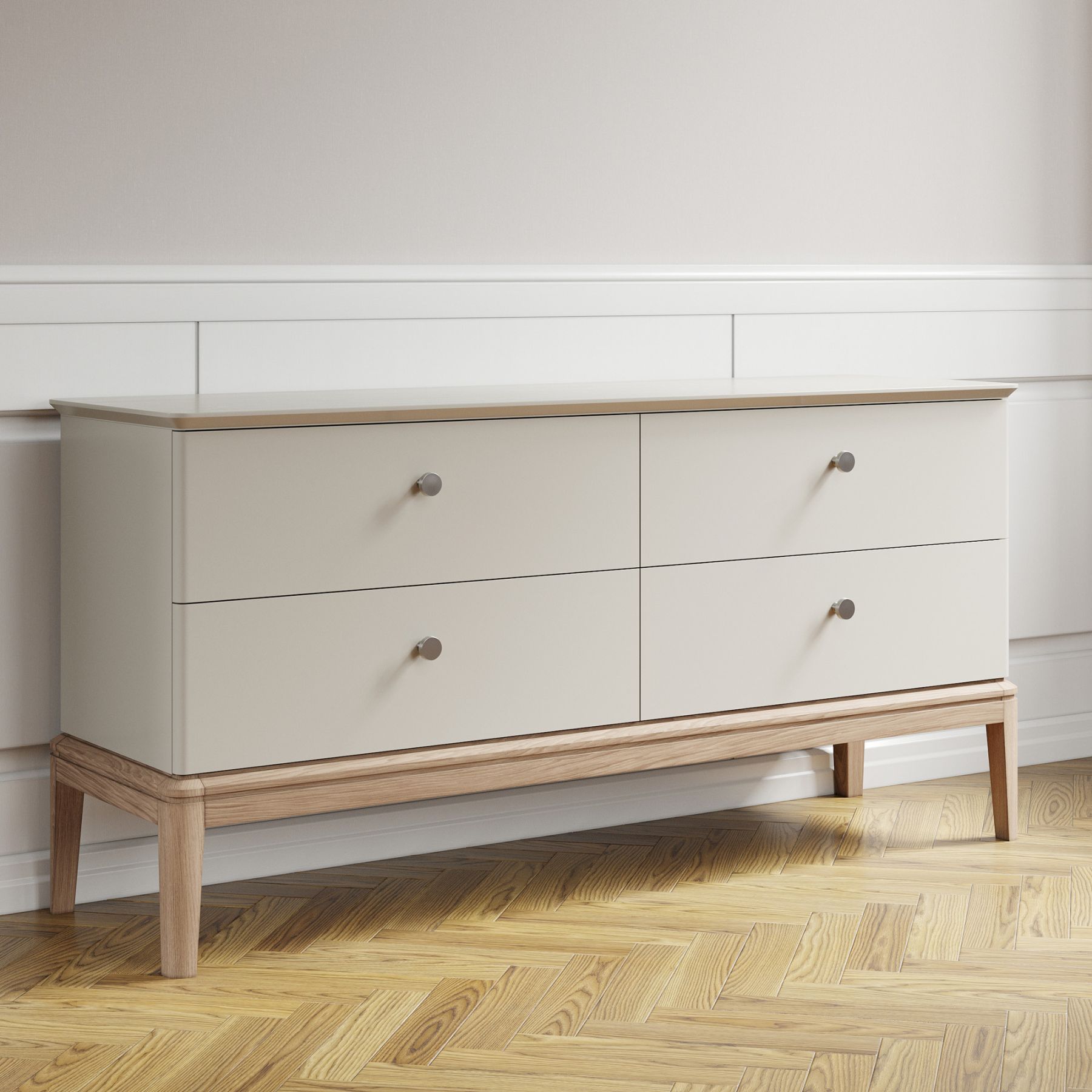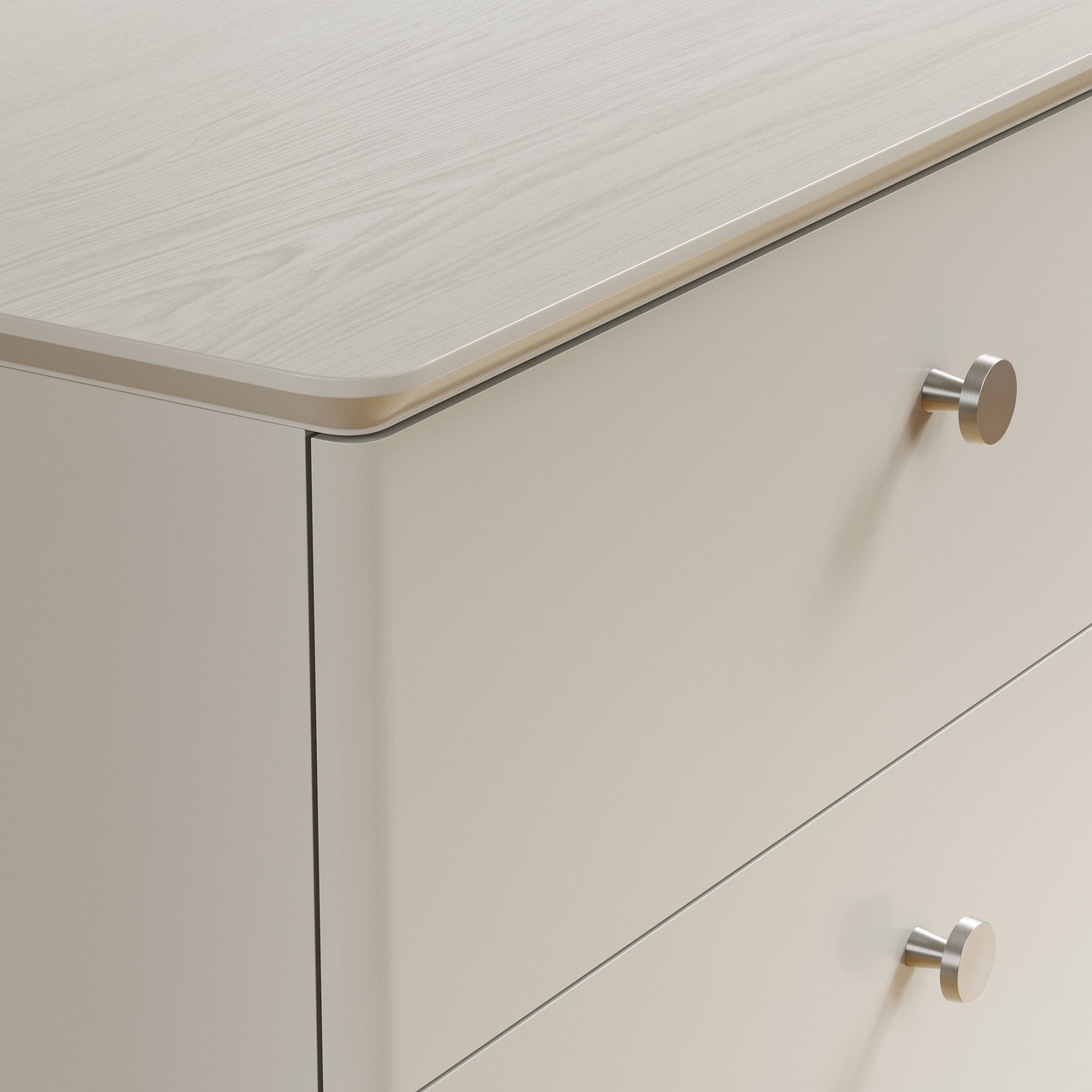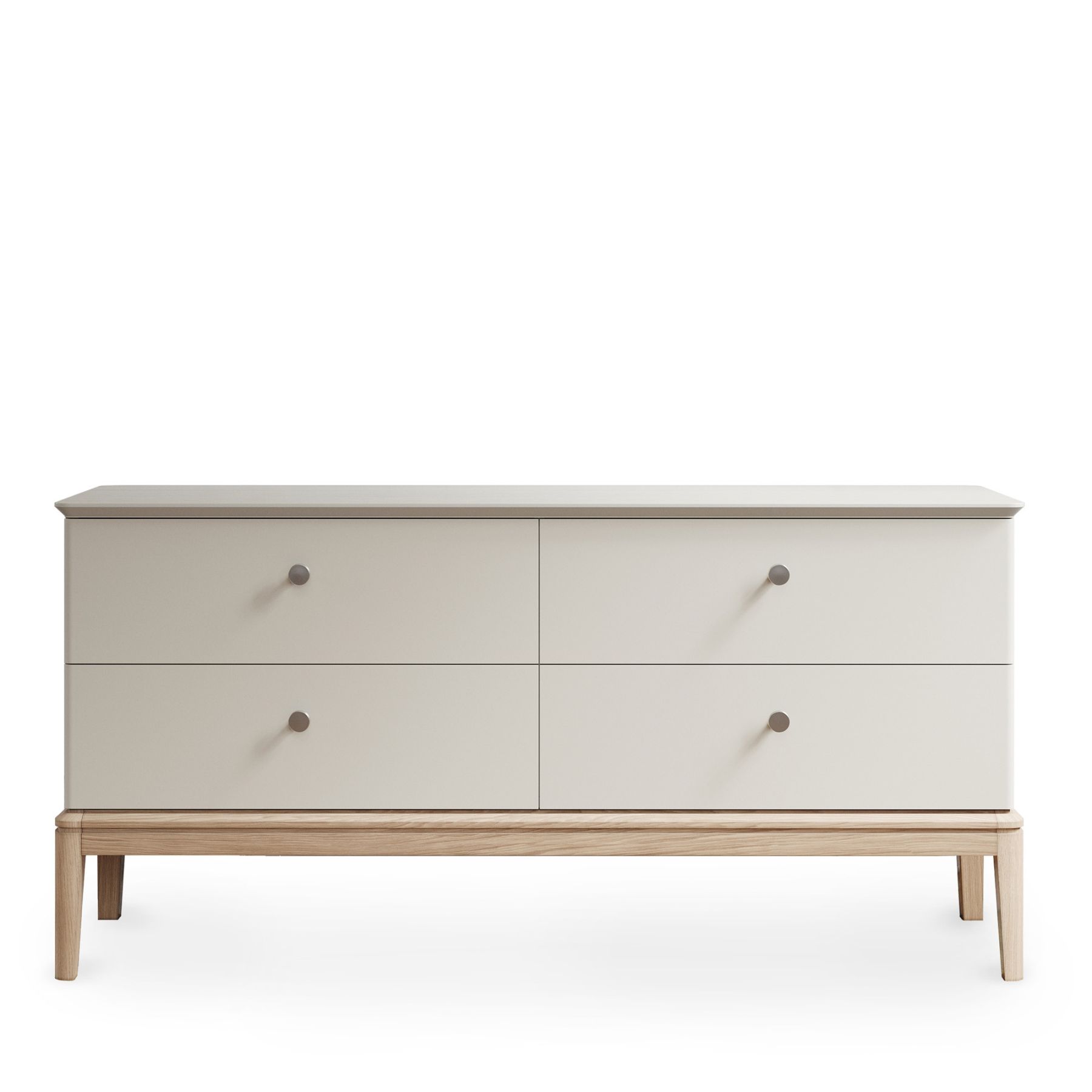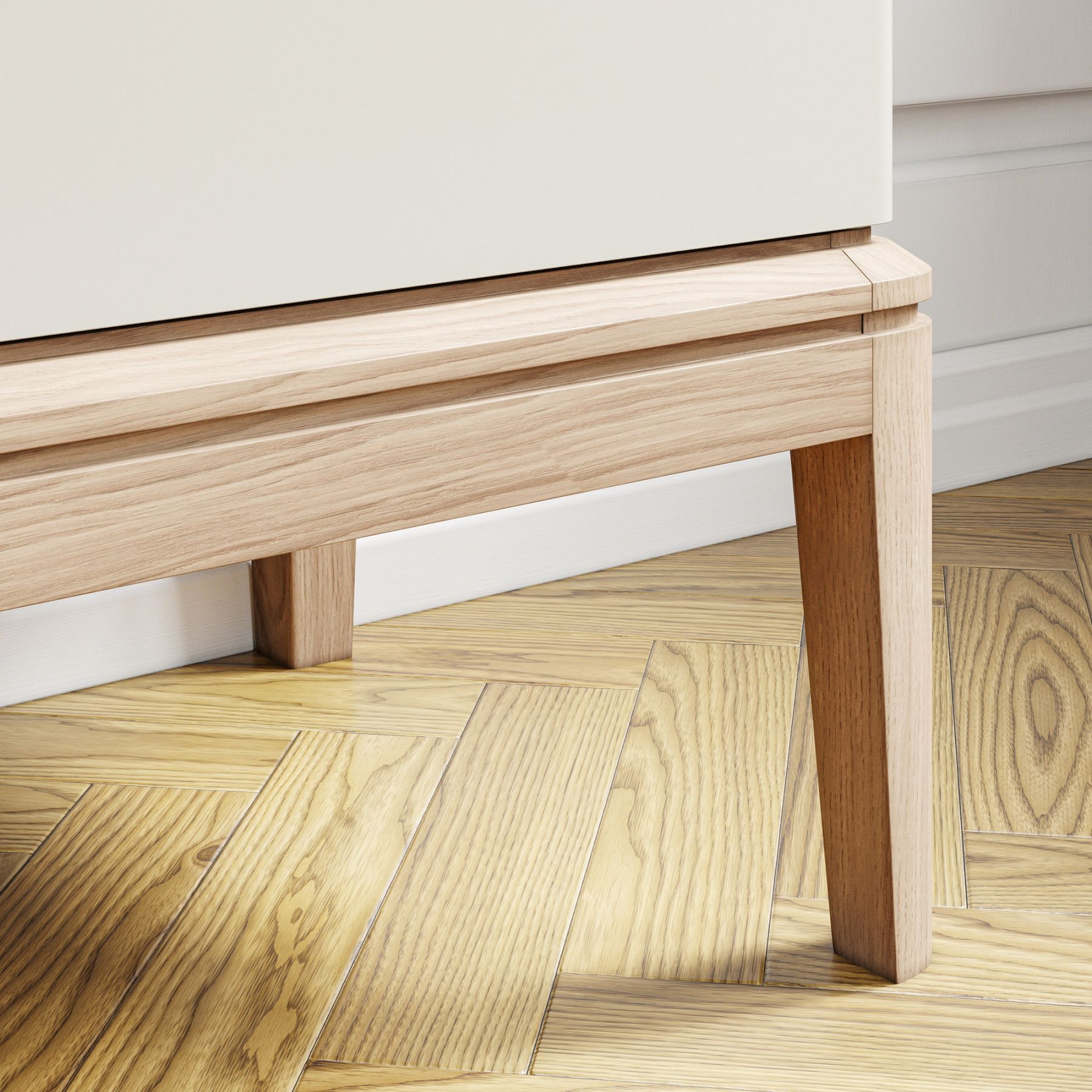 Комод оснащен 3—мя вместительными ящиками и секциями с полками, скрытыми за фасадами, украшенными гравировкой и ручками в отделке «брашированное золото». Тонированное основание из массива дуба и эмалированная столешница с многогранной ступенчатой фрезеровкой демонстрируют утонченную изысканность дизайна вне времени.