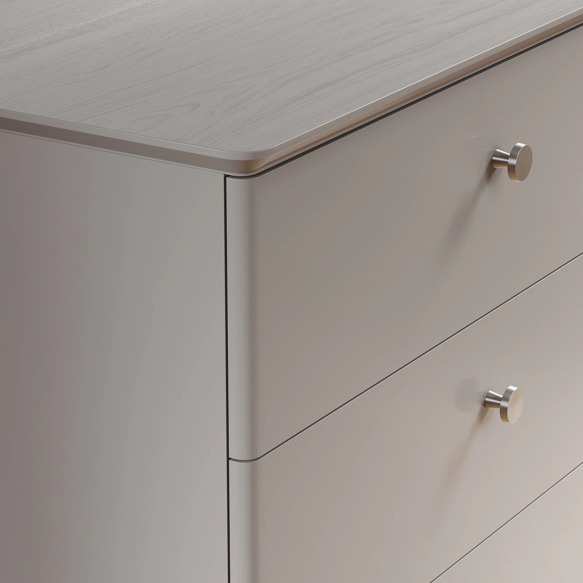 Комод оснащен 3—мя вместительными ящиками и секциями с полками, скрытыми за фасадами, украшенными гравировкой и ручками в отделке «брашированное золото». Тонированное основание из массива дуба и эмалированная столешница с многогранной ступенчатой фрезеровкой демонстрируют утонченную изысканность дизайна вне времени.
