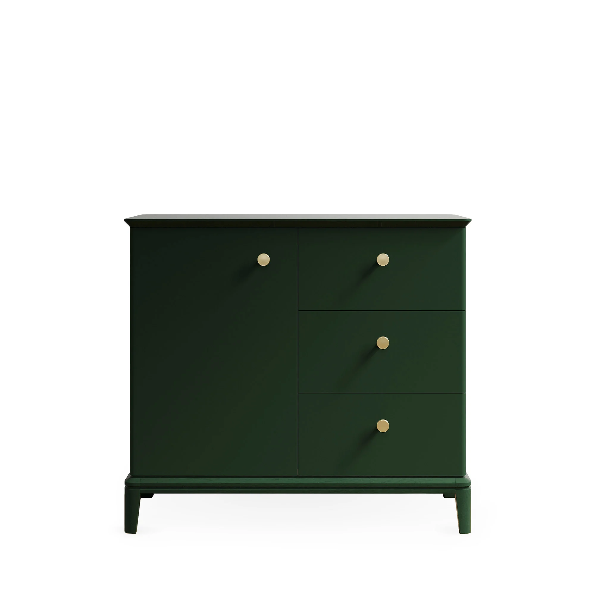 Комод оснащен тремя ящиками и секциями с полками, скрытыми за фасадами, украшенными гравировкой и ручками в четырех видах отделки. Тонированное основание из массива дуба и эмалированная столешница с многогранной ступенчатой фрезеровкой демонстрируют утонченную изысканность дизайна вне времени.