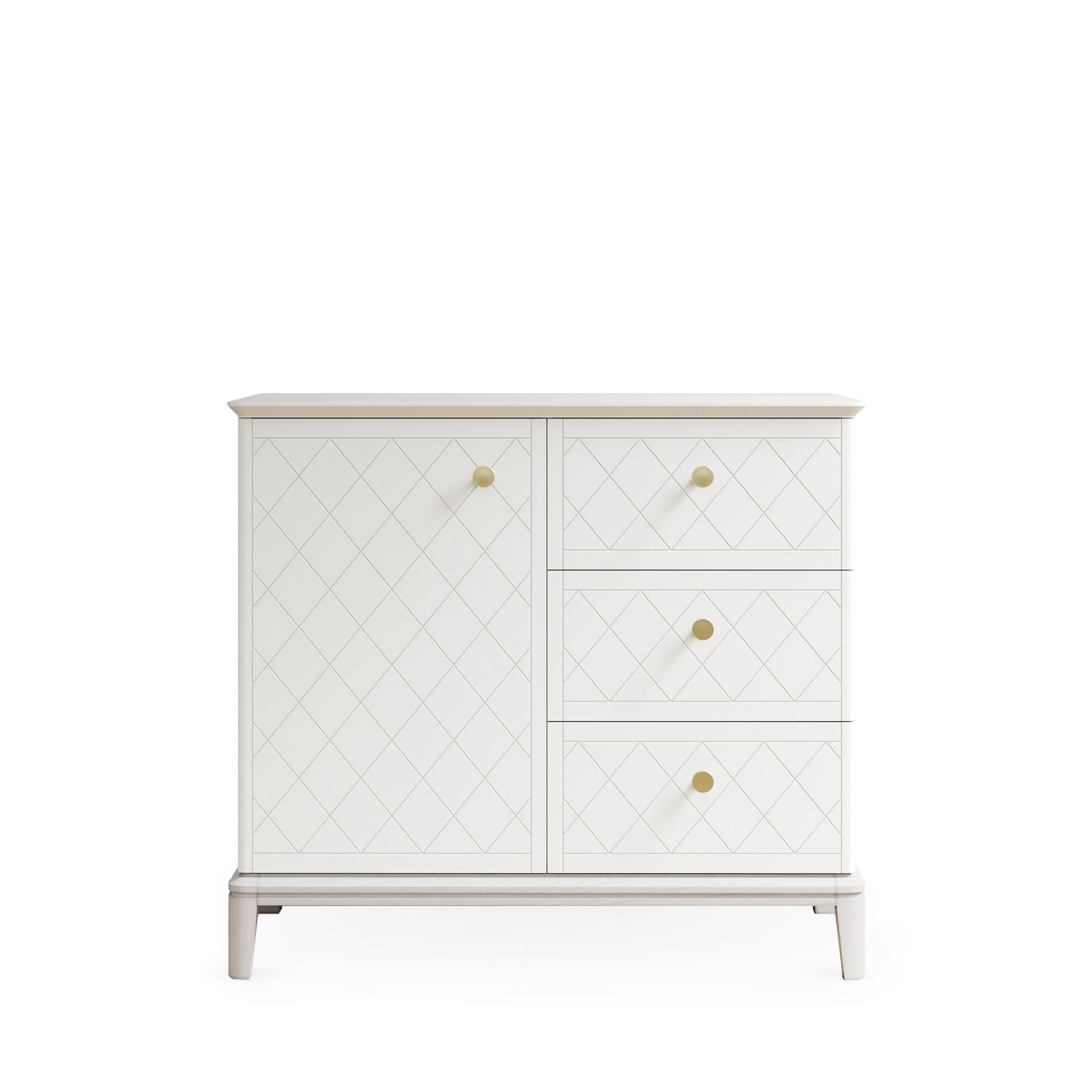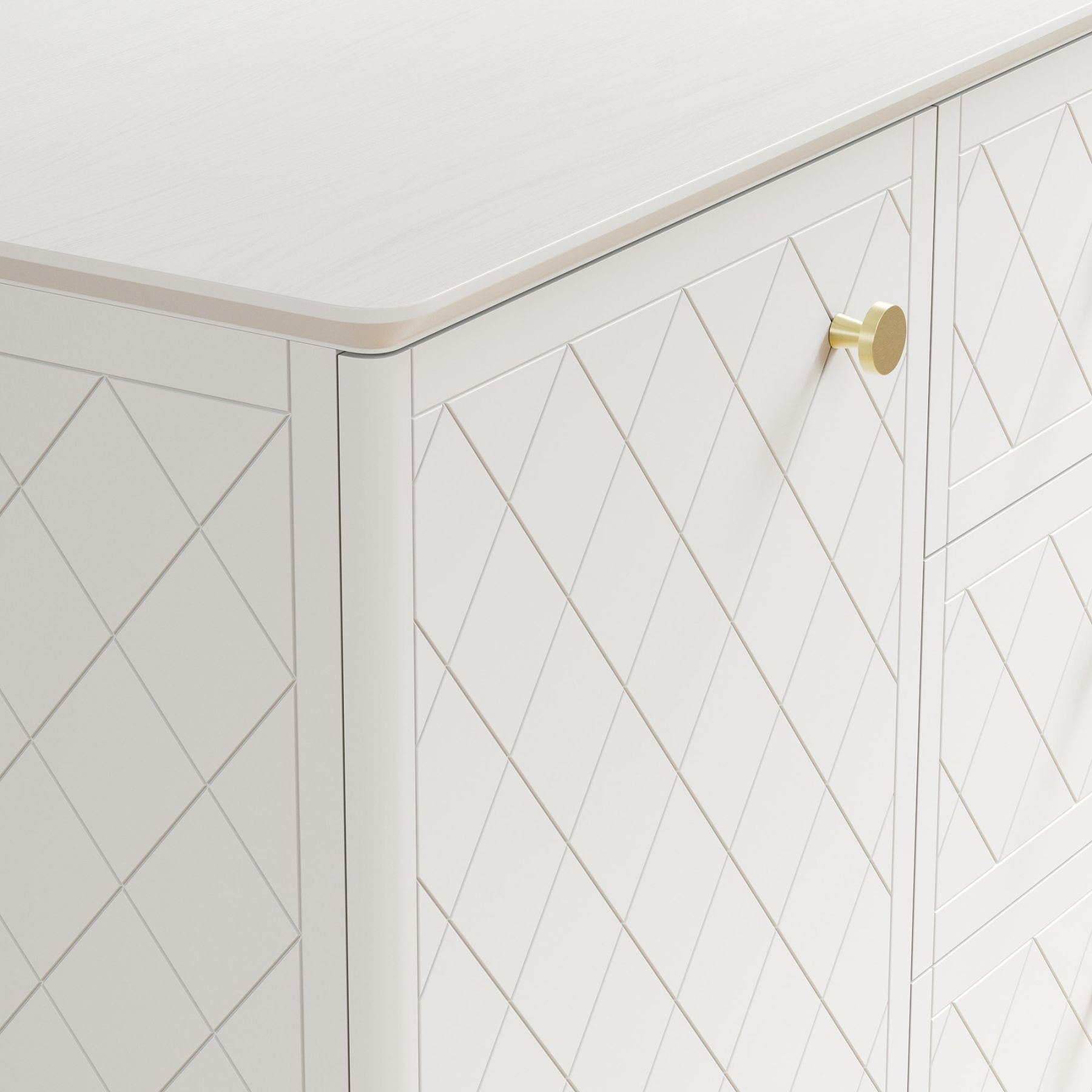 Комод оснащен тремя ящиками и секциями с полками, скрытыми за фасадами, украшенными гравировкой и ручками в четырех видах отделки. Тонированное основание из массива дуба и эмалированная столешница с многогранной ступенчатой фрезеровкой демонстрируют утонченную изысканность дизайна вне времени.