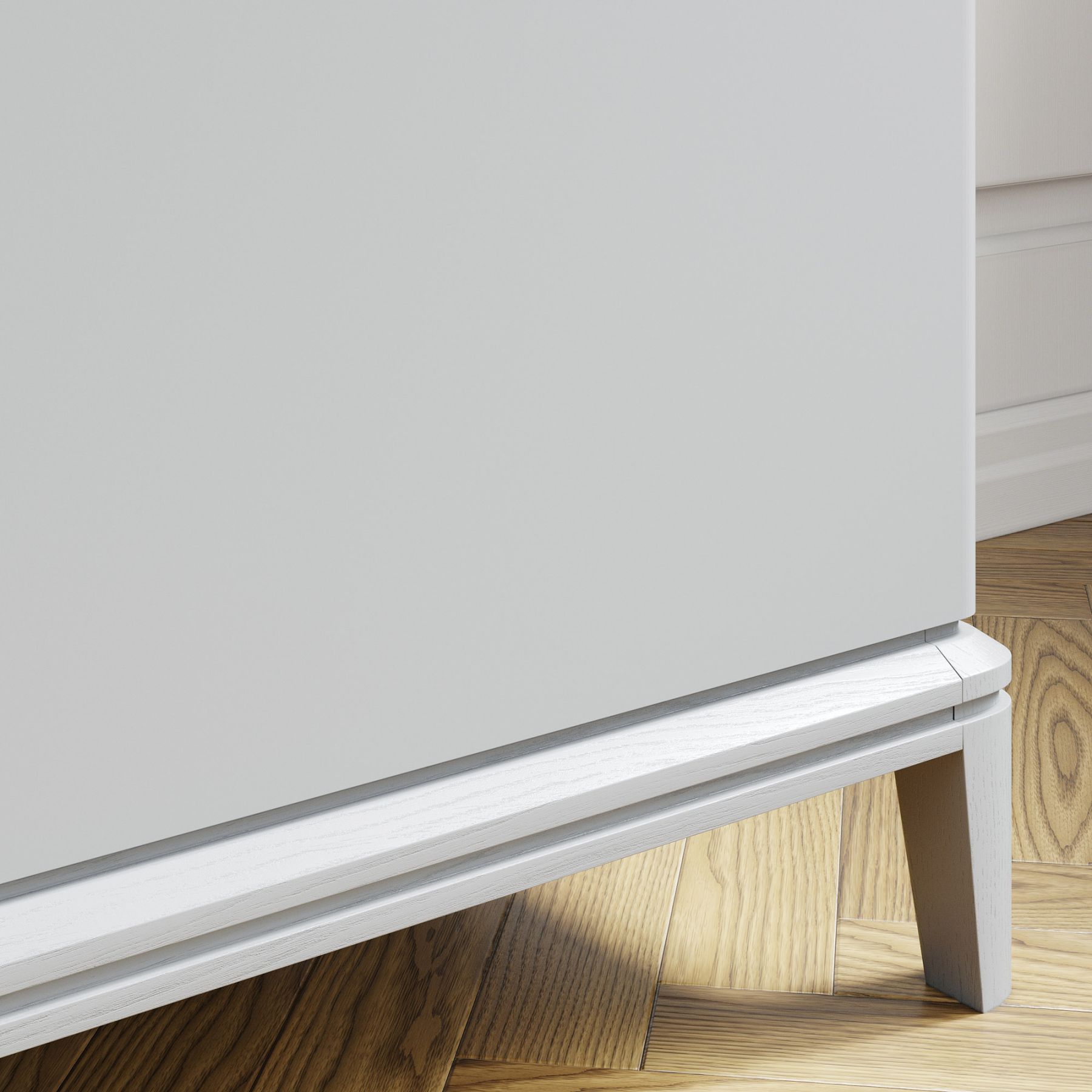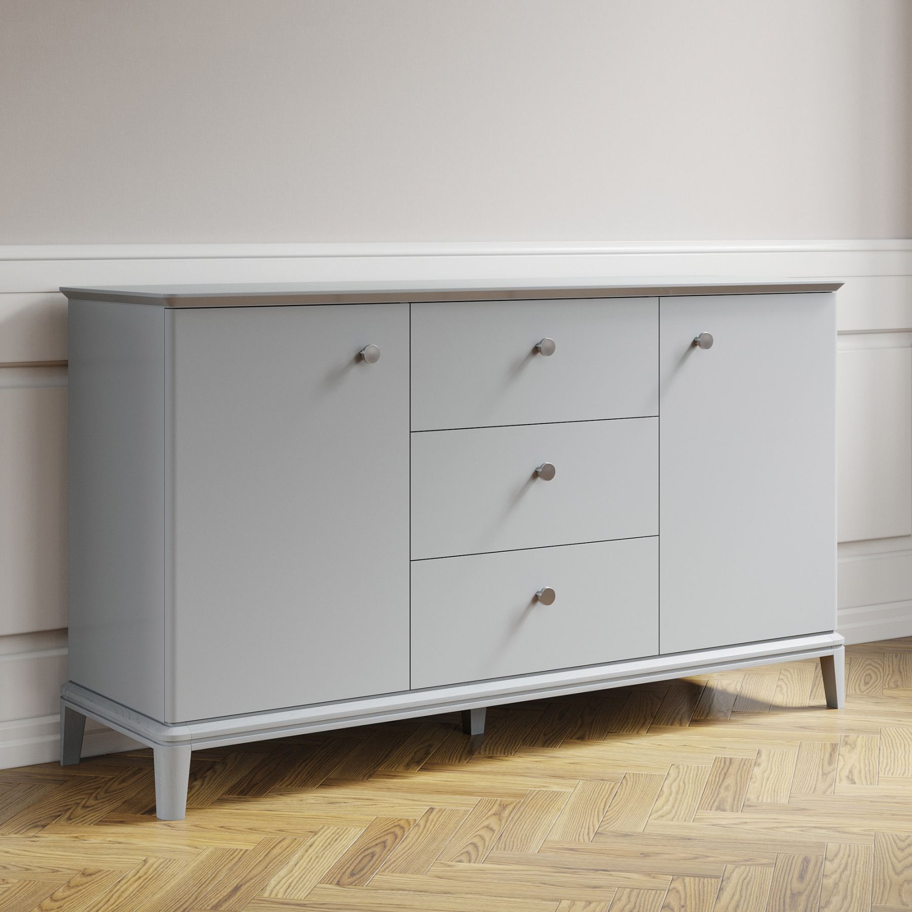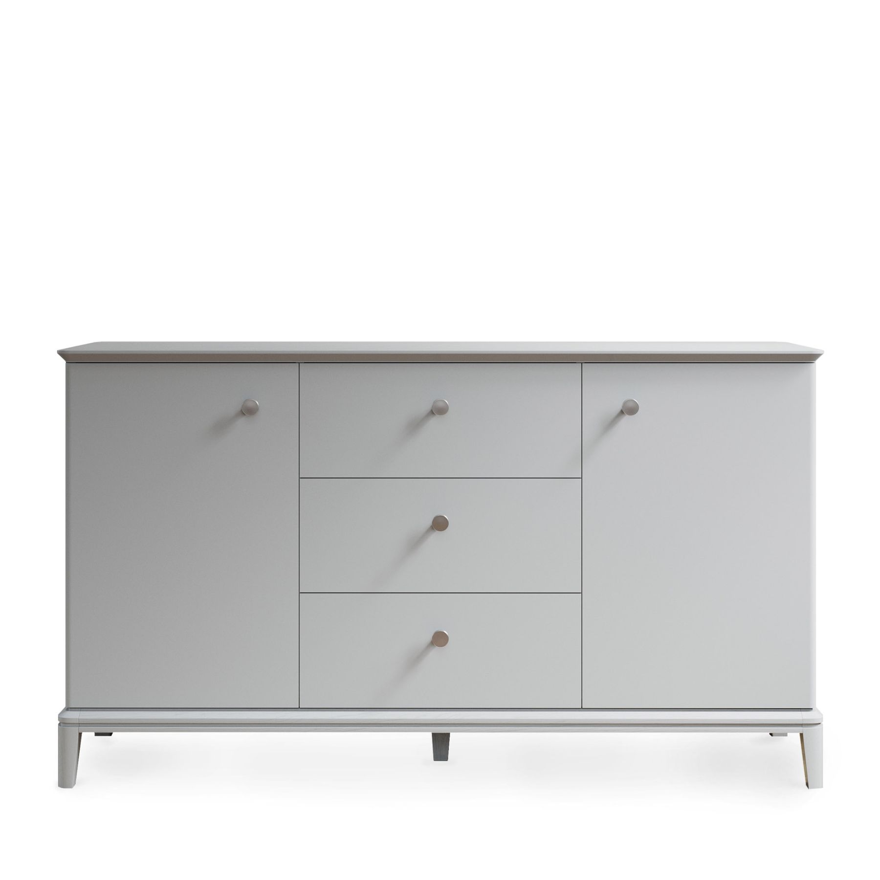 Комод оснащен 3—мя вместительными ящиками и секциями с полками, скрытыми за фасадами, украшенными гравировкой и ручками в четырех видах отделки. Тонированное основание из массива дуба и эмалированная столешница с многогранной ступенчатой фрезеровкой демонстрируют утонченную изысканность дизайна вне времени.