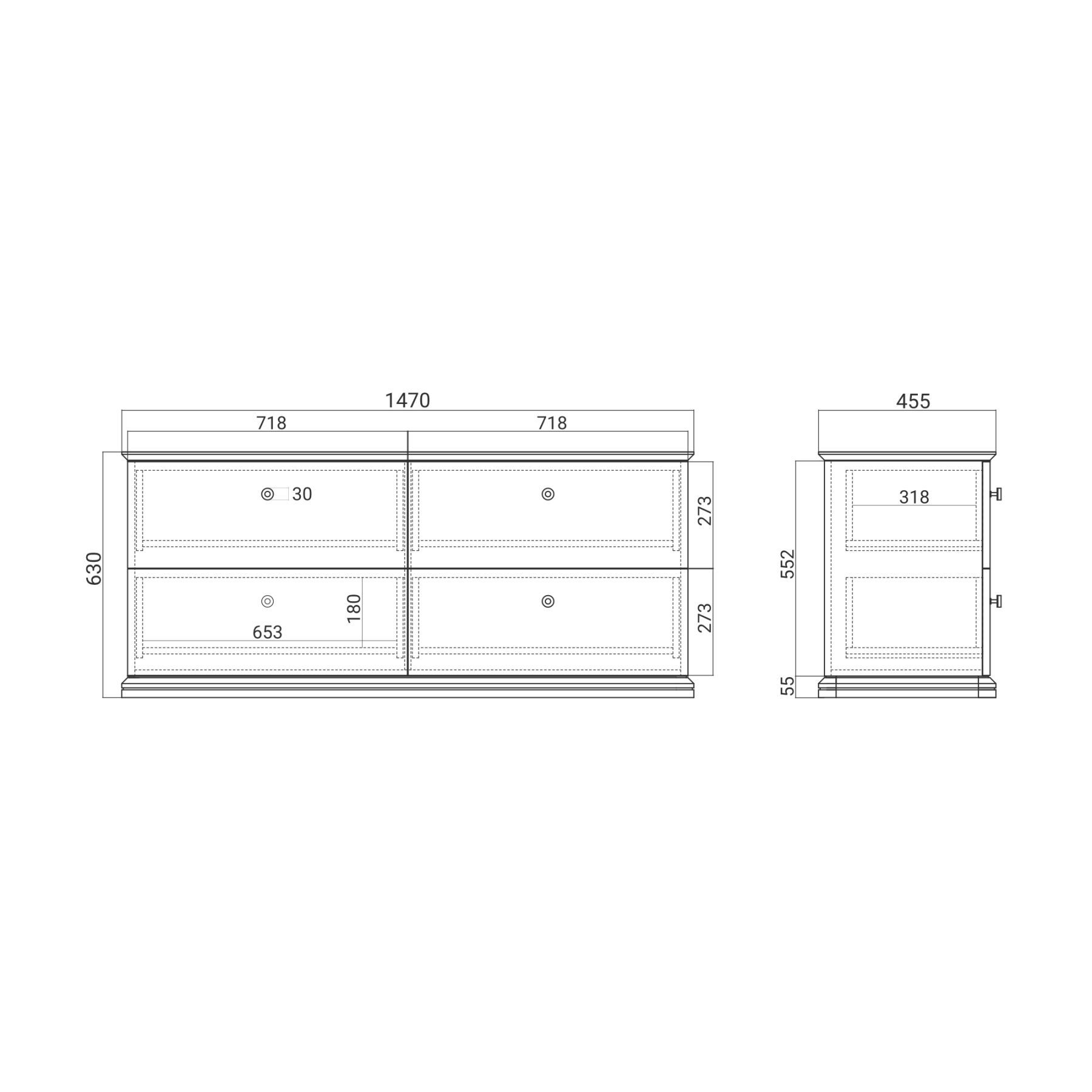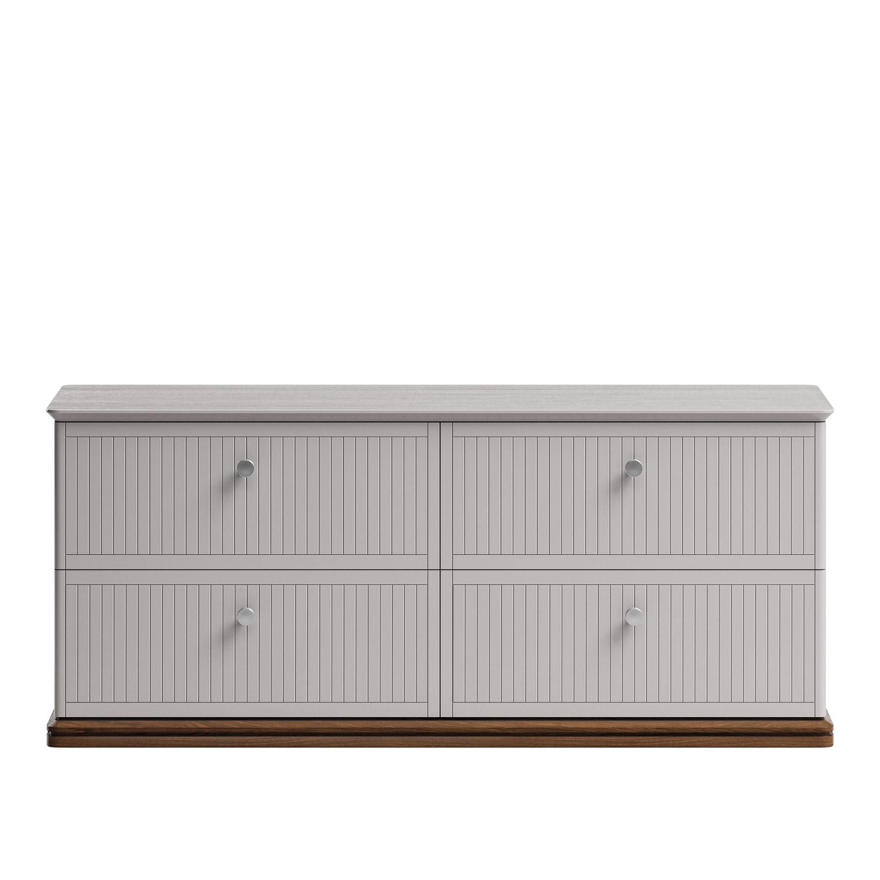 Комод оснащен 4—мя вместительными ящиками для удобного хранения ваших вещей. Изделие украшают гладкие фасады и ручки в стильной отделке. Основание из массива дуба с многогранной ступенчатой фрезеровкой и высокими ножками демонстрируют утонченную изысканность дизайна вне времени.