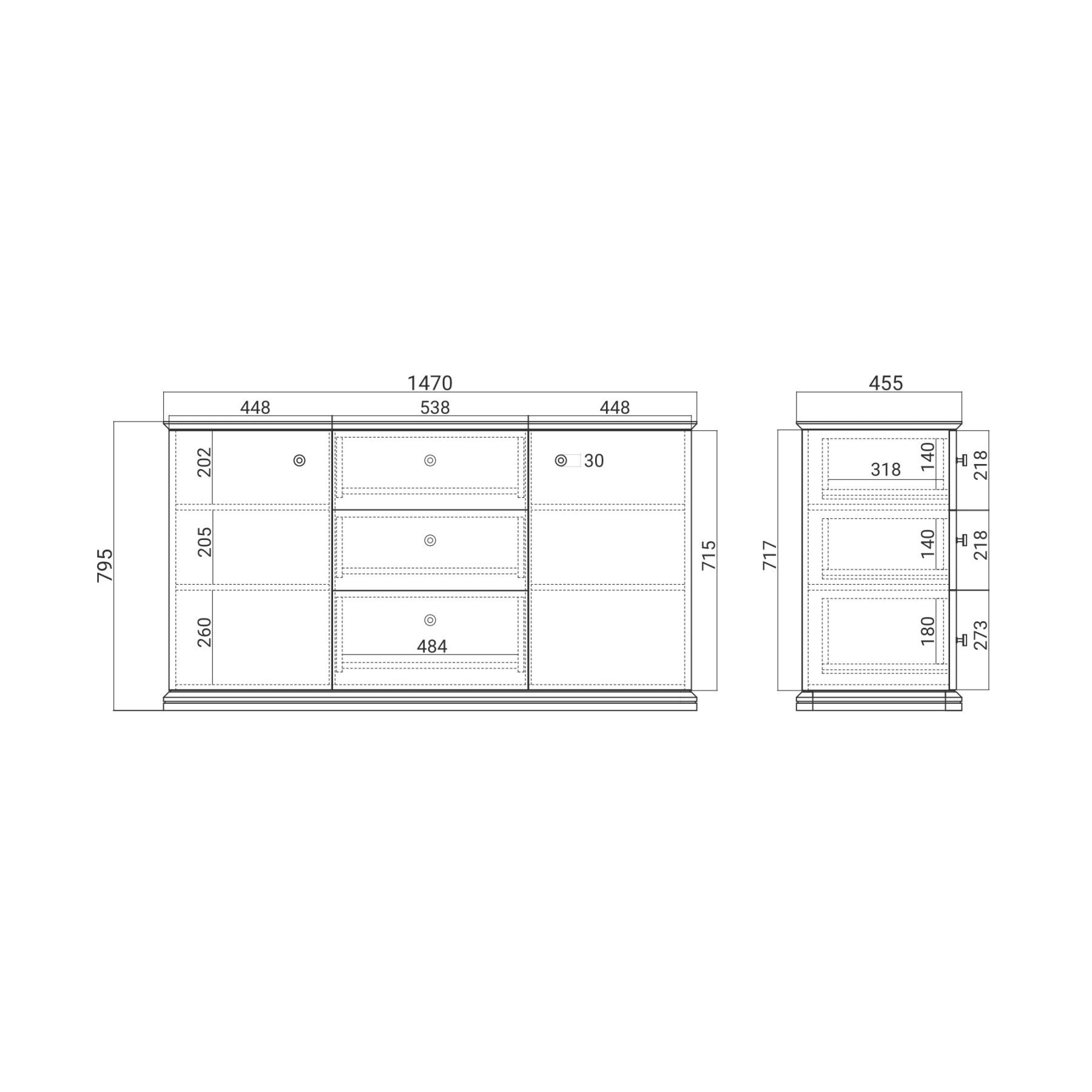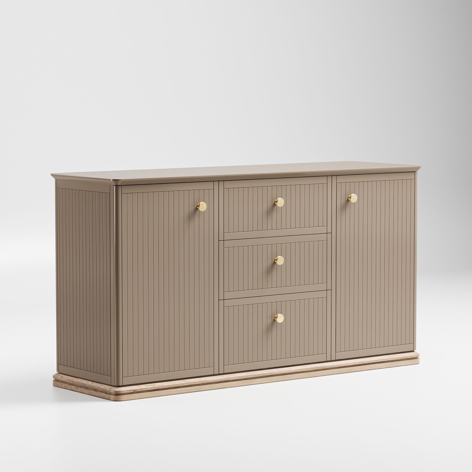 Комод оснащен тремя вместительными ящиками и секциями с полками, скрытыми за фасадами, украшенными гравировкой и ручками в четырех видах отделки. Тонированное основание из массива дуба и эмалированная столешница с многогранной ступенчатой фрезеровкой демонстрируют утонченную изысканность дизайна вне времени.