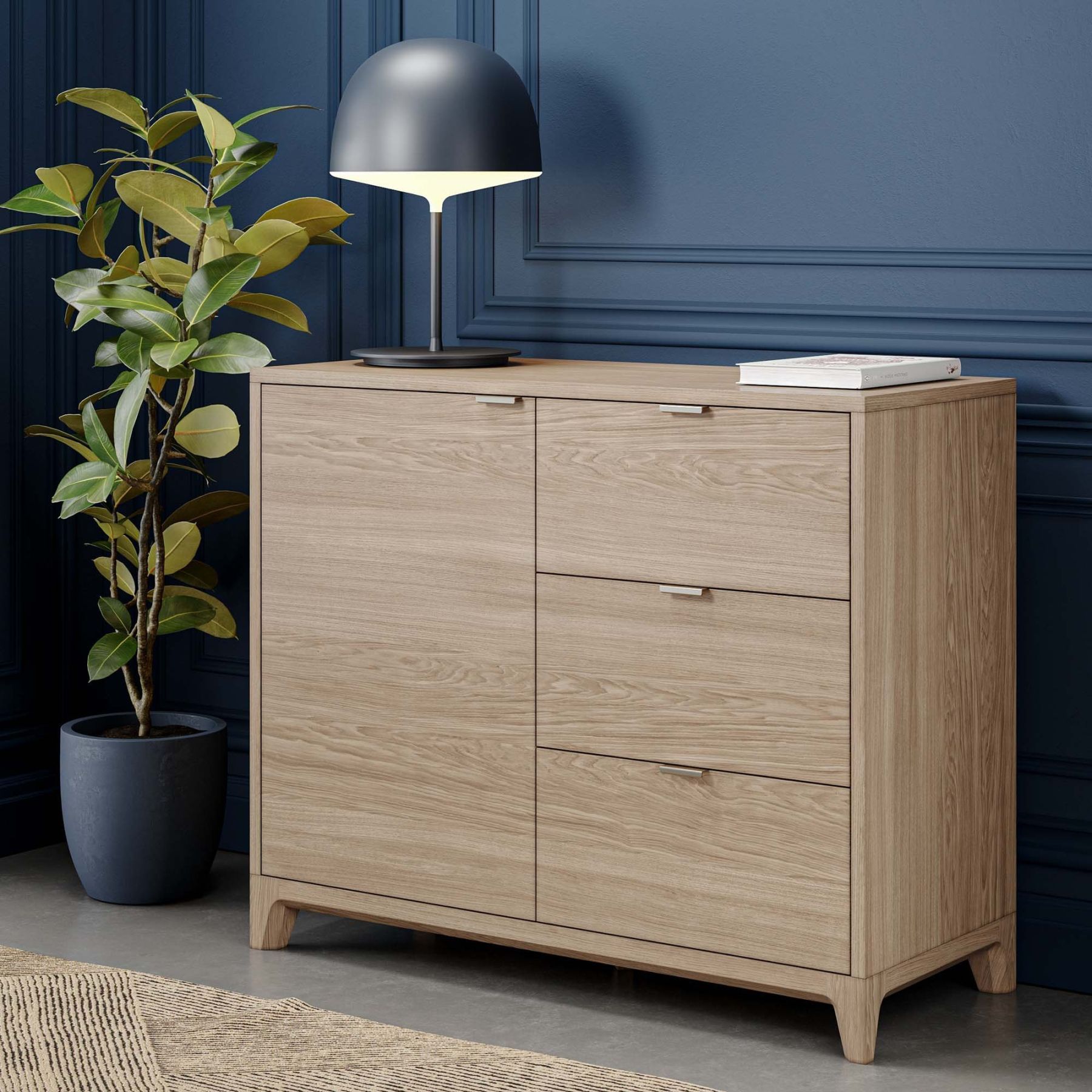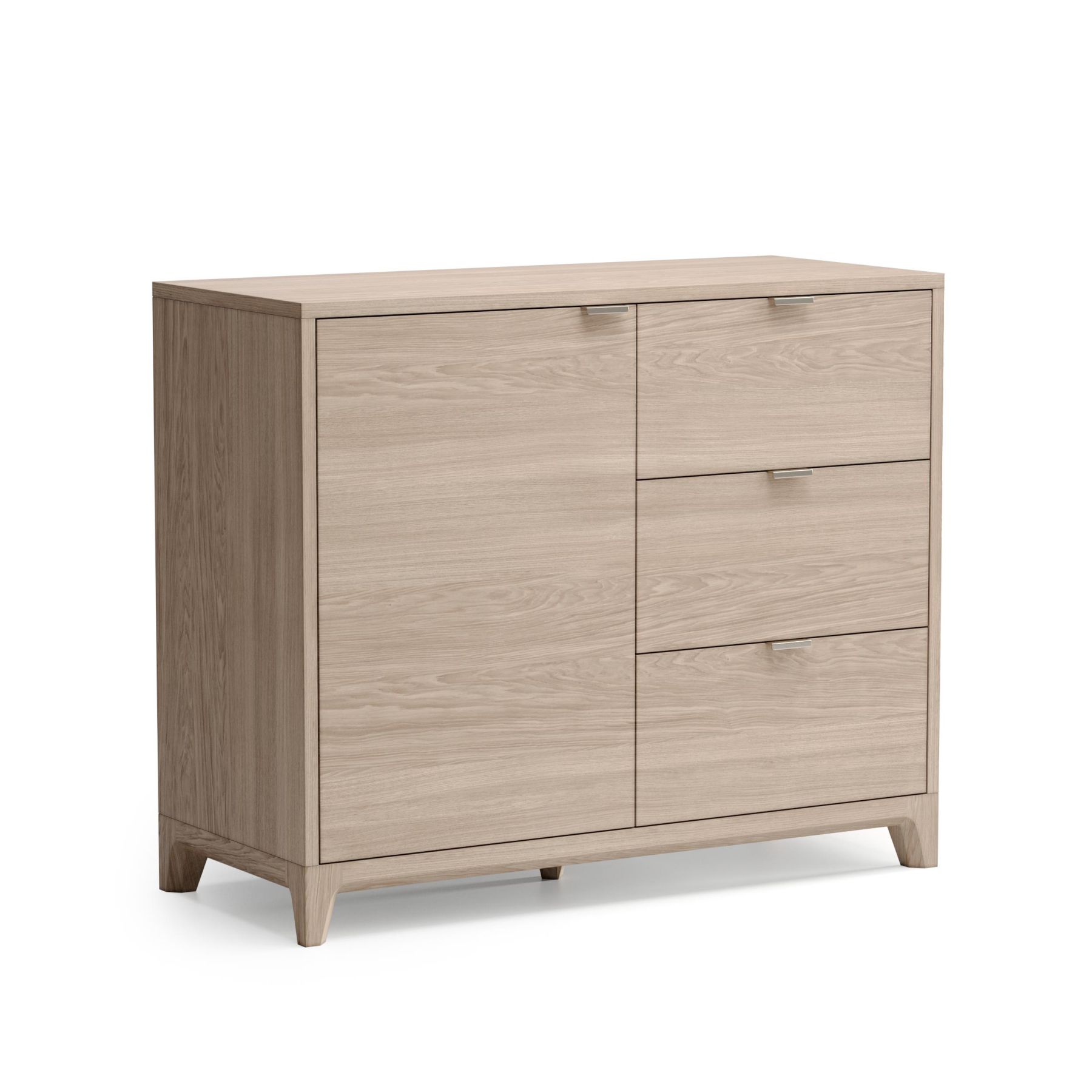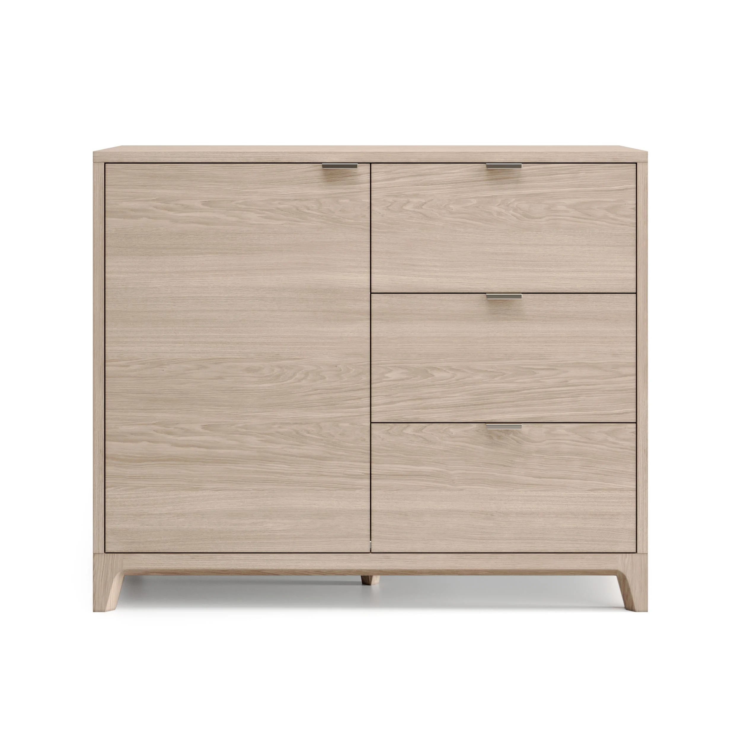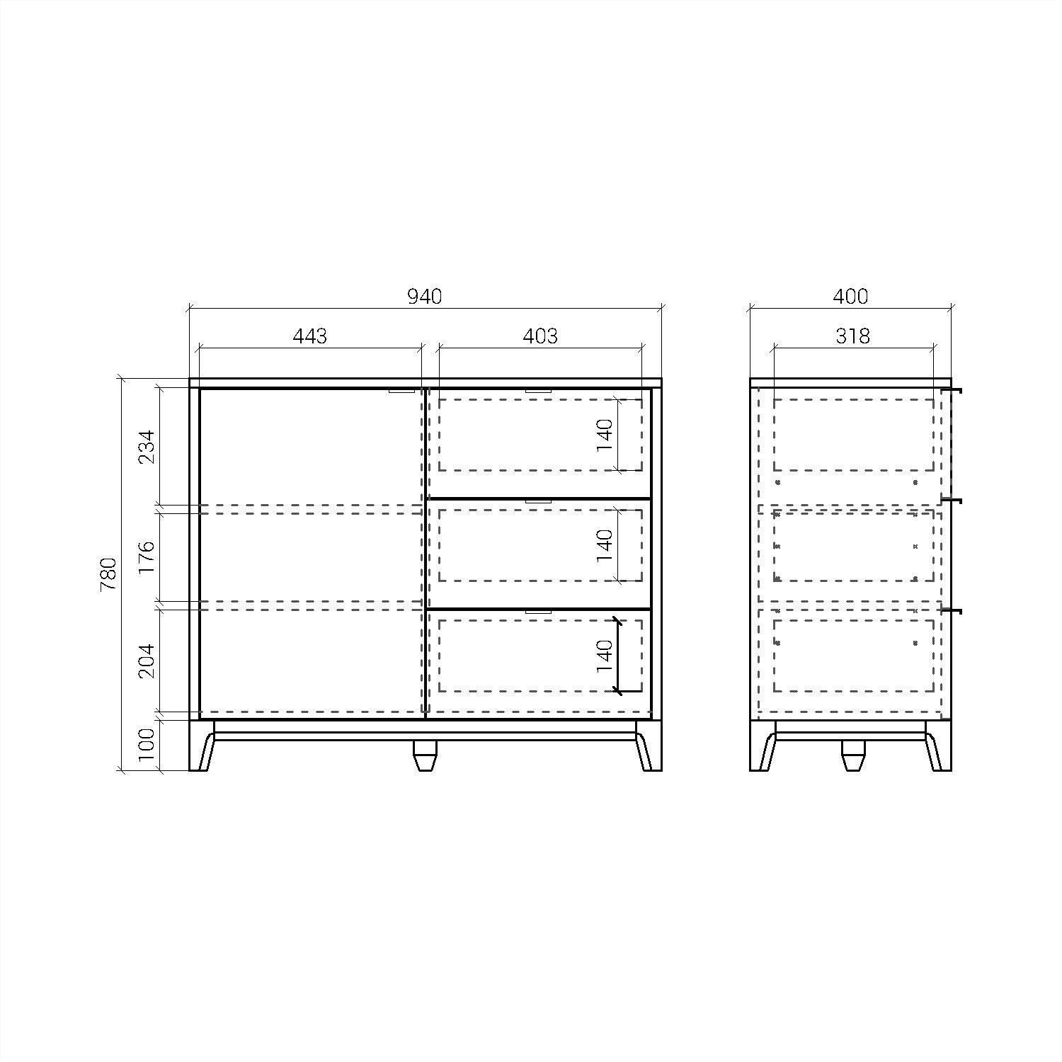 Продуманное наполнение из трёх вместительных ящиков и секции с полками позволяют использовать этот комод в разных помещениях — как в прихожей, так и в гостиной или спальне.