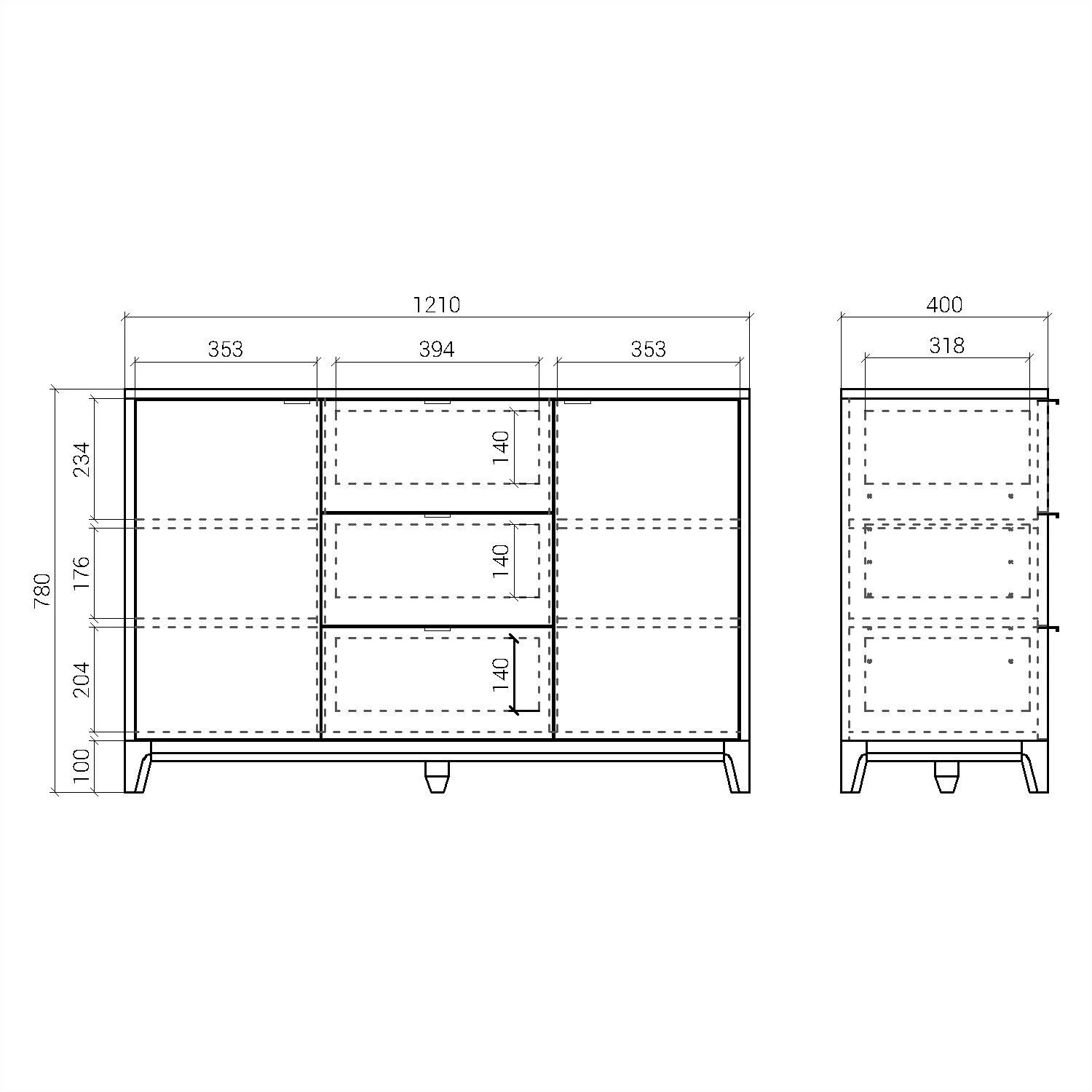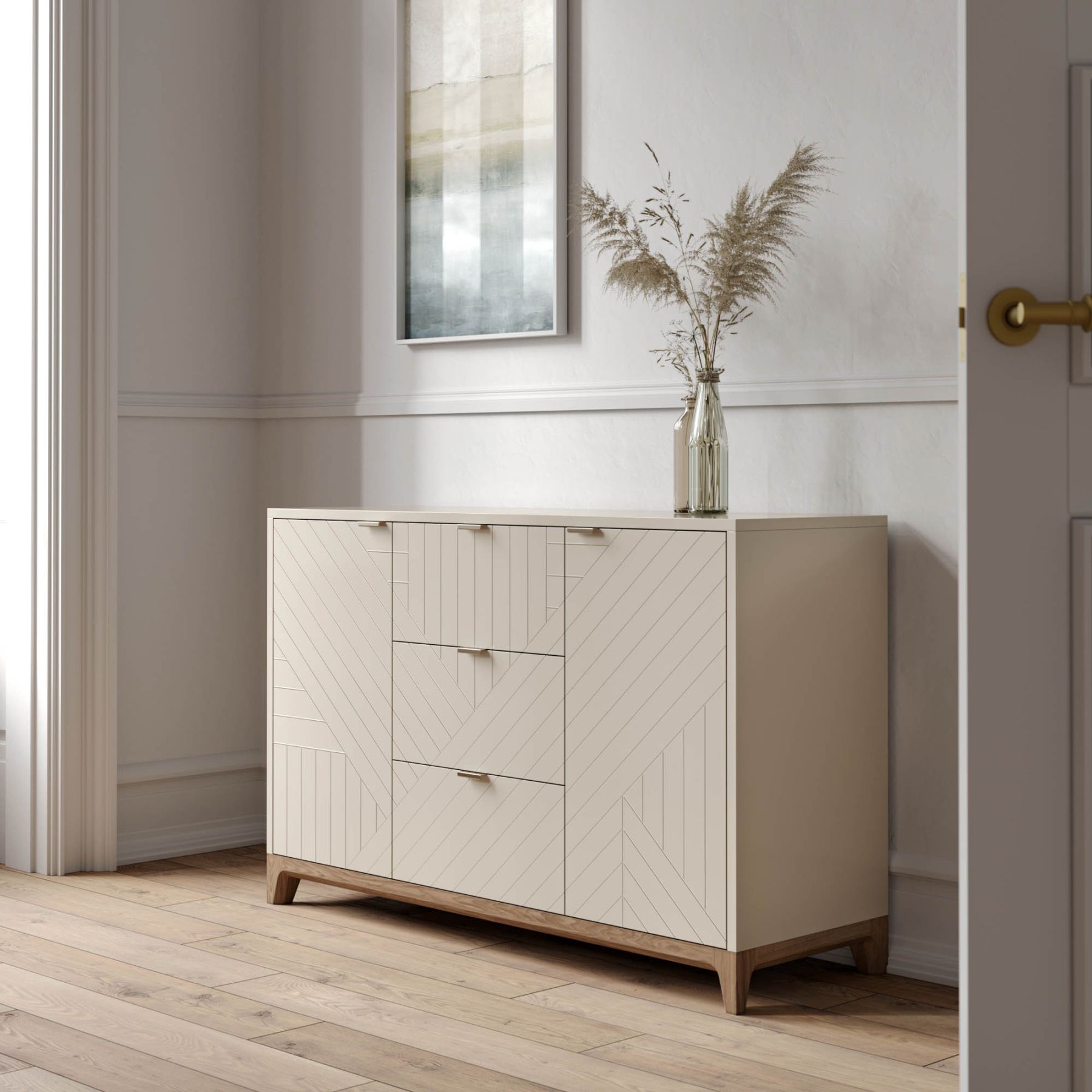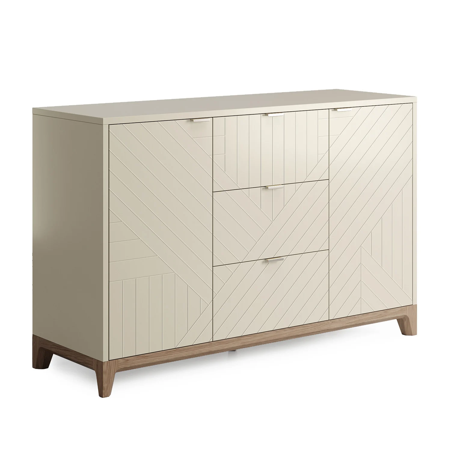 В этом комоде гармонично сочетаются лаконичный дизайн, продуманные габариты и концептуальная гравировка на фасадах. Данная модель оснащена двумя просторными секциями с полками по бокам и тремя выдвижными ящиками по центру. Комод станет удачной находкой для любителей утонченного стиля и функциональной мебели.