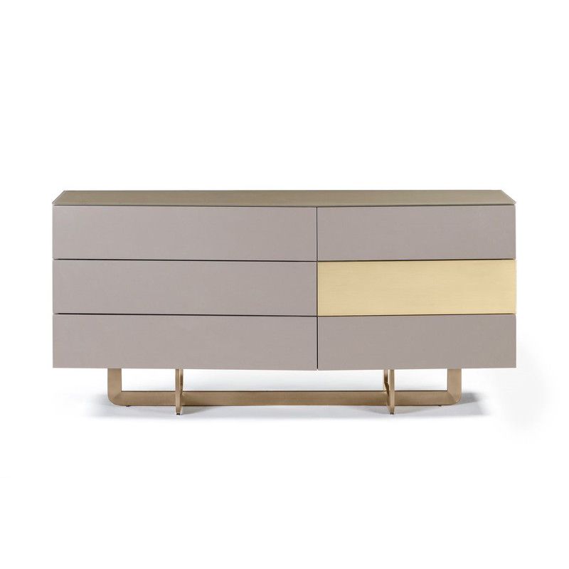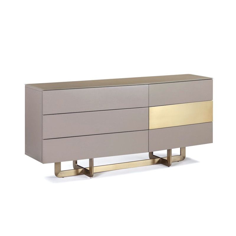 Комод изготовлен из высококачественного МДФ, корпус выполнен в отделке матовым серо-бежевым лаком, ножки и фасад одного ящика выполнены из металла в цвете бронза WJ-09. Столешница выполнена из стекла.