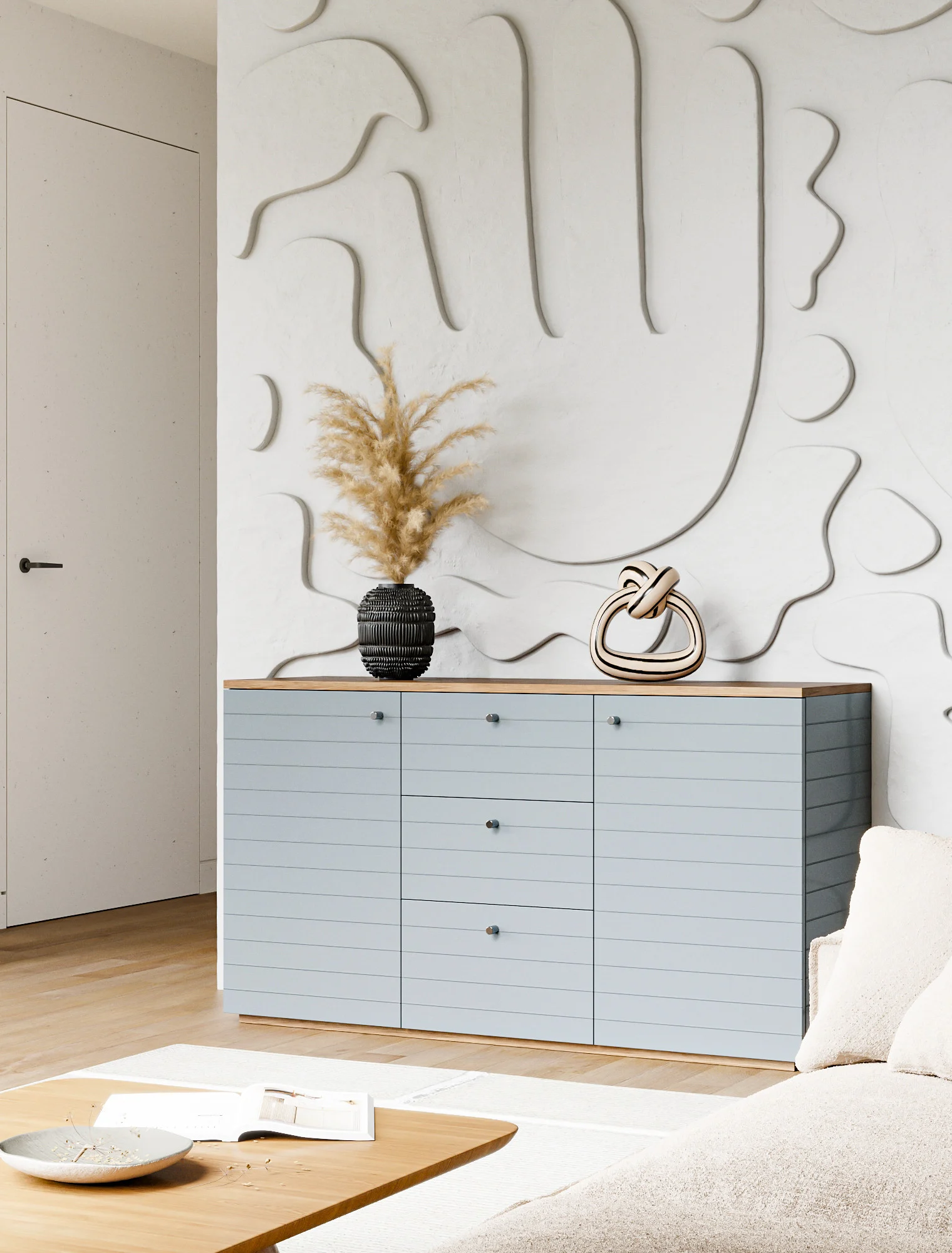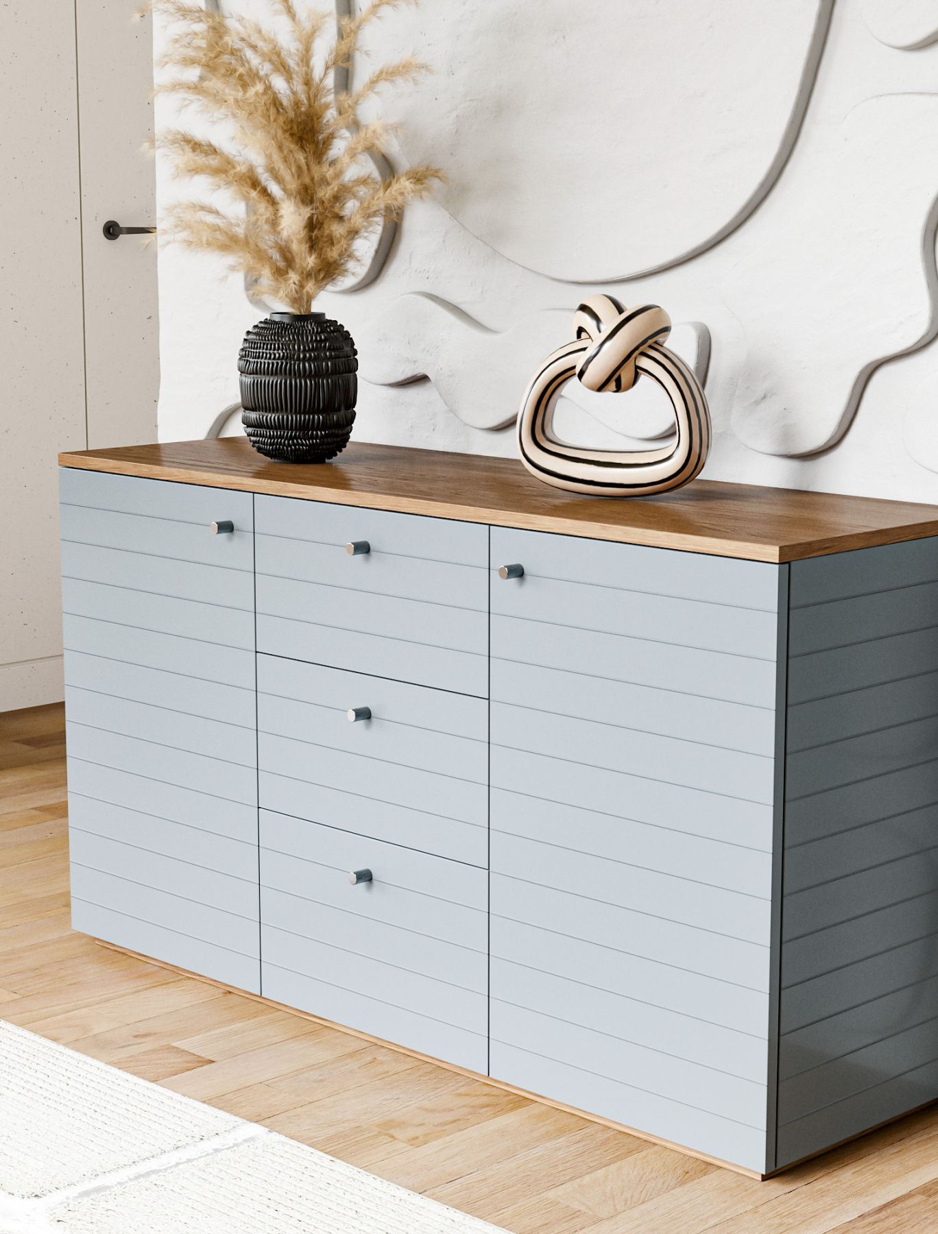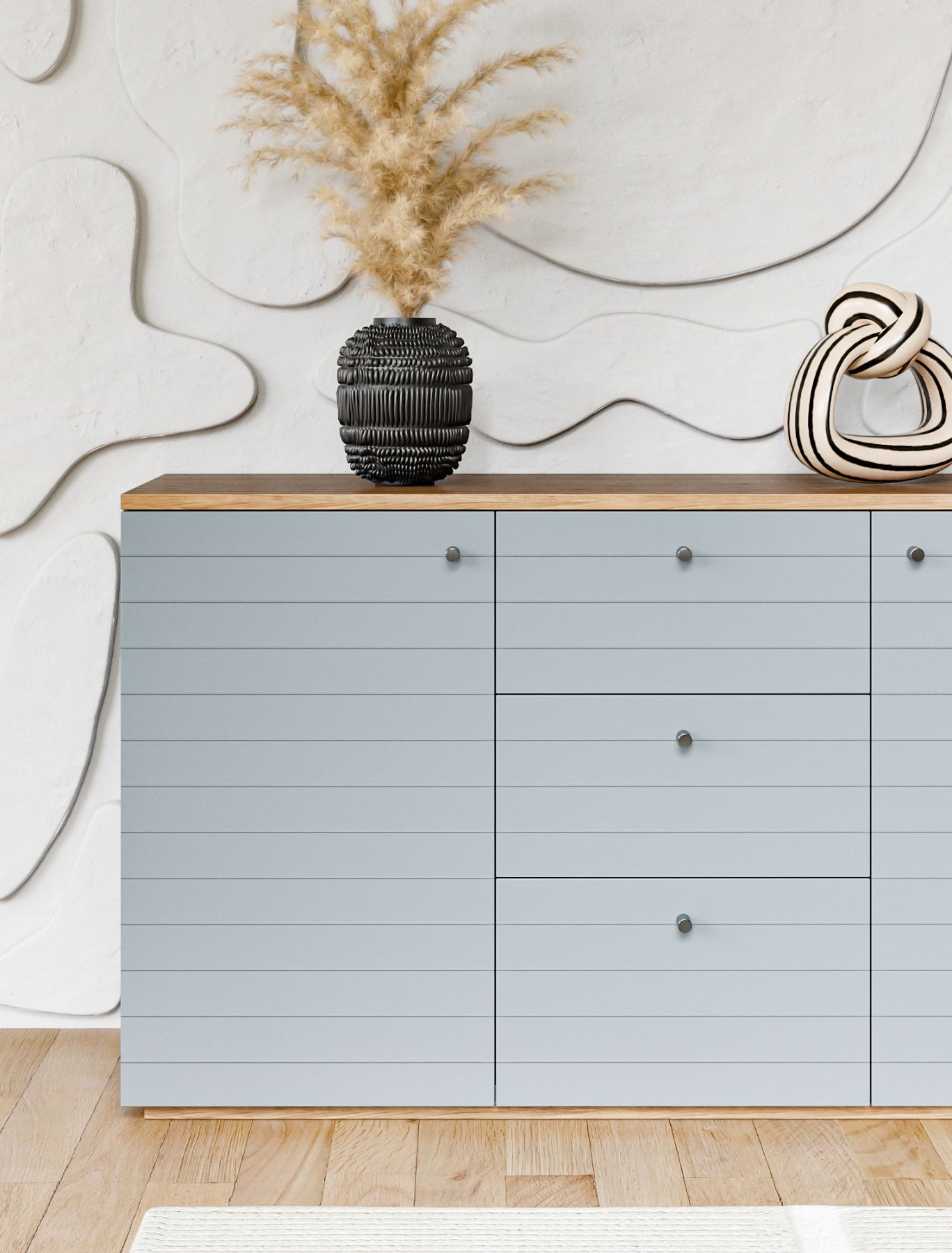 Комод ML043 обладает двумя просторными секциями и тремя выдвижными ящиками, что позволяет удобно хранить большое количество личных вещей. Декоративные узоры, расположенные на фасадах и боковых поверхностях, придают изделию элегантные акценты, подчеркивающие его функциональность.