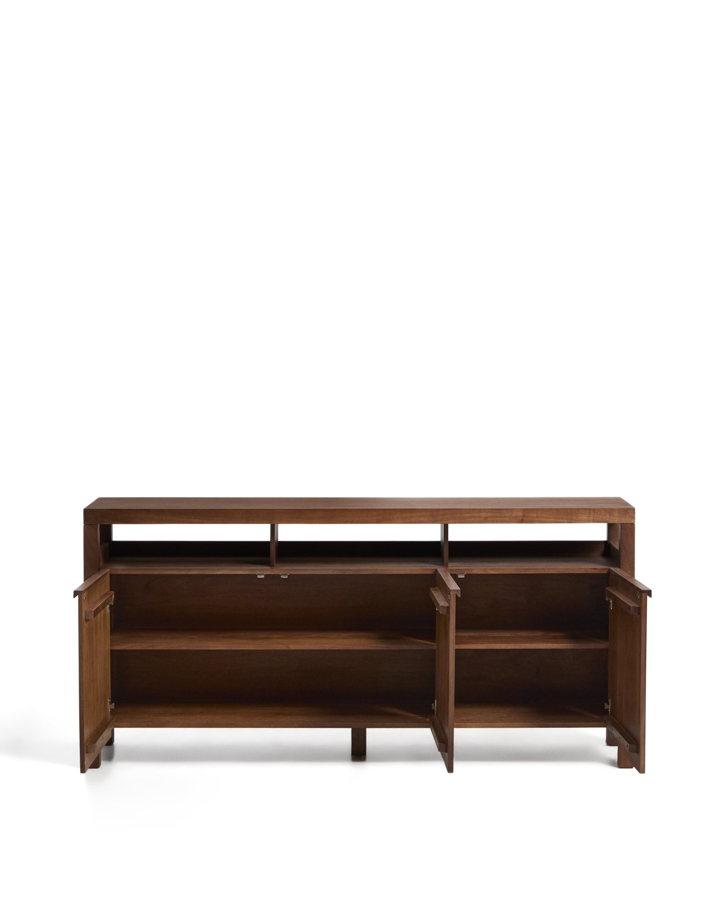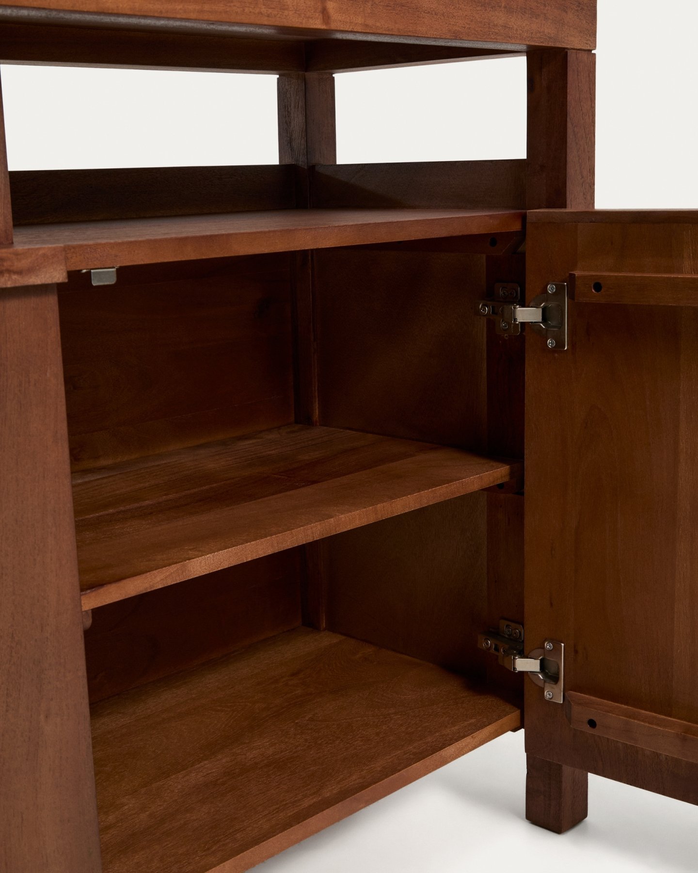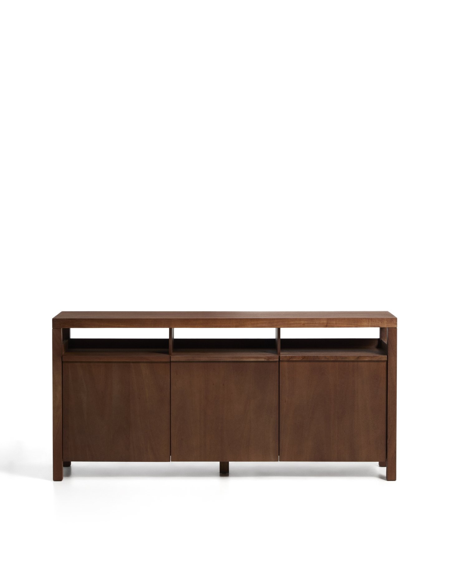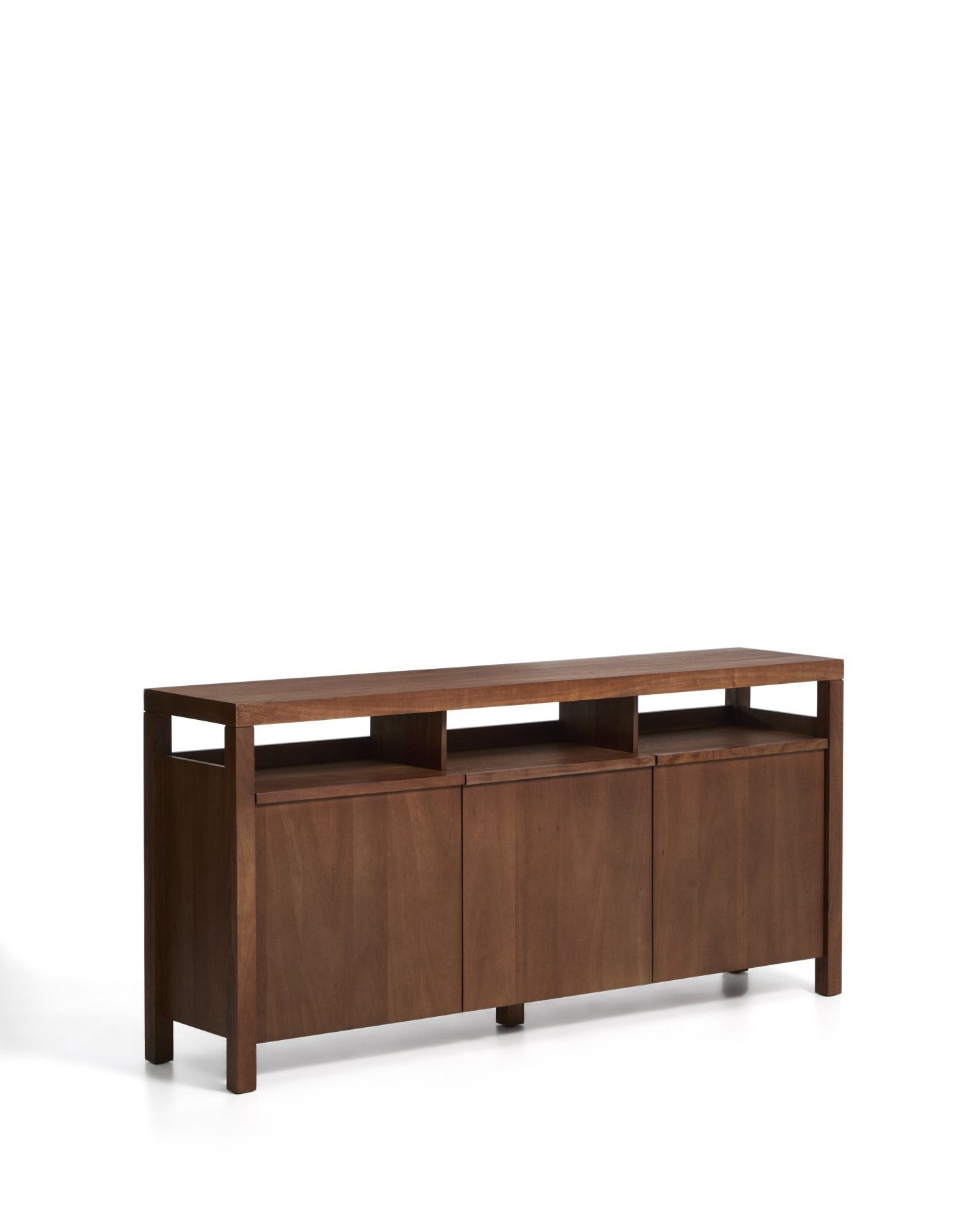 Комод Norani изготовлен из массива акации с матовой отделкой, которая подчеркивает текстуру и вариации материала, придавая ему глубину и сбалансированный вид. Он оснащен дверцами с доводчиками, разработанными для удобства и бесшумного использования, а также для поддержания чистоты и порядка в помещении. Внутреннее пространство обеспечивает функциональную организацию для повседневного хранения. Регулируемые ножки позволяют адаптировать комод к любым неровностям пола, обеспечивая устойчивость и правильное положение.