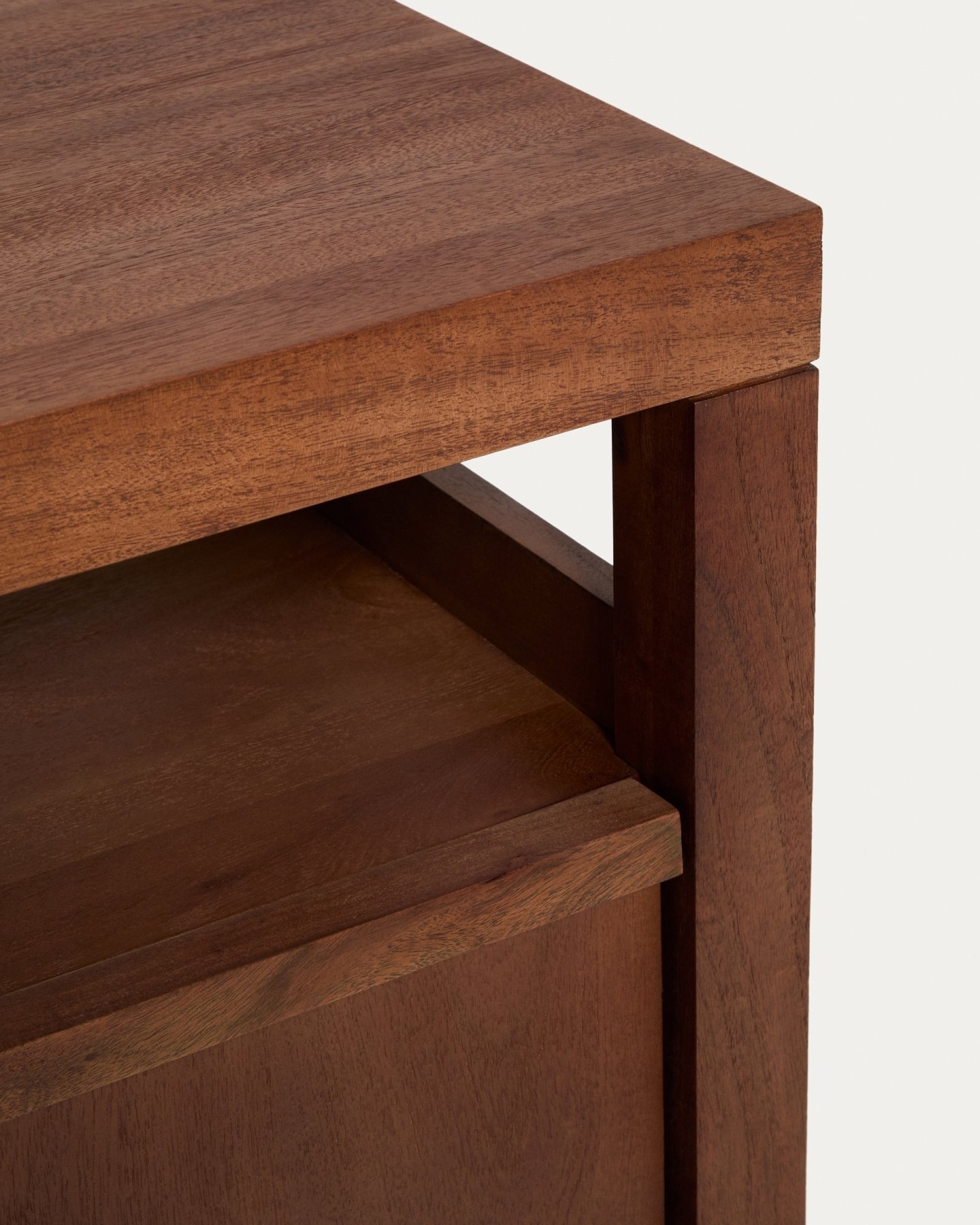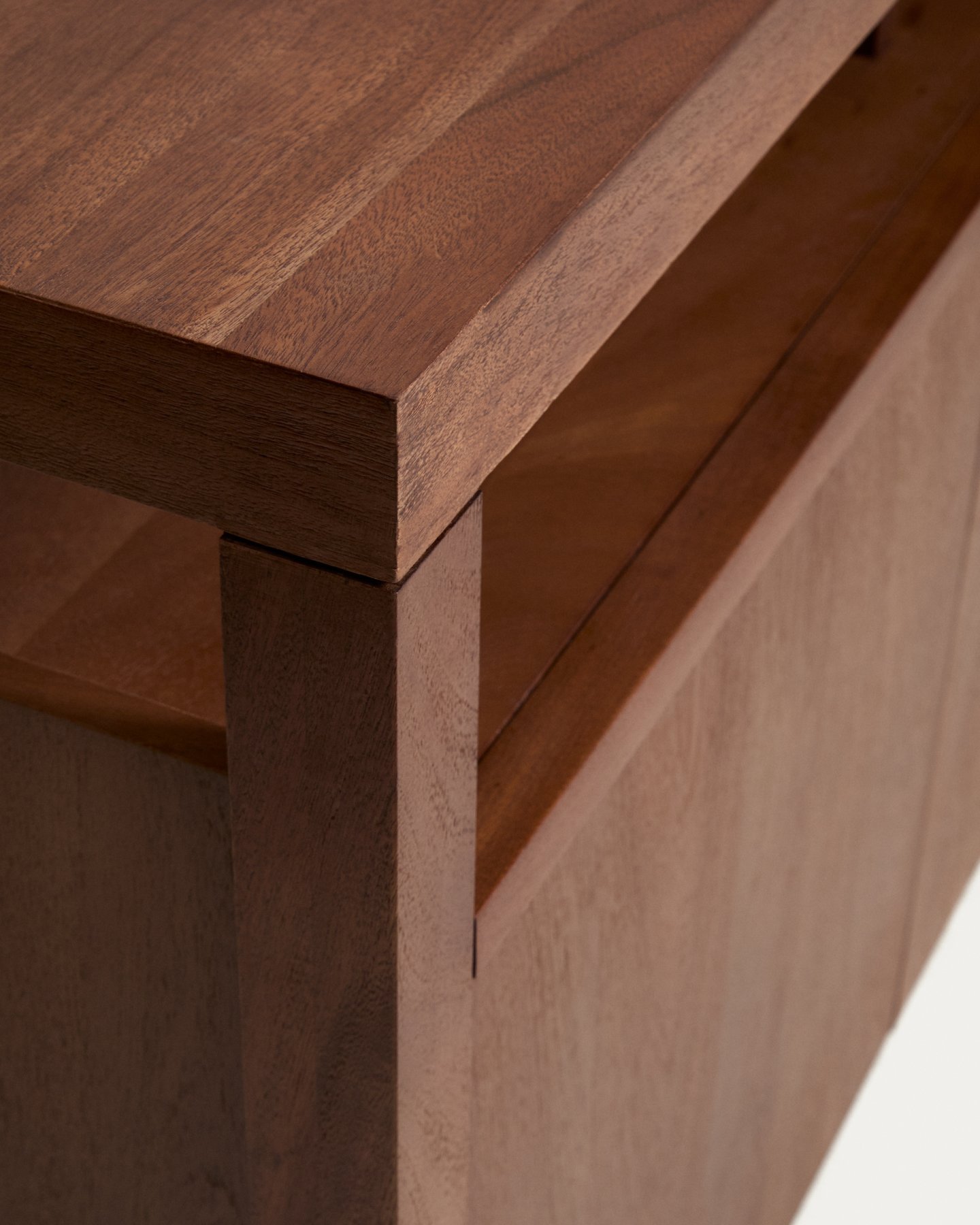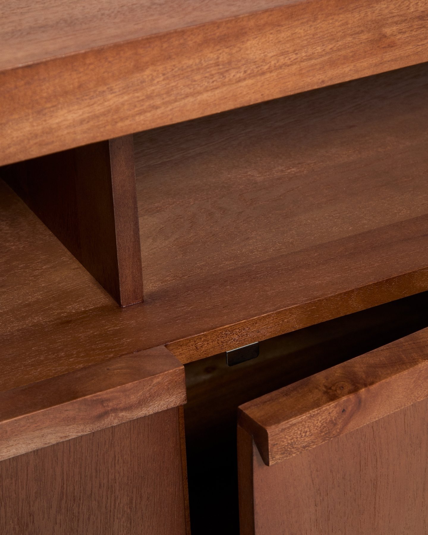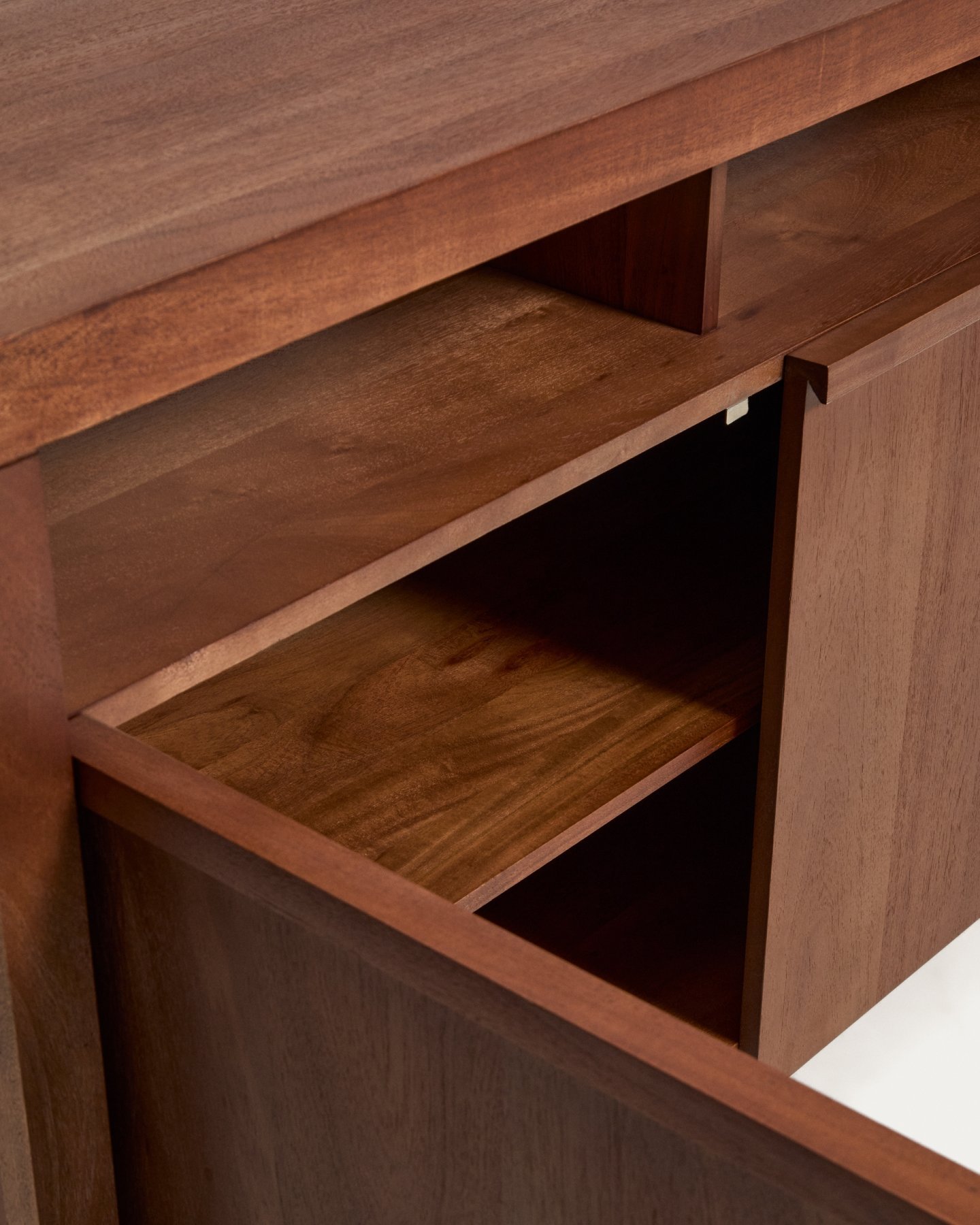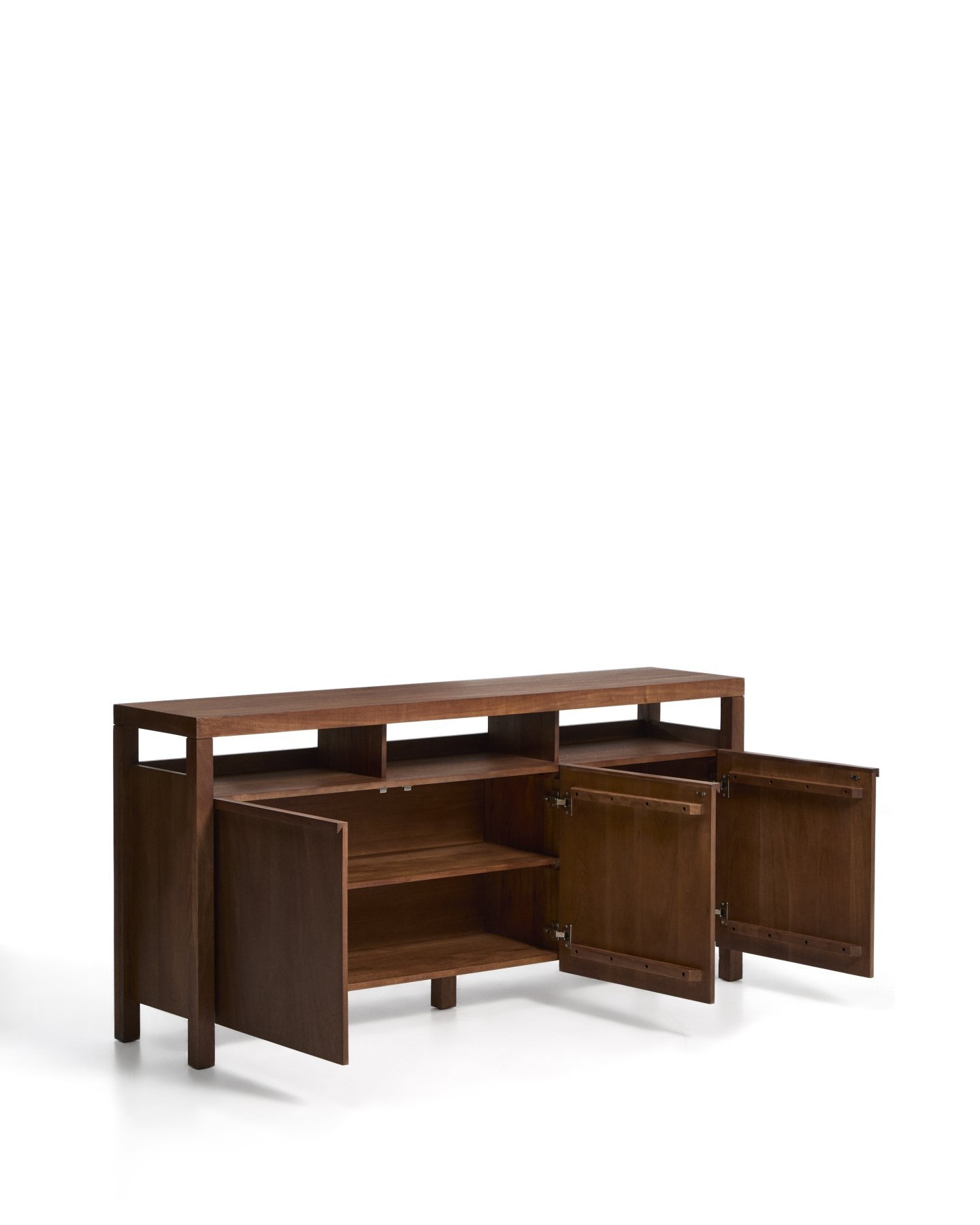 Комод Norani изготовлен из массива акации с матовой отделкой, которая подчеркивает текстуру и вариации материала, придавая ему глубину и сбалансированный вид. Он оснащен дверцами с доводчиками, разработанными для удобства и бесшумного использования, а также для поддержания чистоты и порядка в помещении. Внутреннее пространство обеспечивает функциональную организацию для повседневного хранения. Регулируемые ножки позволяют адаптировать комод к любым неровностям пола, обеспечивая устойчивость и правильное положение.