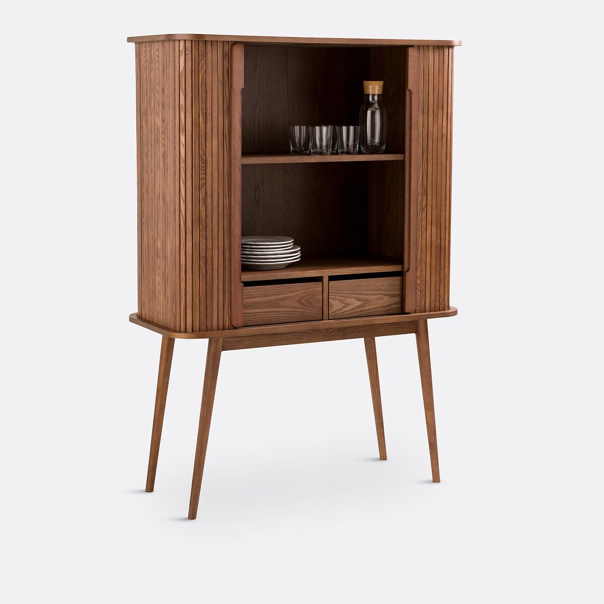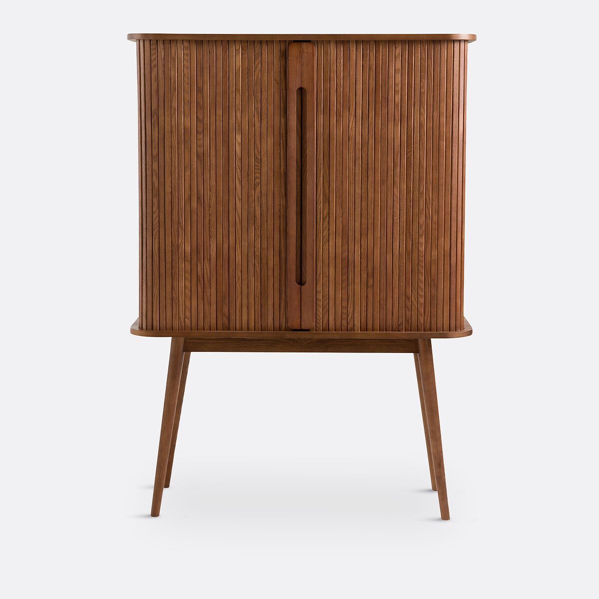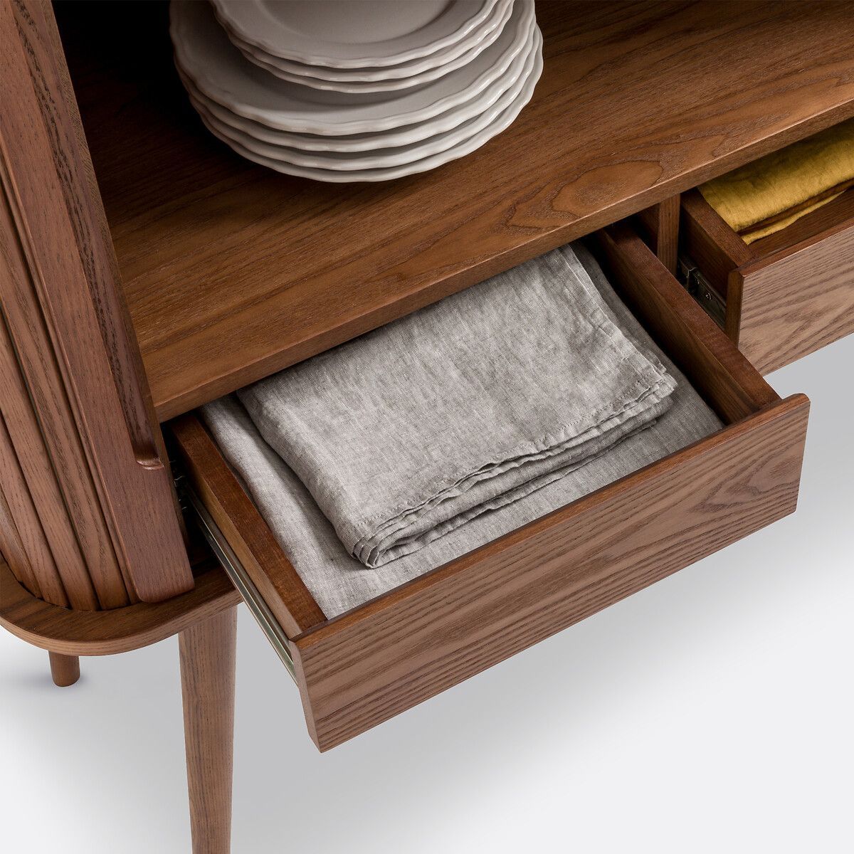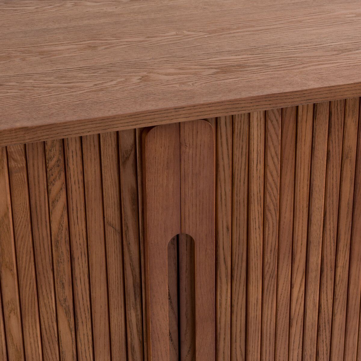 — 2 раздвижные дверки со шторками из массива ясеня с окраской под ореховое дерево, НЦ-лакировка