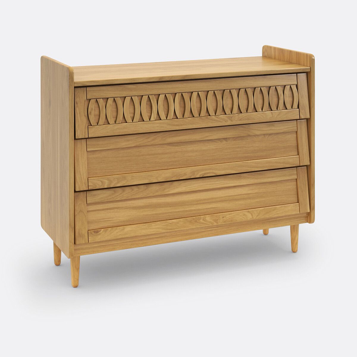 Комод из массива сосны с окраской под дуб в винтажном стиле, распространенном в любых типах интерьера.