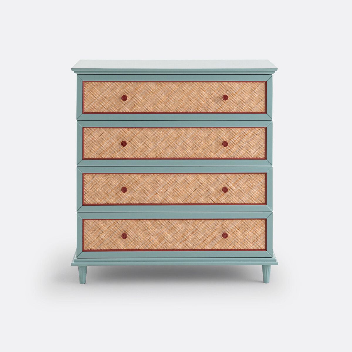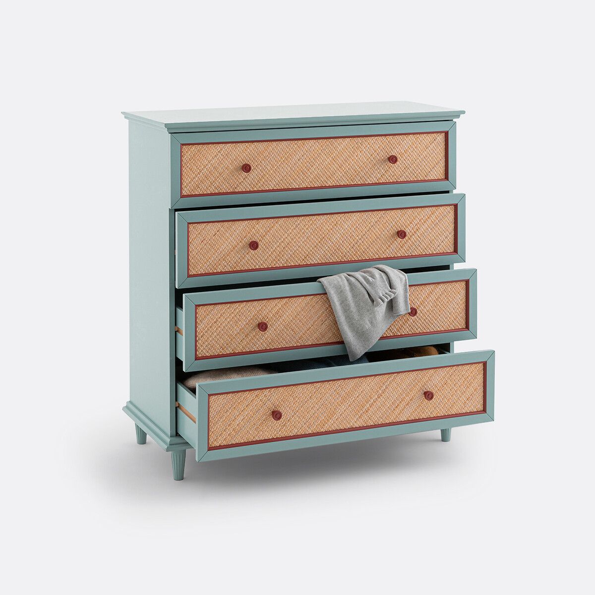 — Фасад ящиков из окрашенной МДФ с акриловым покрытием, из плетеного ротанга и рамки из окрашенного ясеня