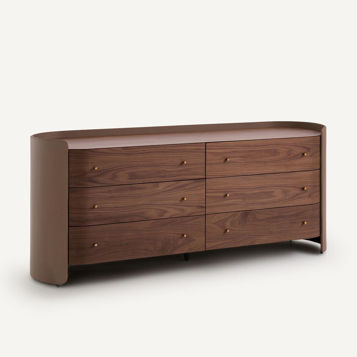 Комод с шестью ящиками из орехового дерева/кожи, Firmo выполнен в стиле 50-х. Мягкая форма комода смягчает его объем. Каркас, обтянутый итальянской кожей, создает элегантный контраст с ящиками из шпона орехового дерева. Мебель из кожи – это настоящий эксклюзив, который редко встречается в российских домах. Такие предметы мебели подчеркивают вкус и делают интерьер утонченным. Текстура кожи визуально и тактильно обогащает интерьер.