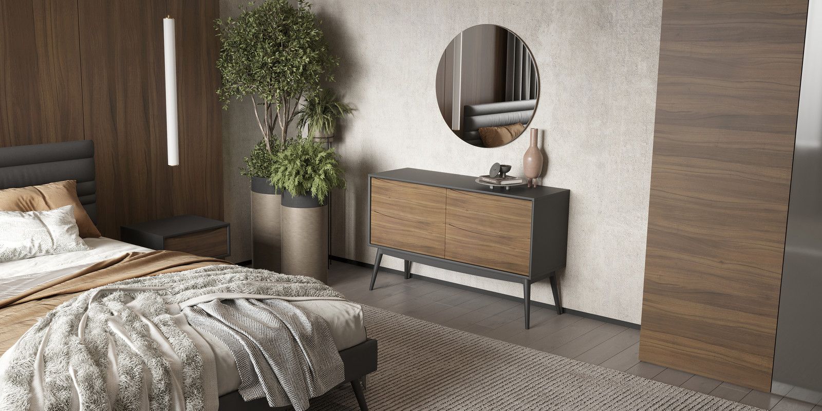 Комод на высоких ножках из коллекции Sevilla от MOD Interiors гармонично сочетает в себе высокую функциональность и уникальный стиль. Изготовлен из шпона американского ореха в комбинации с матовым серым лаком.